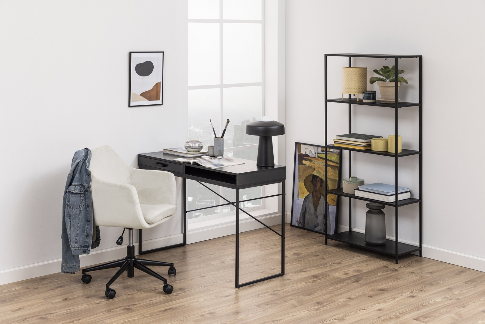 Krzesło obrotowe Nora nawiązuje do najnowszych trendów wnętrzarskich. Siedzisko tapicerowane tkaniną VIC fabric sand A80 w modnym kolorze efektownie komponuje się z pięcioramienną podstawą na kółkach wykonaną z malowanego proszkowo metalu. Krzesło obraca się oraz ma możliwość regulowania wysokości. Wysokość siedziska: 54 cm Szerokość siedziska: 39 cm Głębokość siedziska: 41 cm Wysokość podłokietników: 22,5 cm Wymiary: 58x58x91cm Waga krzesła: 9kg