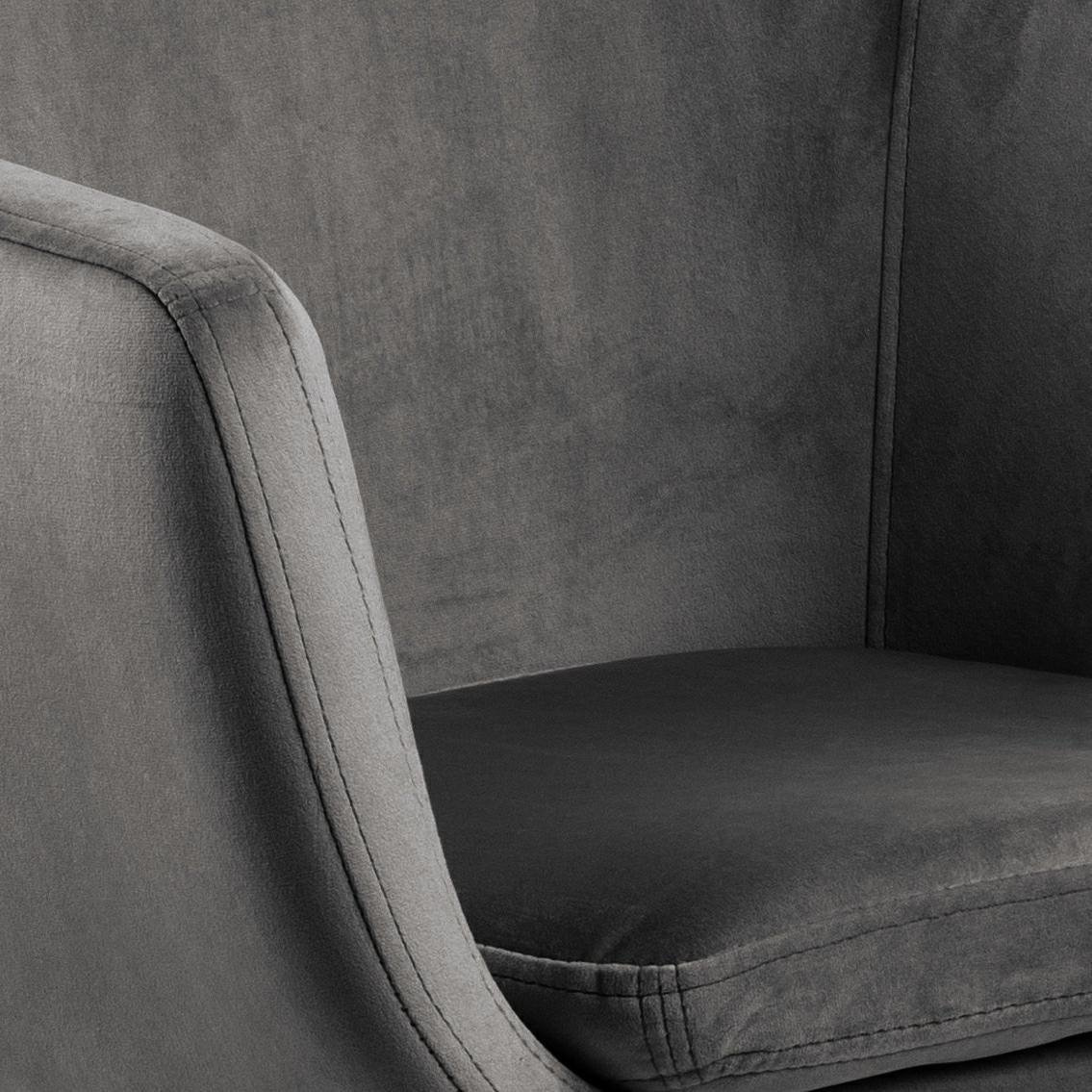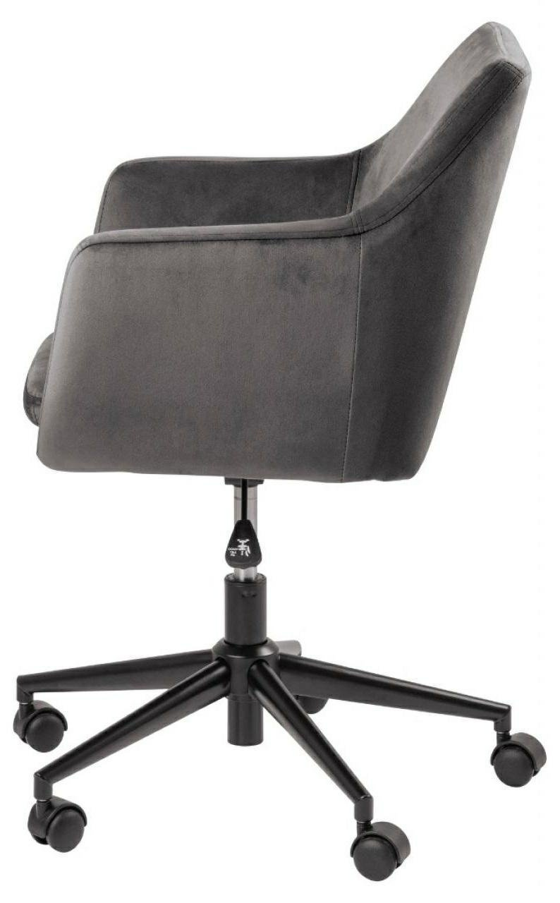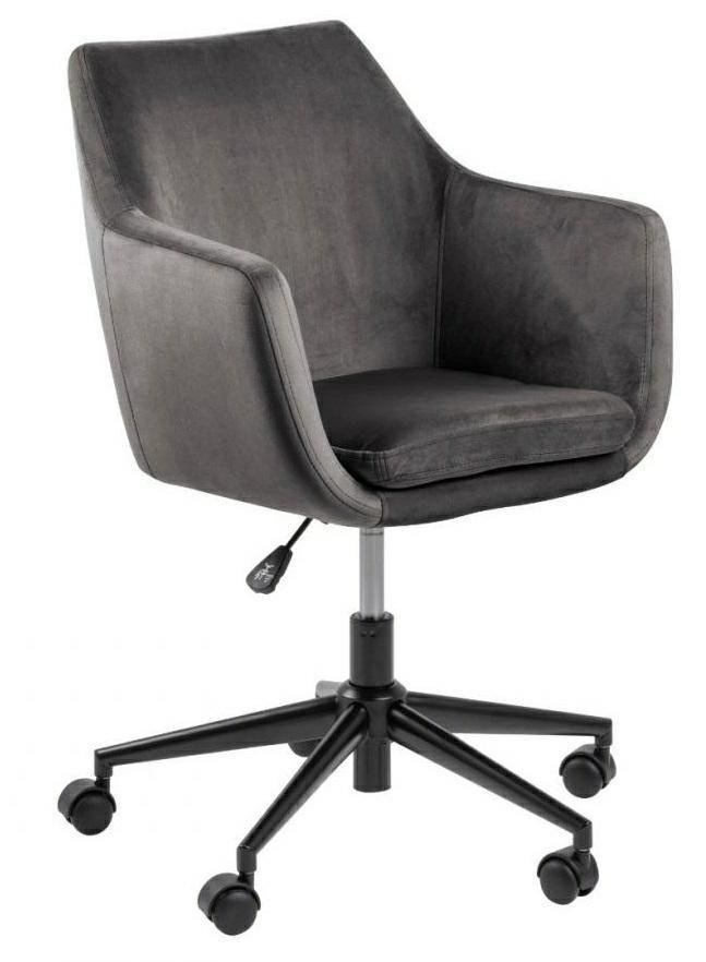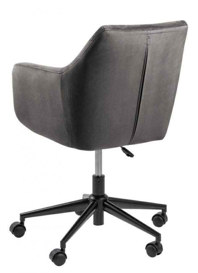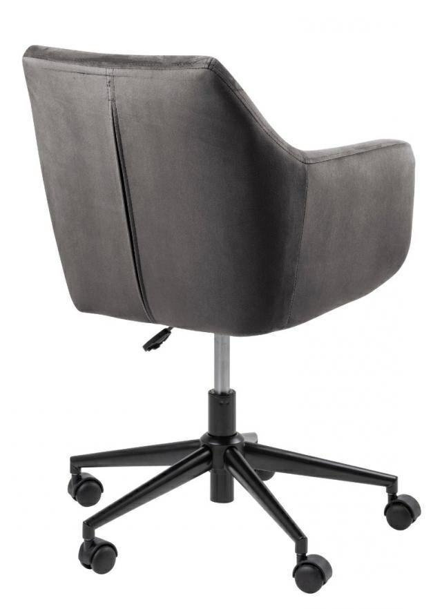 Fotel biurowy na kółkach Nora to stylowy fotel tapicerowany welurową tkaniną VIC dark grey 28. Niezwykle popularny trend pomkazuje, że tkaniny welurowe prezentują się niesamowicie zarówno na meblach wypoczynkowych jak i biurowych. Siedzisko wyłożone wysokoelastyczną gąbką, tapicerowane tkaniną VIC, posiada zdejmowaną poduszkę. Metalowa podstawa na kółkach pomalowana została na kolor czarny. Kółka wykonane zostały z tworzywa. Fotel jest obrotowy, dodatkowo posiada możliwość regulacji wysokości siedziska o 10cm (Przedział wysokości siedziska od 44 do 54 cm). Fotel waży 11,9kg, wymaga montażu. Maksymalne obciążenie wynosi 120kg. Szerokość siedzika: 39 cm, Głębokość siedziska: 41 cm, Wysokość podłokietników od siedziska 22,5 cm Wysokość oparcia od siedziska: 35 cm Max. ilość sztuk w pudełku: 1 Wymiary kartonu: 58cm x 51cm x 63cmCechy produktu