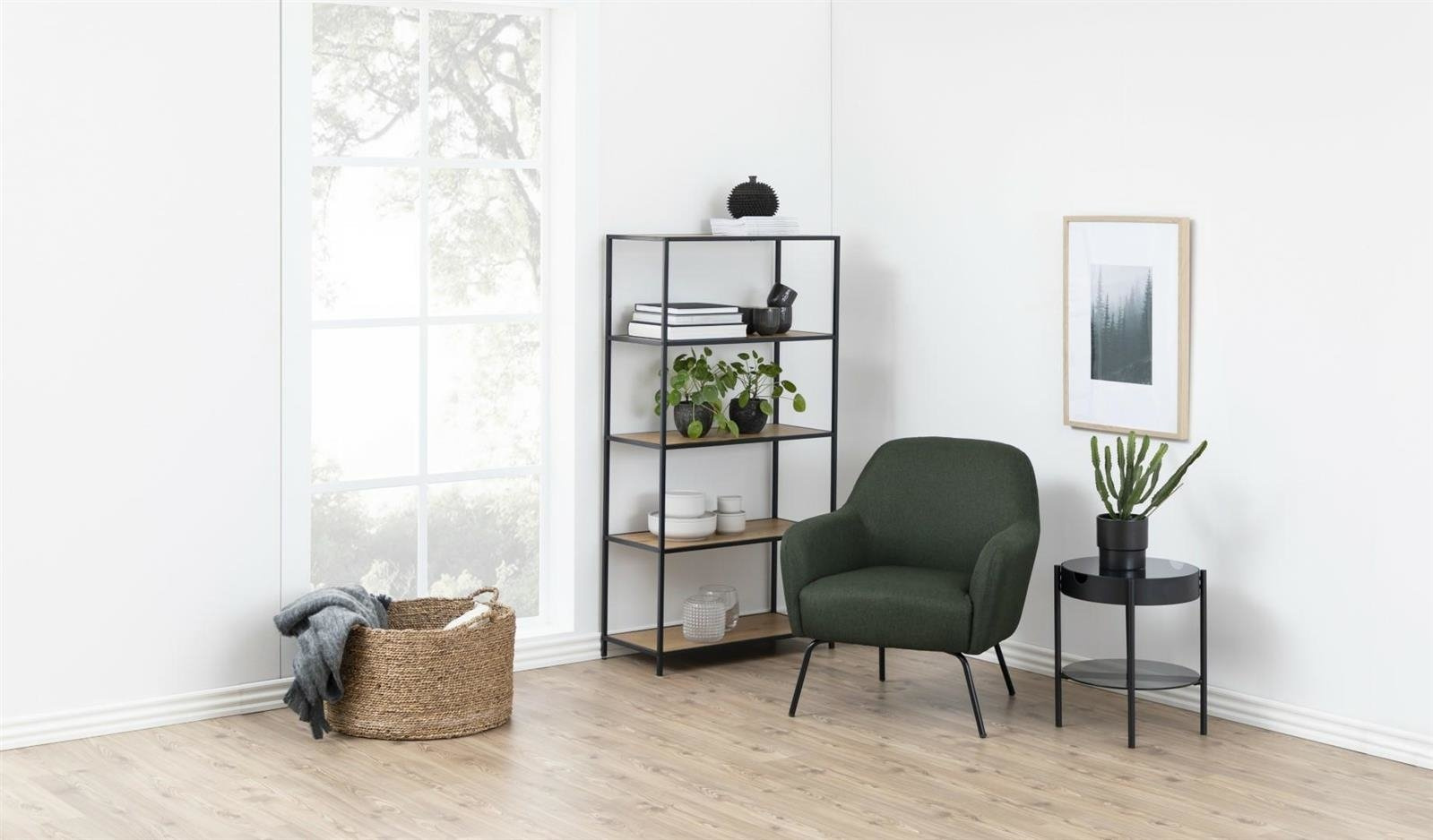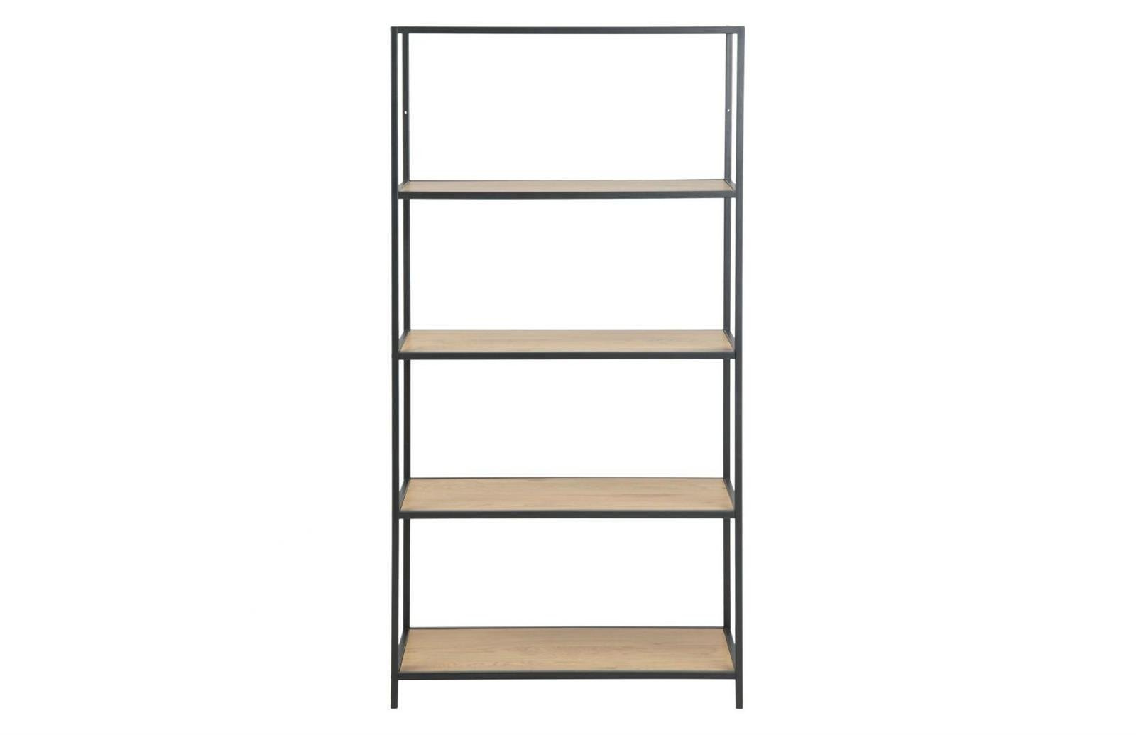 Regał Seaford został zrobiony z wytrzymałego metalowego szkieletu oraz czterech półek z MDF oklejonych okleiną. Metalowa konstrukcja została pomalowana proszkowo na czarno. Jej matowe wykończenie nadaje całości elegancji. Okleina na półkach idealnie imituje strukturę drewna dębu. Regał stoi na niewysokich nóżkach. Waga: 15,6 kg. Wymiary kartonu: 10,5cm x 154,5cm x 38,5cmCechy produktu