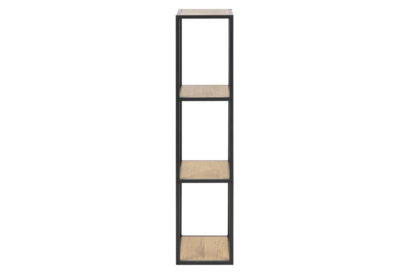 Regał Seaford został zrobiony z wytrzymałego metalowego szkieletu oraz czterech półek z MDF oklejonych okleiną. Metalowa konstrukcja została pomalowana proszkowo na czarno. Jej matowe wykończenie nadaje całości elegancji. Okleina na półkach idealnie imituje strukturę drewna dębu. Waga: 5,8 kg. Wymiary kartonu: 9,5cm x 113cm x 26,5cmCechy produktu