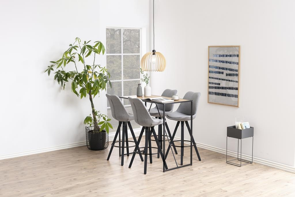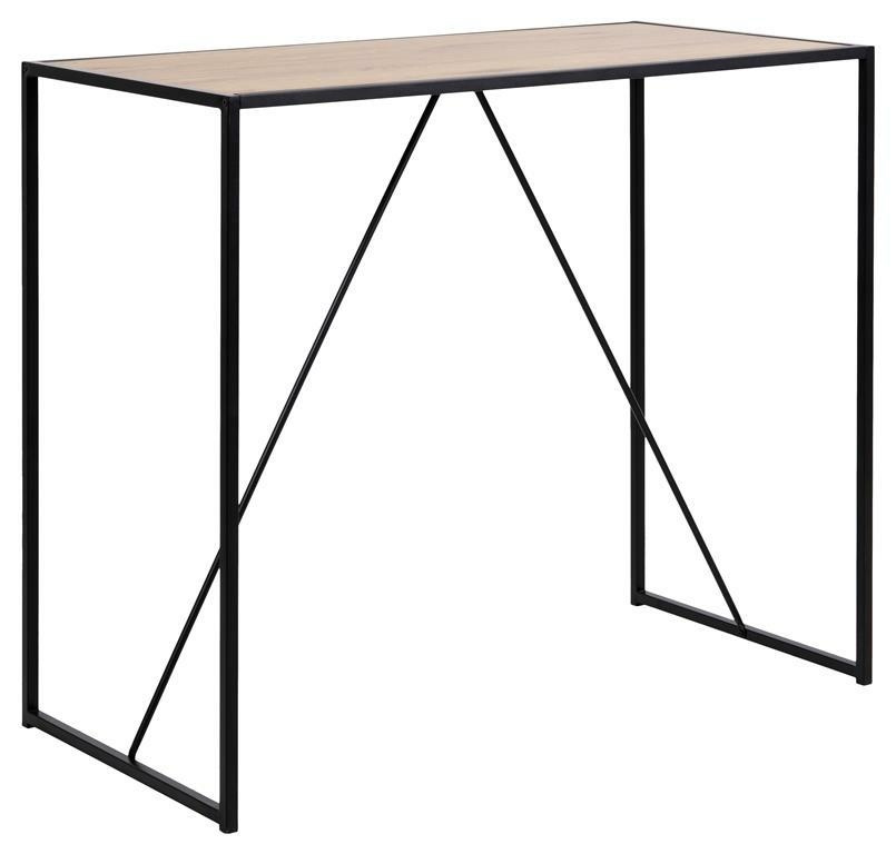 Stół barowy Seaford sprawdzi się świetnie w minimalistycznych wnętrzach. Szkielet mebla został wykonany z malowanego proszkowo metalu, zaś blat to płyta w okleinie imitującej dąb.Pod blatem znajdują się dwa ułożone pod kątem elementy, które oprócz roli dekoracyjnej dodatkowo stabilizują podstawę. Stół nada się do kuchni bądź jadalni, a także do przestrzeni publicznych takich jak bary czy restauracje. Ilość kartonów: 1 Wymiary kartonów: 121x62,5x7,5cm Waga kartonów: 14,2kgCechy produktu
