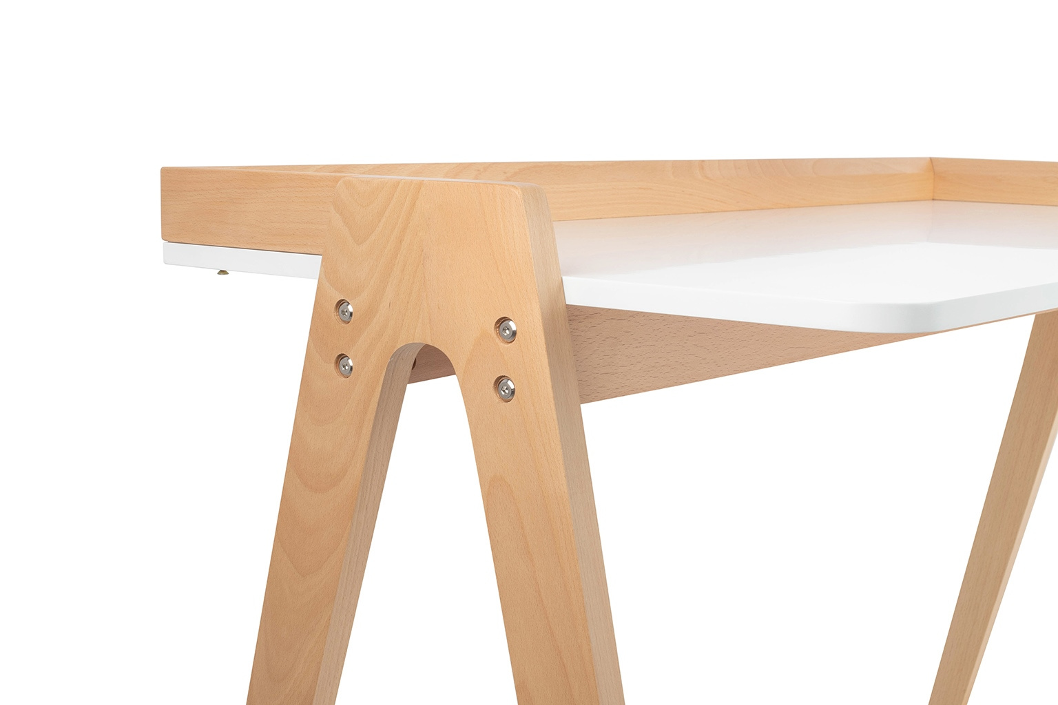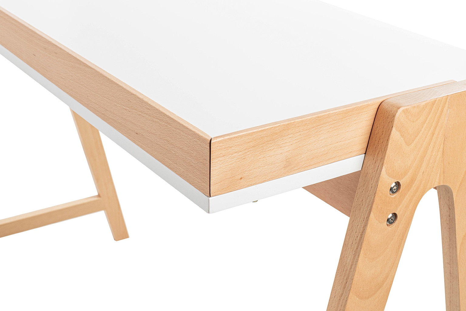 - Biurko COMPAS białe Blat biurka wykonany został z płyty meblowej malowanej na kolor biały, natomiast nogi biurka wykonane są z drewna bukowego. Jeśli zatem marzy Wam się sprzyjające skupieniu miejsce do pracy lub nauki, a równocześnie dyskretnie piękny me