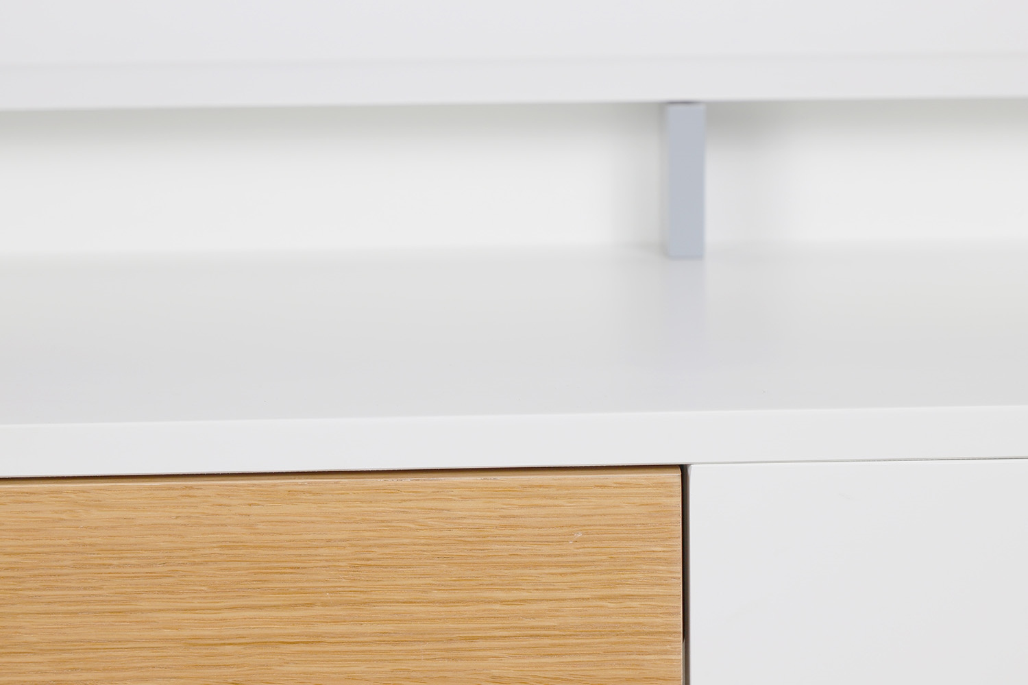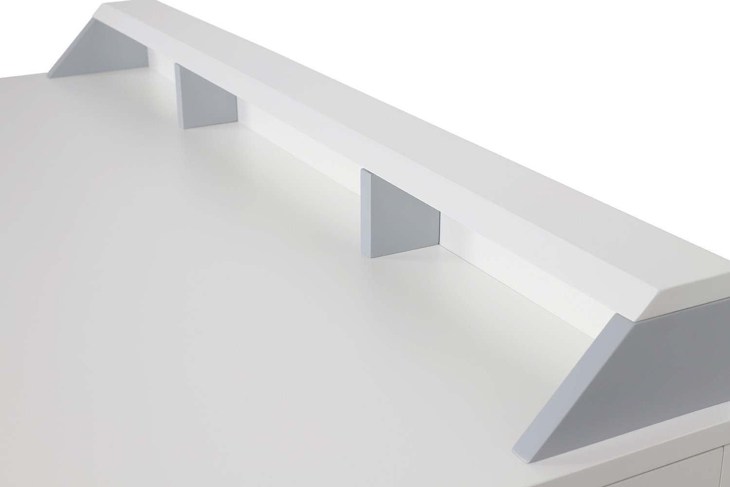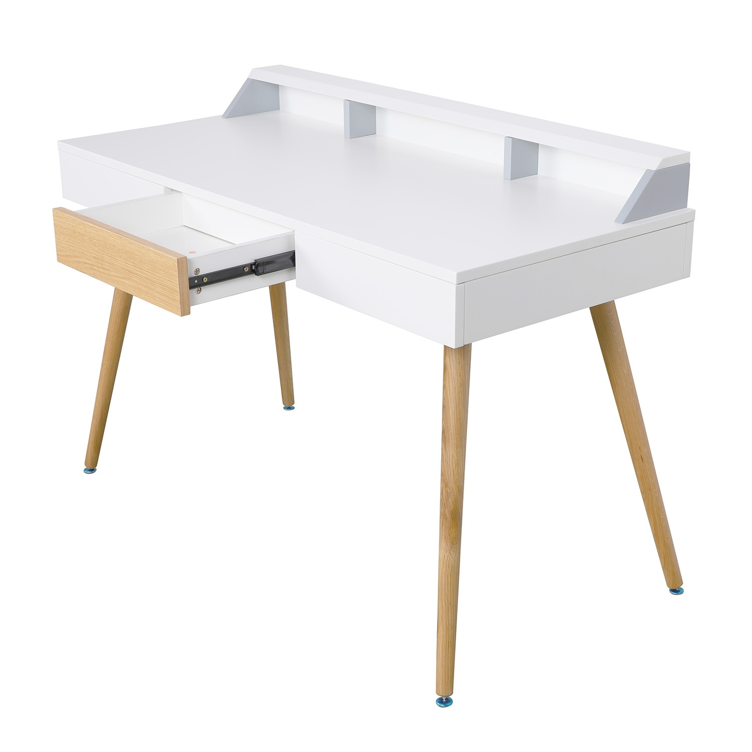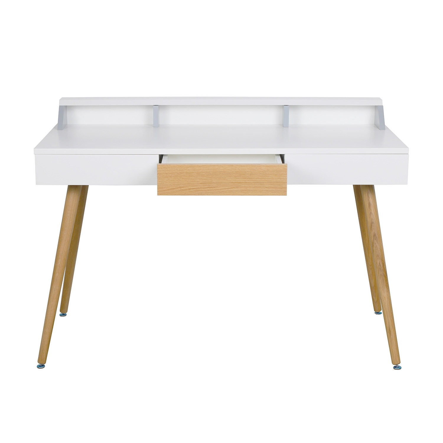 Biurko Skans to miejsce do pracy nie tylko w biurze, ale również w domowym zaciszu. Biurko z białym blatem i drewnianymi nogami oprócz swojej roli roboczego blatu będzie również ozdobą domowego biura. Podstawą biurka są cztery bukowe, polakierowane nogi, które delikatnie rozchodzą się na boki, nawiązując do stylu vintage. Biały szeroki blat zrobiony został z laminowanej płyty MDF, dzięki czemu jest niezwykle wytrzymały. Biurko posiada niskie ścianki o wysokości 9,5cm, które tworzą swoiste miejsce do segregowania biurowych akcesoriów. Ścianki pomagają utrzymać porządek na biurku. Ciekawym kontrastowym elementem biurka jest szuflada z frontem o wysokości 11 cm w okleinie imitującej naturalne drewno. Szuflada dzięki zastosowaniu wysokiej jakości szyn otwiera się bardzo delikatnie. Wysokość ścianki: 9,5 cm Gł. przegródek: 7 cm. Gł. wewnątrz szuflady: 23,5 cm Szer. wewnątrz szuflady: 35 cm Szer. przegródki środkowa: 45 cm, zewnętrzne: 31,5 cm Rozstaw nóg: 125 cmCechy produktu