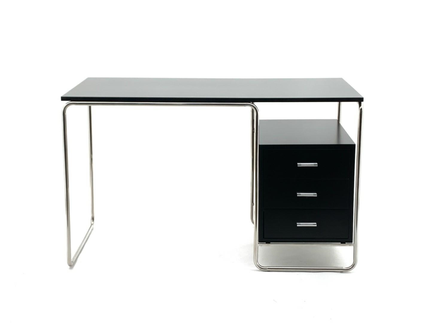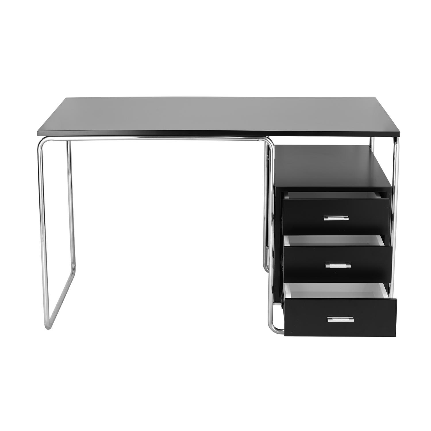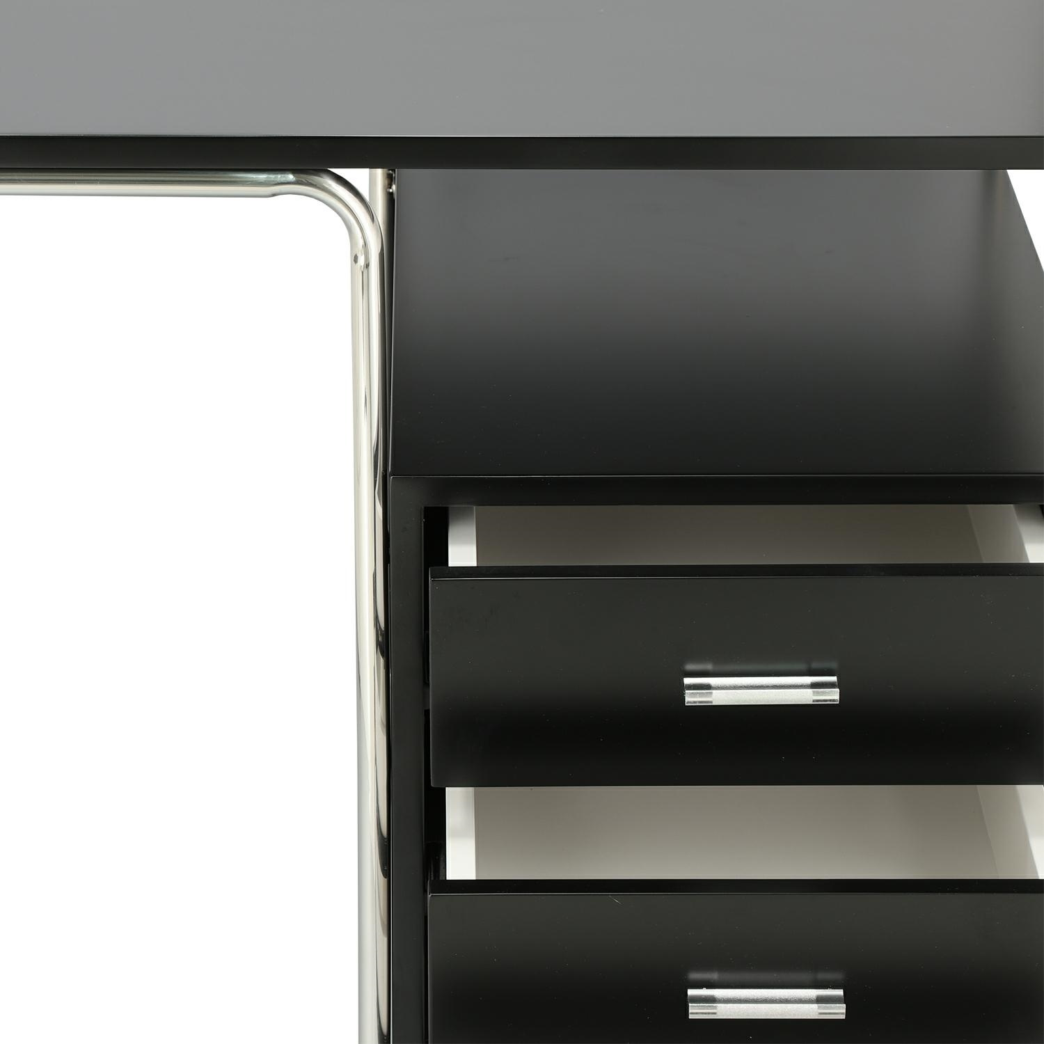 Nowoczesne biurko Thon to wyrafinowana elegancja i prostota. Oszczędna forma w stylu mid-century sprawia, że jest uniwersalny i ponadczasowy. Inaczej mówiąc: dobrze łączy się z innymi stylami i jest zawsze na miejscu. Kolejny powód to rzemieślniczy proces produkcji biurka oraz świetnej jakości materiały, z jakich je wykonywano. Biurko Thon będzie idealnym biurkiem do gabinetu, biurkiem do biura, jak i biurkiem do pokoju młodzieżowego. Blat biurka usytuowany został na chromowanej, metalowej, stylowej podstawie, która nadaje całości uroku i charakteru. Blat oraz fronty szuflad zostały zrobione z płyty MDF, pokrytej laminatem w kolorze czarnym. Całość wykończona została w wysokim połysku. Biurko zostało wyposażone w trzy pojemne szuflady. Chromowane uchwyty szuflad dodają elegancji. Wymiary szafki: 39cm x 42cm x 74cm Wymiary frontu szuflady: 12,5cm x 41,5 cmCechy produktu