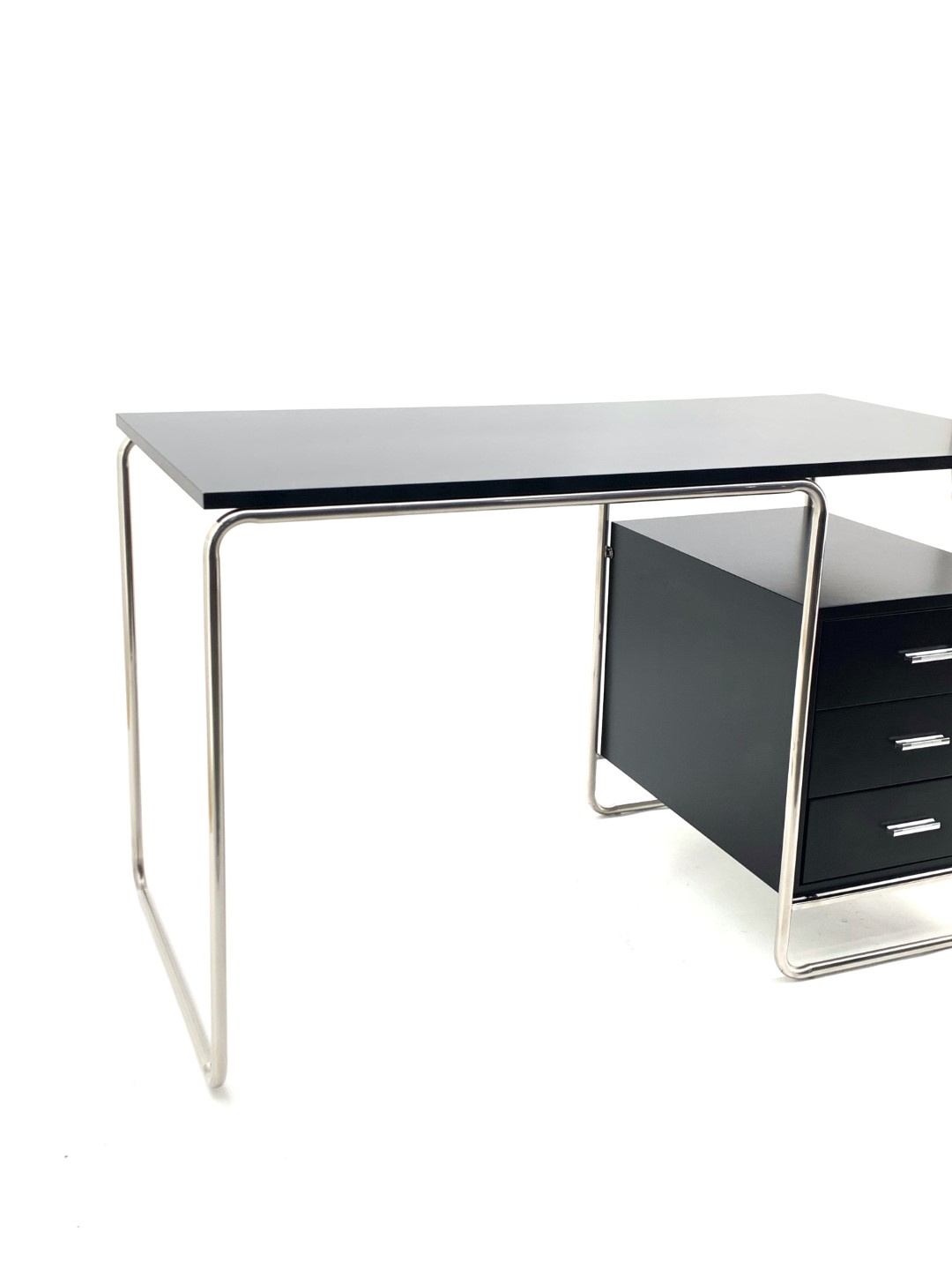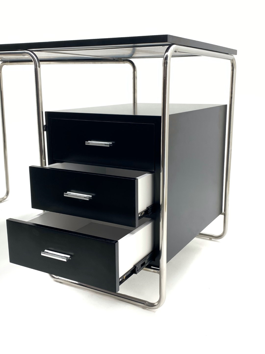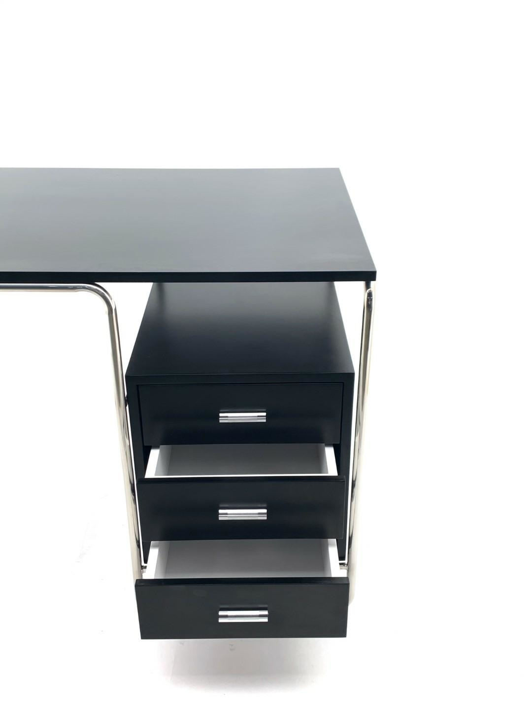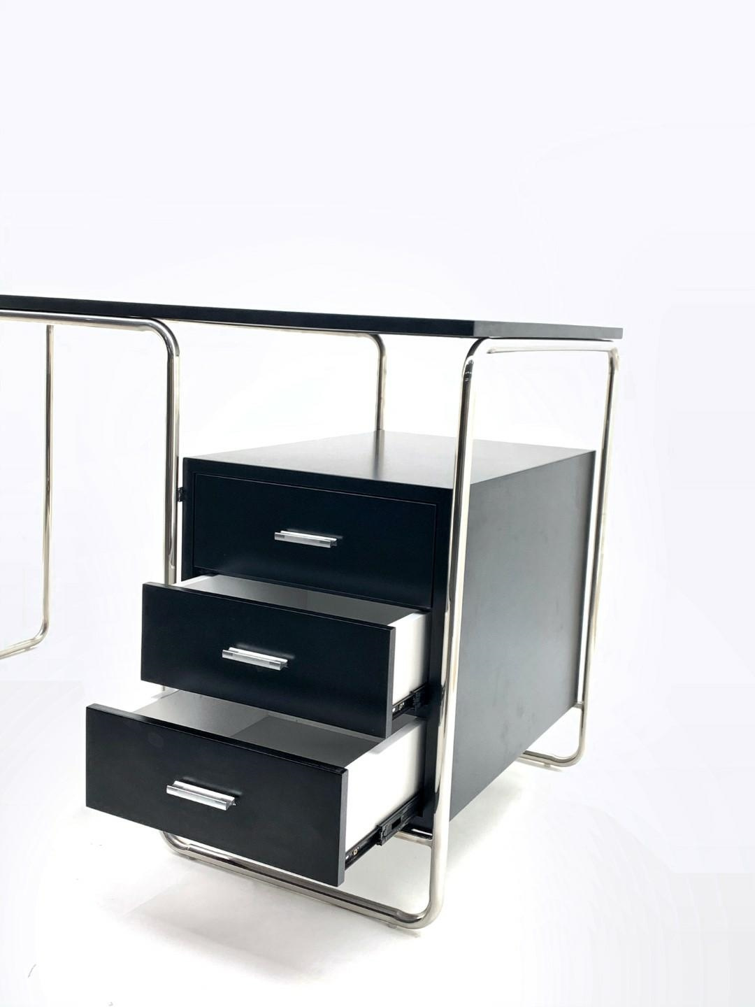 Nowoczesne biurko Thon to wyrafinowana elegancja i prostota. Oszczędna forma w stylu mid-century sprawia, że jest uniwersalny i ponadczasowy. Inaczej mówiąc: dobrze łączy się z innymi stylami i jest zawsze na miejscu. Kolejny powód to rzemieślniczy proces produkcji biurka oraz świetnej jakości materiały, z jakich je wykonywano. Biurko Thon będzie idealnym biurkiem do gabinetu, biurkiem do biura, jak i biurkiem do pokoju młodzieżowego. Blat biurka usytuowany został na chromowanej, metalowej, stylowej podstawie, która nadaje całości uroku i charakteru. Blat oraz fronty szuflad zostały zrobione z płyty MDF, pokrytej laminatem w kolorze czarnym. Całość wykończona została w wysokim połysku. Biurko zostało wyposażone w trzy pojemne szuflady. Chromowane uchwyty szuflad dodają elegancji. Wymiary szafki: 39cm x 42cm x 74cm Wymiary frontu szuflady: 12,5cm x 41,5 cmCechy produktu