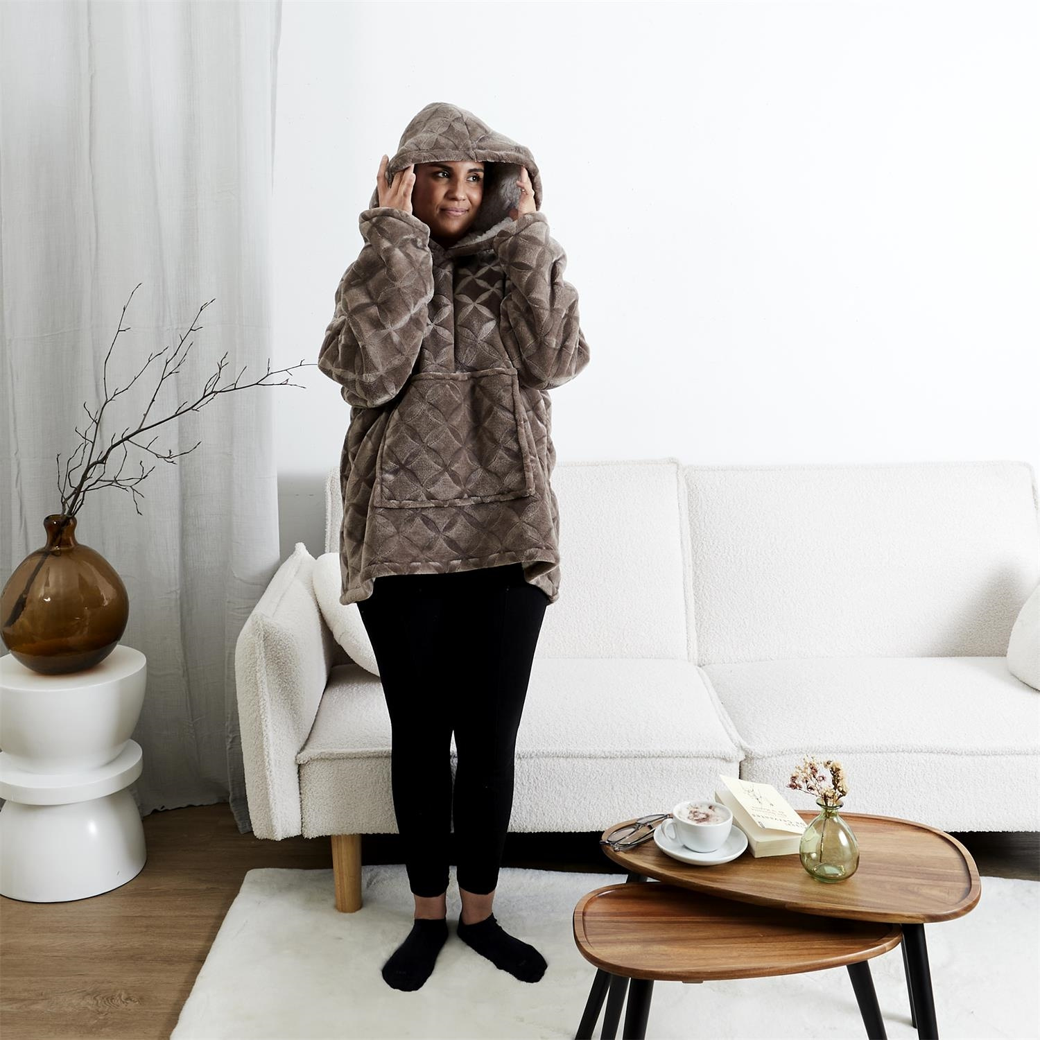 Długa bluza sherpa to idealne nakrycie na długie, zimowe wieczory. Bluza snuddie wyposażona została w kaptur oraz kieszeń z przodu. Bardzo miły i ciepły w dotyku materiał gwarantuje długie komfortowe wieczory filmowe. Prać w temp max 30 stopni. Nie prasować. Gramatura tkaniny 240g/m2 tkanina 100% poliesterCechy produktu