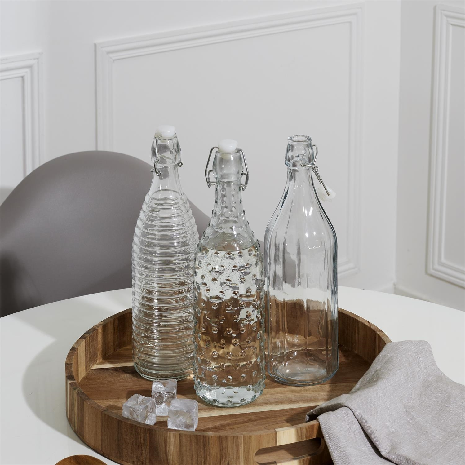 Szklana, ozdobna butelka sprawdzi się jako pojemnik na sok, ocet lub oliwę. Butelka występuje w trzech wzorach szkła. Pojemnośc butelki 1 litr. Zamykana ona jest korkiem z tworzywa oraz metalową klamrą. Można myć w zmywarce, Nie można używać w mikrofalówce Nadaje się do kontaktu z żywnością.
