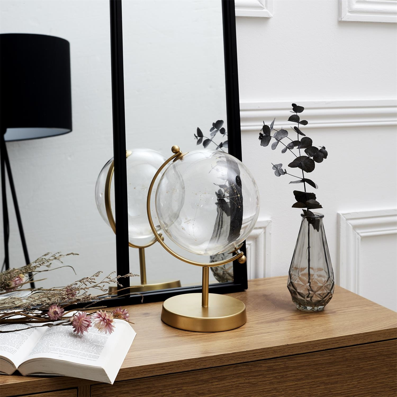 - Dekoracja szklana z metalową podstawą to idealny element dekoracji salonu lub biura. Globus to ponadczasowy przedmiot, a dodatkowo nietypowy print z konstelacją gwiazd nadaje mu nietypowego wyglądu. Materiał: szkło, metal Wymiary kartonu: 21x21x26cm