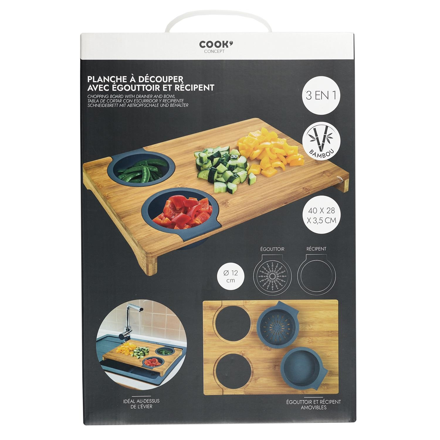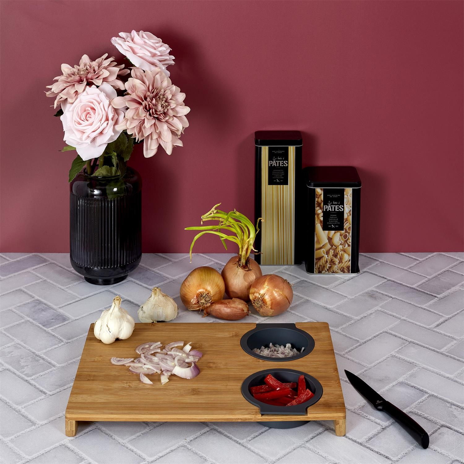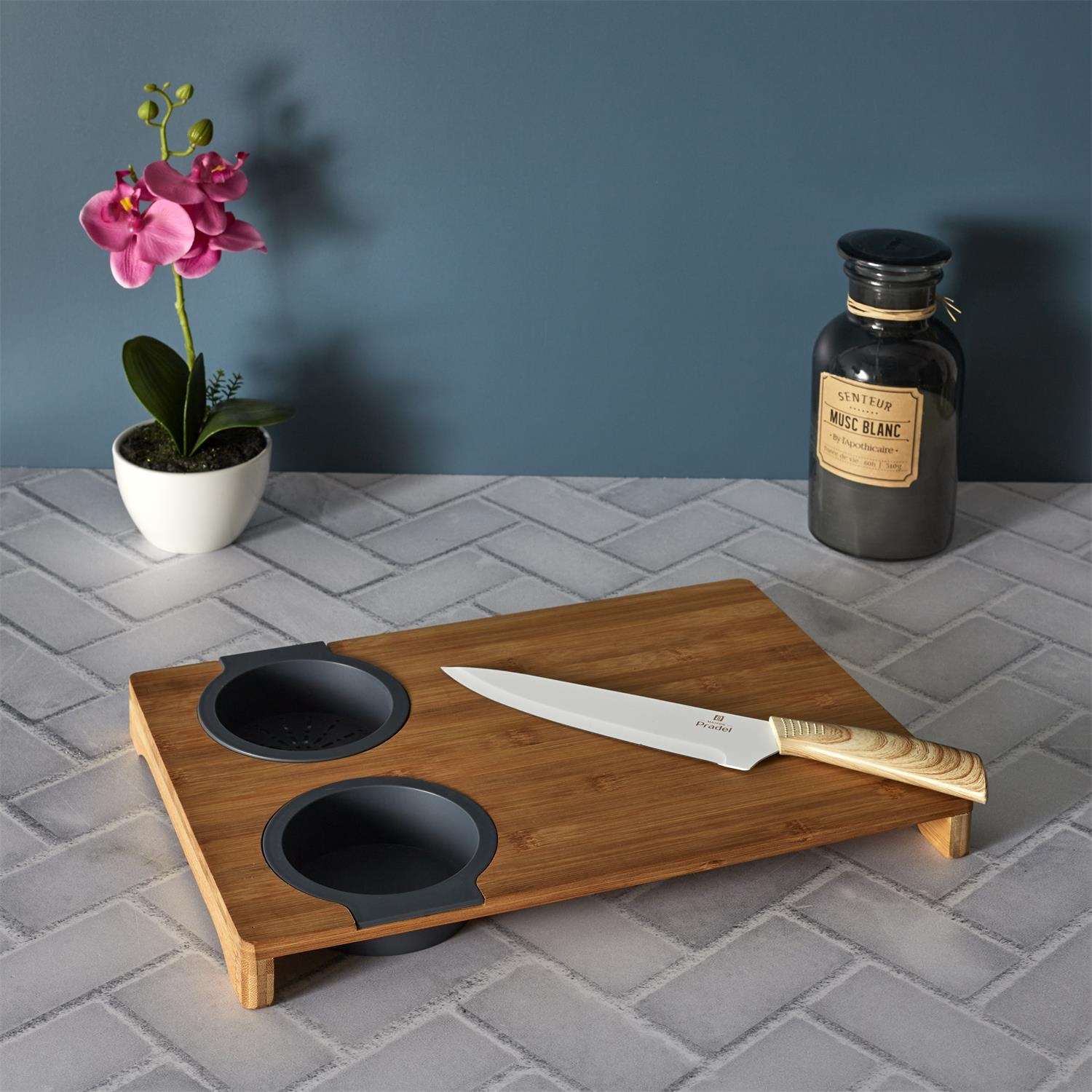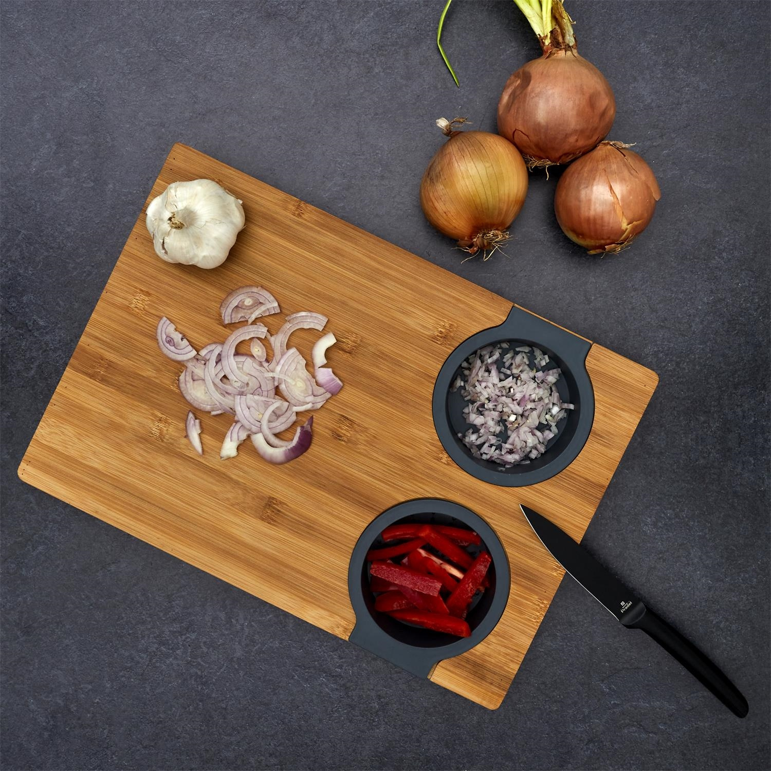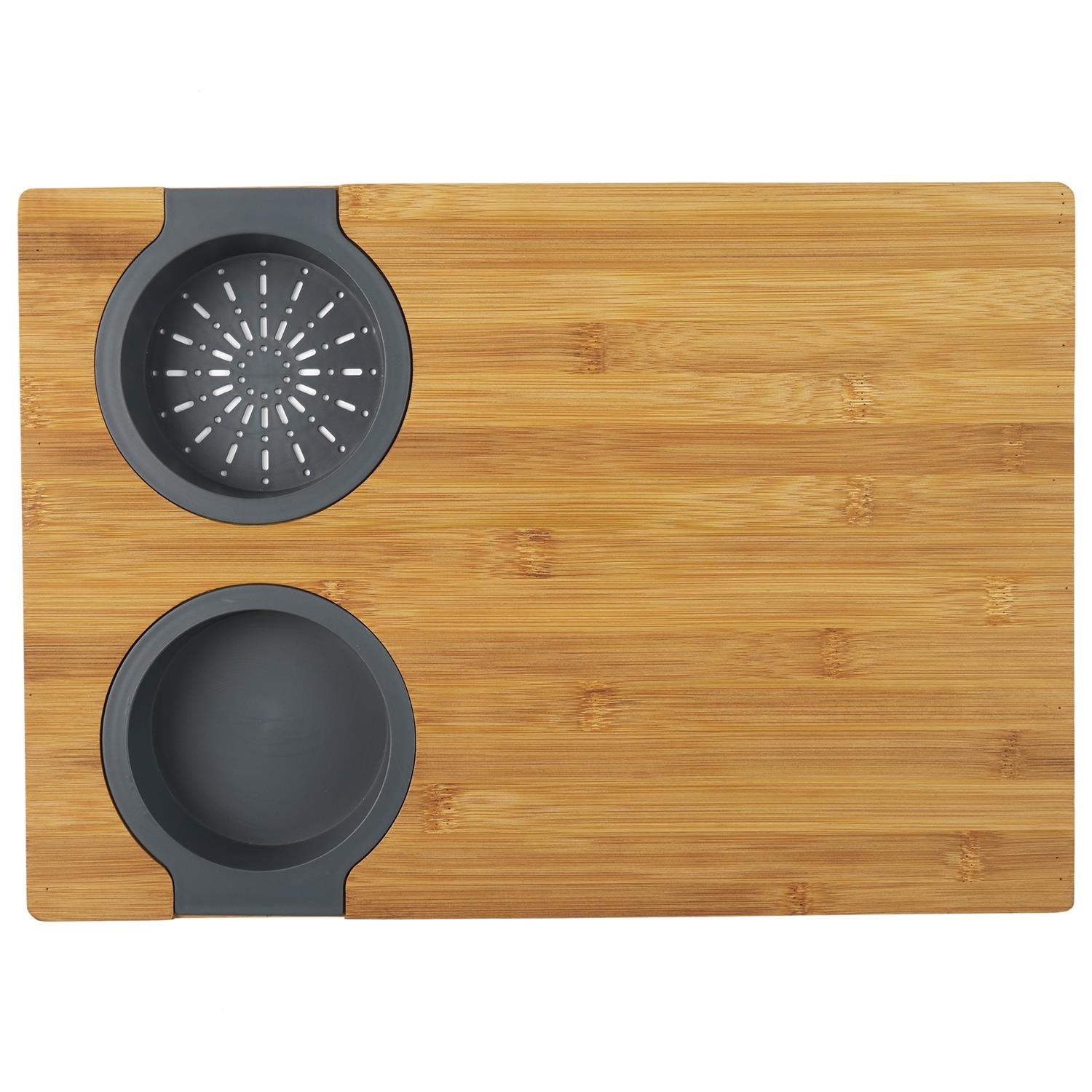 Deska do krojenia ze wbudowanymi dwoma silikonowymi pojemnikami. Deska idealna do krojenia ogórków kiszonych lub soczystych owoców. Pokrojone warzywa i owoce możemy przełożyć do jednej z dwóch wbudowanych silikonowych przegródek. Jedna to sitko, które odcedzi nasze pożywienie z nadmiaru sosu a drugi pojemniczek to miseczka, która sok zachowa. Sama deska wykonana została z drewna bambusowego. Bambus charakteryzuje się odpornością na wilgoć oraz twardą i trwałą strukturą, która wytrzyma częste krojenie nożem.Cechy produktu