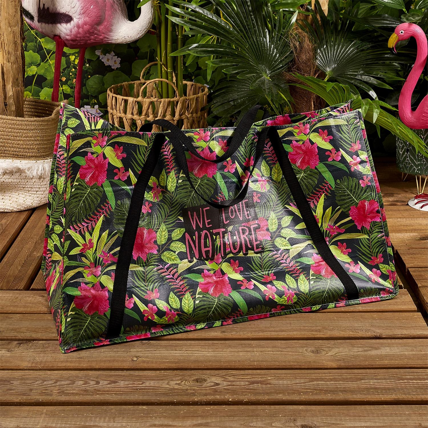 - Duża torba na zakupy Jungle to praktyczny i stylowy sposób na zapanowanie nad codziennymi zakupami. Zaprojektowana z myślą o funkcjonalności i ekologii, torba wykonana jest z trwałego materiału, którego nadruk przypomina tropikalne dżungle, dodając jednoc