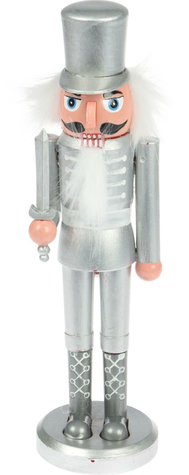 Dekoracja dziadek do orzechów w srebrnym kolorze ze srebrnymi akcentami to hit każdych świąt bożego narodzenia. Sympatyczny żołnierz o puchatych białych włosach skradnie serce domowników. Biało srebrny dziadek do orzechów dopełni świąteczną aranżację. Duży, bo aż 28-centymetrowy, dziadek został zrobiony ze sztucznego tworzywa, dzięki czemu jest wytrzymalszy od jego drewnianych odpowiedników. Dziadek posiada okrągłą podstawkę, dzięki której stoi stabilnie, więc śmiało możemy nim ozdobić stół na świąteczny obiad lub kominek.Cechy produktu