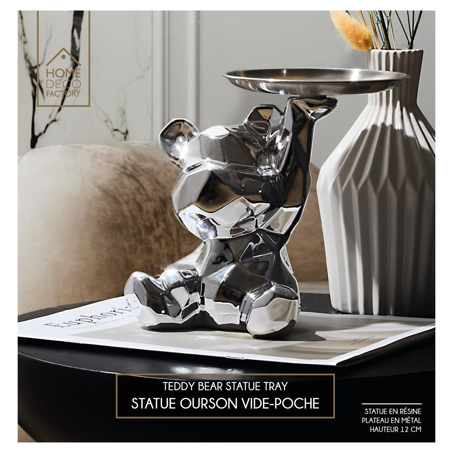 Ceramiczna figurka przypominająca misia ze złotą, metalową tacą to idealny element dekoracyjny, który zroi również porządek z kluczami lub innymi drobnymi przedmiotami.Cechy produktu