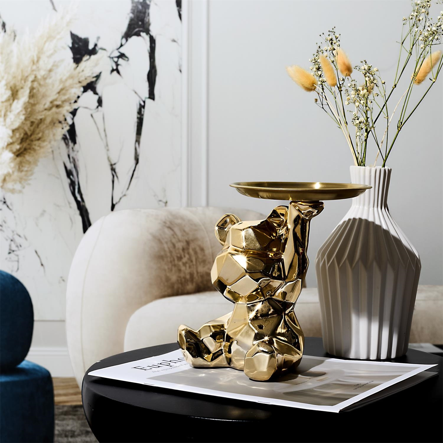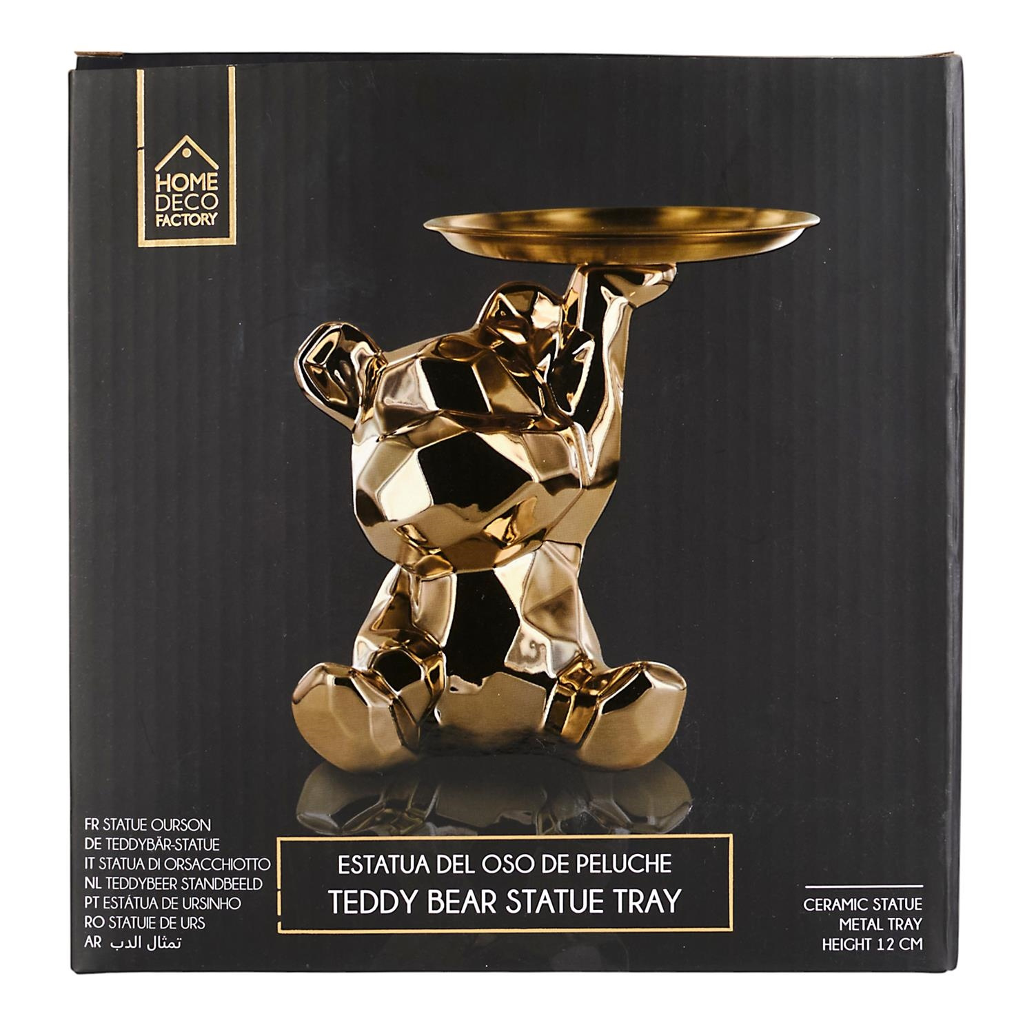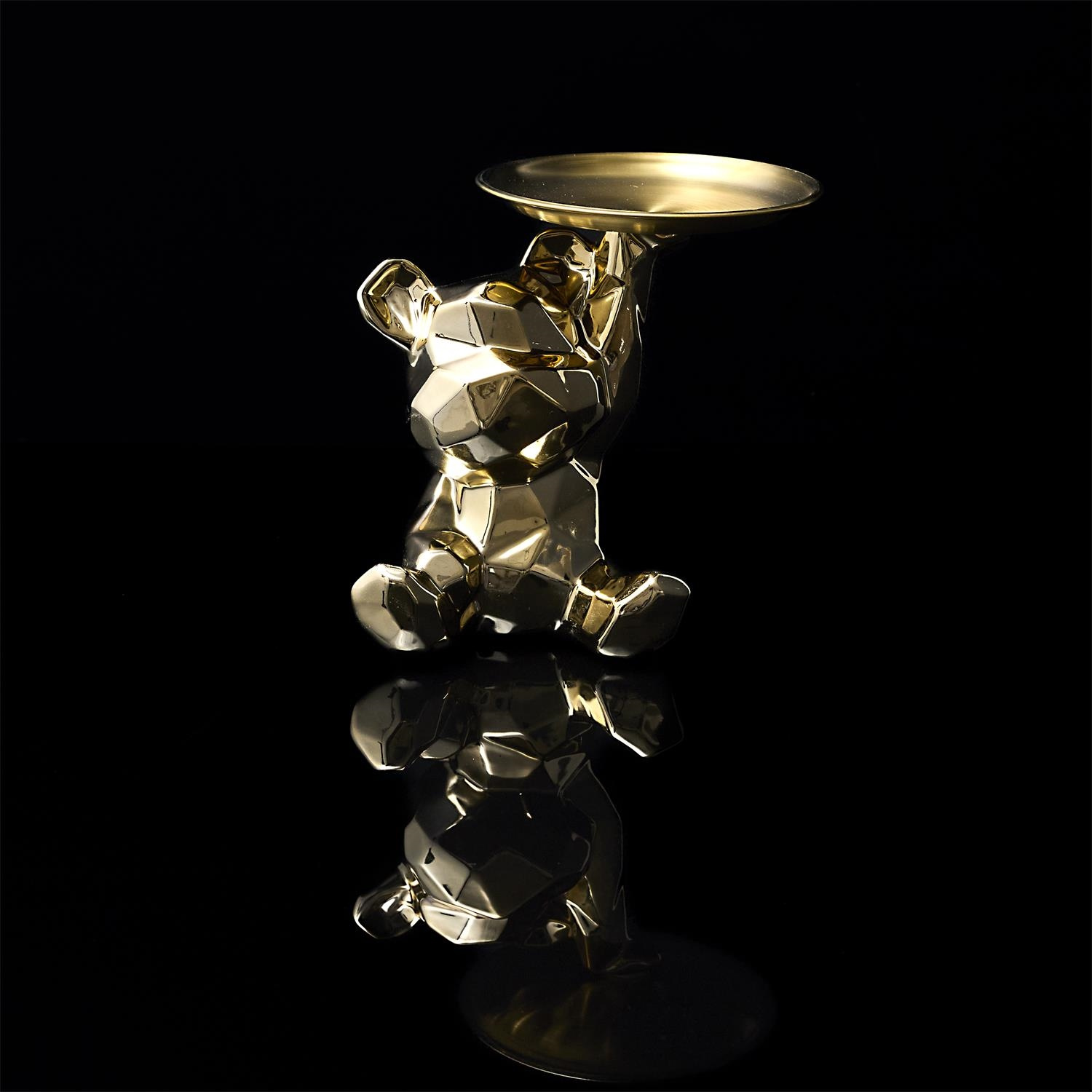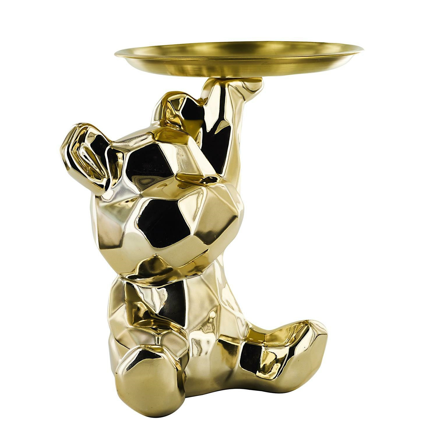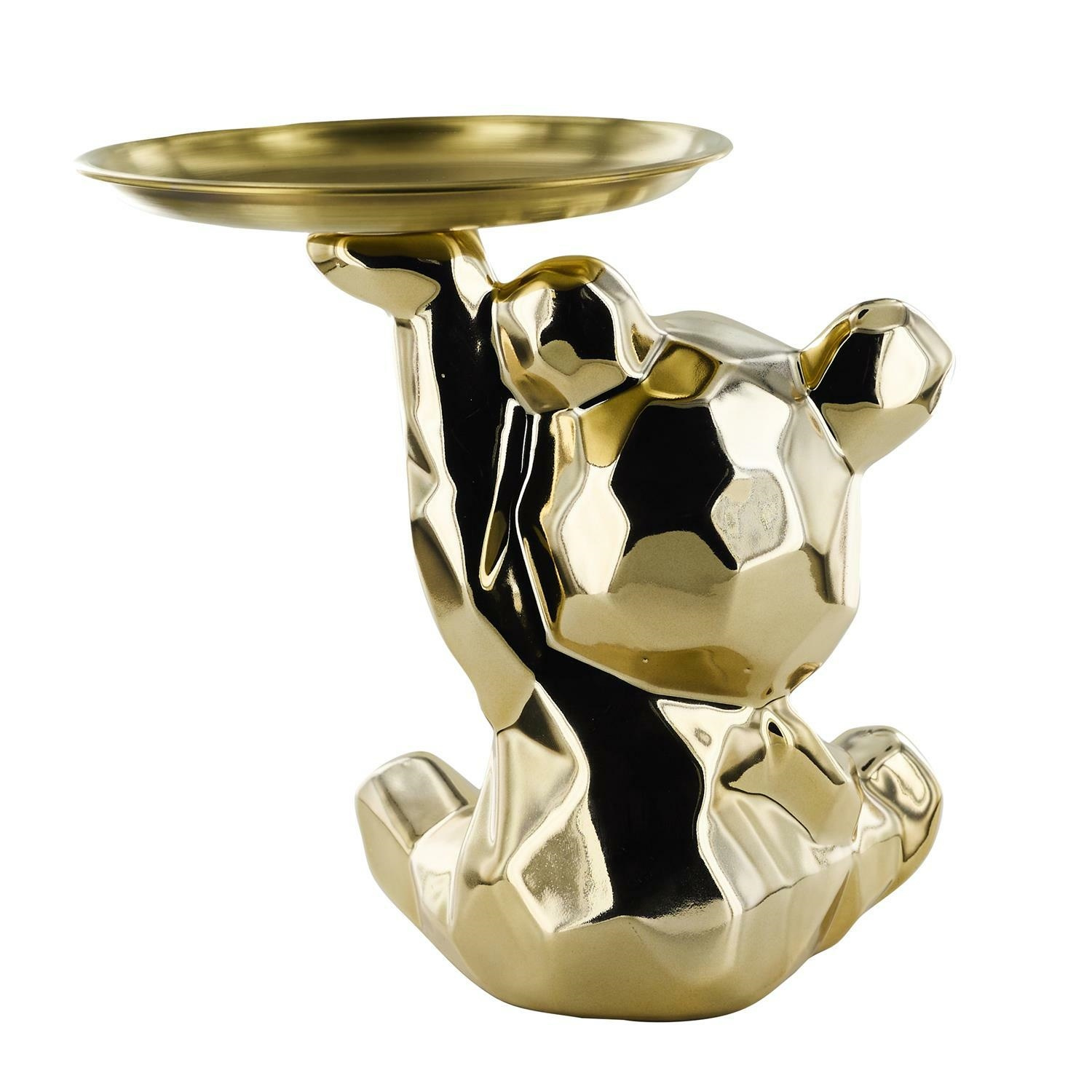 Ceramiczna figurka przypominająca misia ze złotą, metalową tacą to idealny element dekoracyjny, który zroi również porządek z kluczami lub innymi drobnymi przedmiotami.Cechy produktu