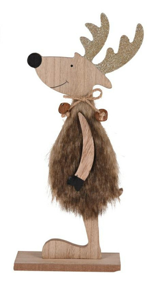 Figurka o kształcie renifera wykonana została z połączenia sklejki oraz tkaniny. Delikatne, ozdobne akcenty jak dzwoneczek czy czarne kopytka dodają figurce ciekawego wyglądu. Figurka ozdobiona jest tylko po jednej stronie.Cechy produktu