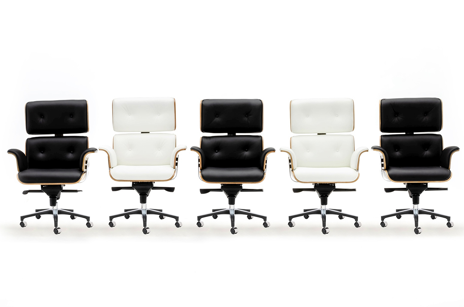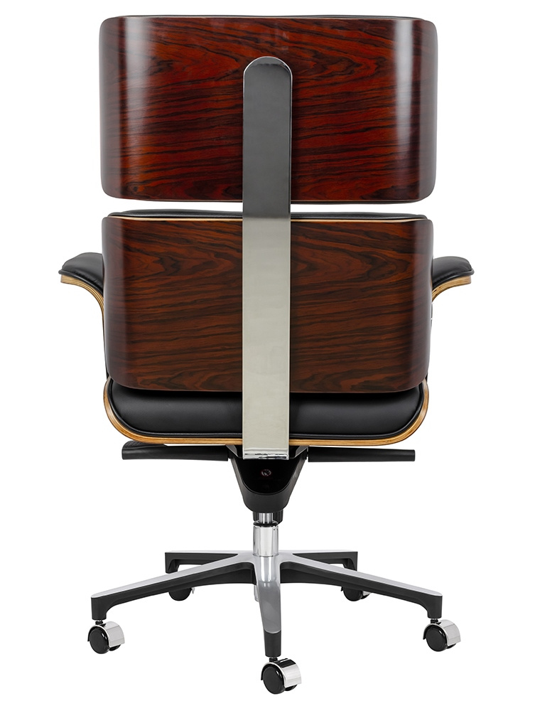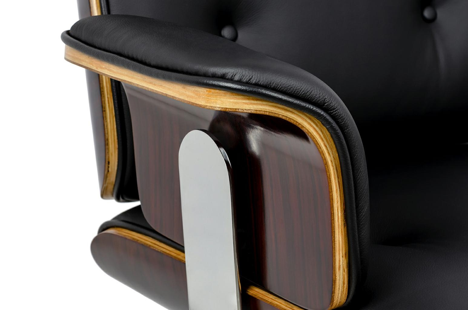 - Fotel biurowy LOUNGE BUSINESS czarny z różanym drewnem. Siedzisko, oparcie oraz podłokietniki tapicerowane są włoską skórą naturalną w kolorze czarnym. Korpus fotela został wykonany z giętego na ciepło drewna w kolorze różanym o grubości 55 mm. Podstawa o