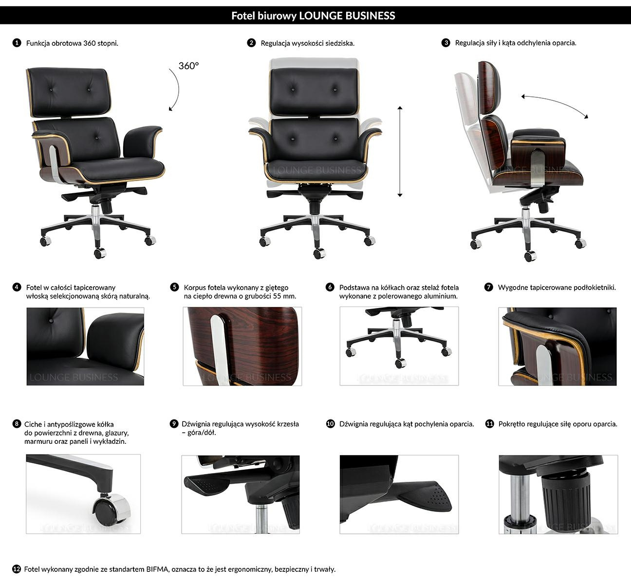 Fotel biurowy LOUNGE BUSINESS czarny z różanym drewnem. Siedzisko, oparcie oraz podłokietniki tapicerowane są włoską skórą naturalną w kolorze czarnym. Korpus fotela został wykonany z giętego na ciepło drewna w kolorze różanym o grubości 55 mm. Podstawa oraz elementy metalowe wykonane zostały ze stali polerowanej w standardzie BIMFA. Fotel wyposażony jest w obrotową podstawę z cichymi kółeczkami. Dodatkowo posiada regulację wysokości, siły oporu oparcia z blokadą i funkcję bujania. Lounge Business doskonale sprawdzi się w gabinecie, domowym biurze lub sali konferencyjnej. Wymiary: wys. 107 - 112 cm / szer. 76 cm / gł. 72 cm Wysokość do krawędzi siedziska: 46 - 51 cm Wysokość do podłokietników: 65 - 70 cm Siedzisko: szer. 47 cm / gł. 47 cm Oparcie: wys. 60 cm / szer. 56 cm Podłokietniki: wys. 20 cm / szer. 14 cm / gł. 31 cm Waga netto: 27 kg Wymiary opakowania: 79 cm / 61 cm / 94 cm Sposób wysyłki: paleta.Cechy produktu