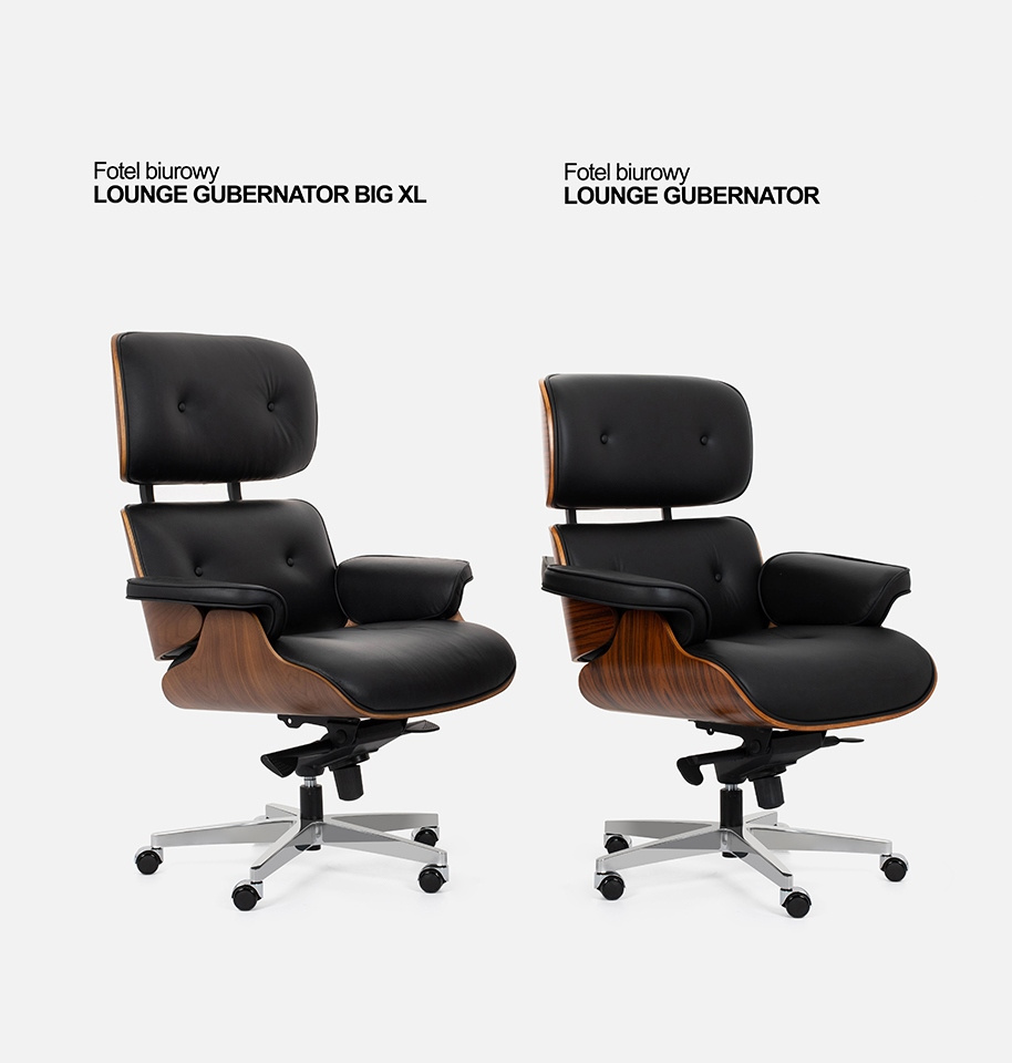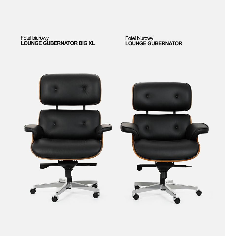 - Fotel biurowy LOUNGE GUBERNATOR BIG XL. Ten ikoniczny zestaw wypoczynkowy w powiększonej wersji Big XL to jeszcze większy komfort użytkowania. Całość tapicerowano naturalną skórą w klasycznym czarnym kolorze. Korpus fotela został wykonano z giętego na cie