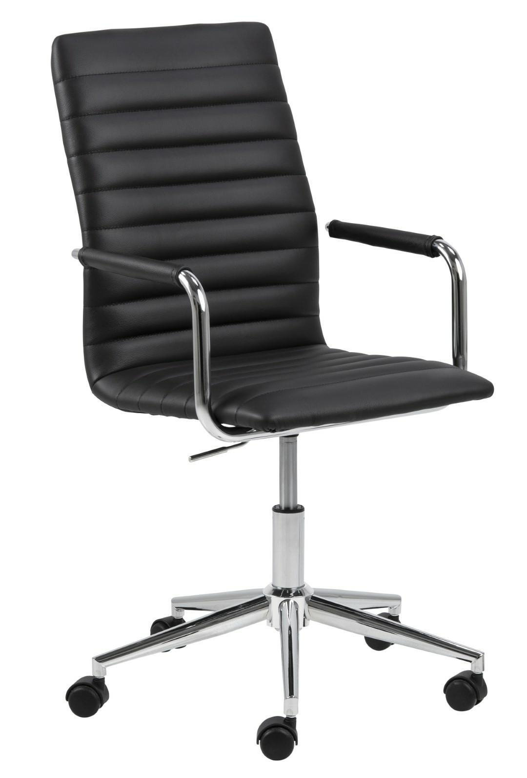 Fotel biurowy Winslow to wygodny obrotowy fotel z podłokietnikami. Siedzisko oraz oparcie krzesła zostało obite miękką czarną skórą. Poziome regularne przeszycia na fotelu dodają mu nowoczesnego wyglądu. Podłokietniki fotela również zostały obite skórą. Chromowana podstawa fotela wyposażona została w pięć obrotowych kółek. Fotel posiada regulację wysokości. Fotel posiada opcję automatycznego blokowania się kółek. Opcja ta polega, iż w momencie, gdy na fotelu nikt nie siedzi, utrudnione jest przesunięcie fotela, natomiast w momencie, gdy na nim siedzimy kółeczka obracają się delikatnie i płynnie. Max. obciążenie: 120 kg Max. ilość sztuk w kartonie: 1 Wymiary kartonu: 68 cm x 59 cm x 48 cmCechy produktu