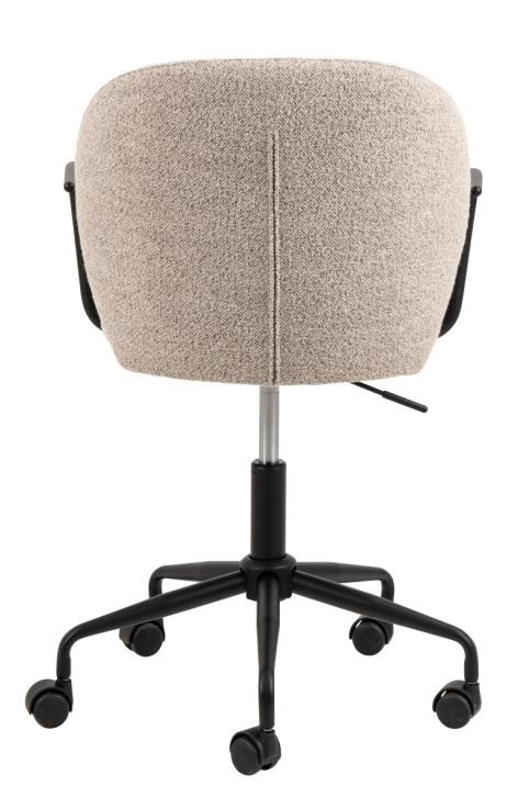 Wyróżniające się wyrafinowanym wyglądem krzesło do biurka ma zaokrąglone oparcie, rurowe czarne podłokietniki i miękką beżową tapicerkę typu bouclé. Wsparte na 5-gwiazdkowej obrotowej podstawie z kółkami z miękkim hamulcem i podnośnikiem gazowym, krzesło umożliwia płynny ruch i łatwą regulację wysokości. Krzesło zostało zaprojektowane z myślą o podniesieniu standardu domowego miejsca pracy. Krzesło do biurka z regulacją wysokości i podłokietnikami . Tapicerowane teksturowanym beżowym materiałem przypominającym bouclé . Podnośnik gazowy, funkcja obrotu i kółka z miękkim hamulcem . Podnośnik gazowy umożliwia regulację wysokości siedziska w zakresie 45-55 cm. 5-gwiazdkowa stalowa podstawa malowana proszkowo na czarno . Kółka z hamulcem dla bezpieczeństwa i funkcja obrotowa dla łatwego przemieszczania . Szerokość siedziska: 47cm Głębokośc siedziska: 45cm Wysokośc oparcia 39,5cm Wymaga montażu. Max obciążenie 110kg. Waga fotela: 9,7kg Wymiary kartonu:62x59x52cm