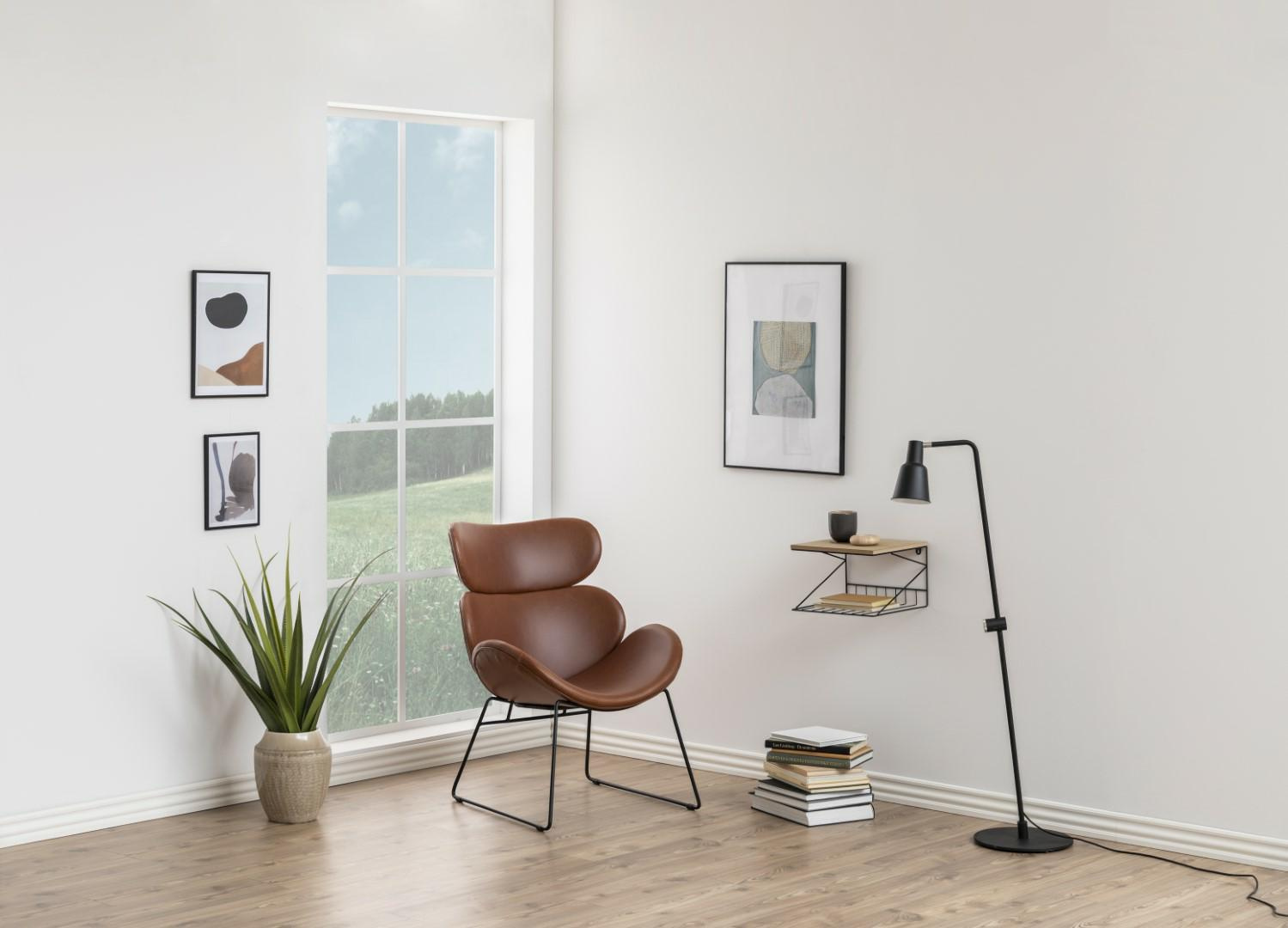 Fotel Cazar wykonany został z brązowej skóry ekologicznej i czarnej malowanej proszkowo metalowej podstawy. Jego profilowane siedzisko zapewni komfortowy odpoczynek. Siedzisko fotela składa się z trzech profilowanych elementów obszytych eko skórą lekko optycznie postarzaną. Podstawą fotela są nogi w kształcie płozy. Czarne wykończenie dodaje całości klasycznego i loftowego wyglądu. Fotel prezentuje się niezwykle elegancko co sprawia, że doskonale sprawdzi się w hotelowym holu, poczekalni bądź przestrzennym salonie. Maksymalne obciążenie: 120kg Ilość maksymalna w kartonie:1 Szerokość siedzCechy produktu