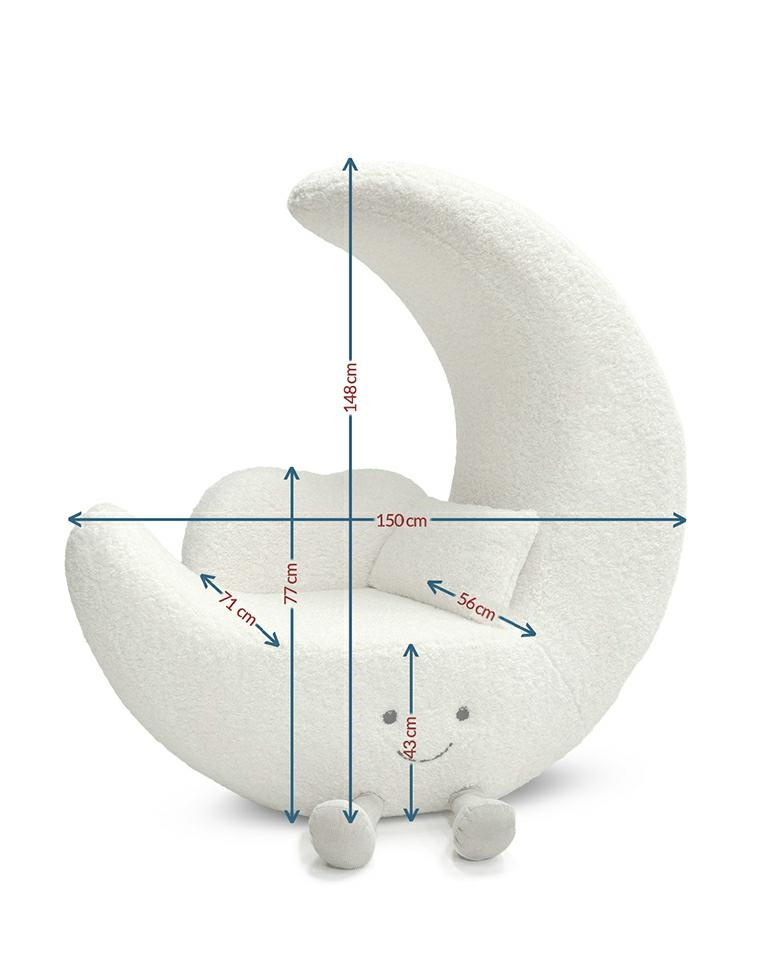 - Fotel dziecięcy MOON biały. Uroczy i komfortowy fotel w kształcie księżyca, zaprojektowany z myślą o dziecięcych pokojach i przestrzeniach wypoczynkowych. Wykonany z przyjemnego w dotyku, miękkiego materiału o fakturze baranka, zapewnia wyjątkowy komfort