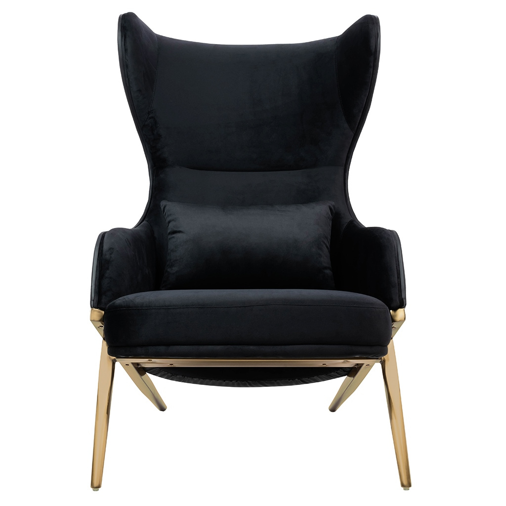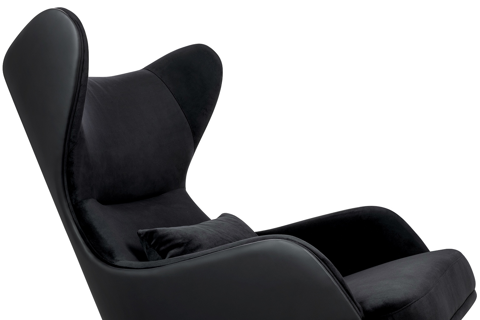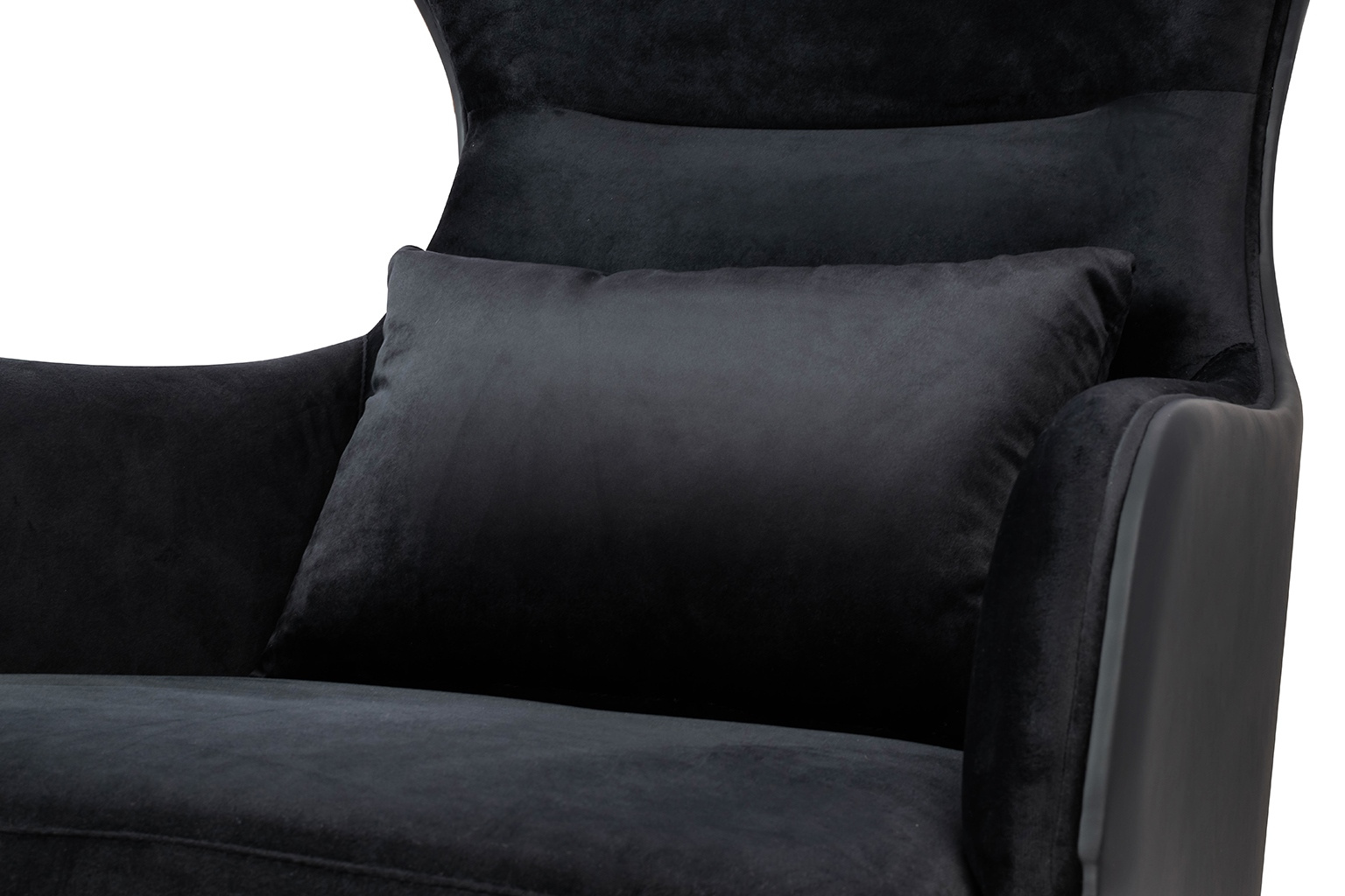 - Fotel HAMPTON. Siedzisko oraz poduszka tapicerowane są aksamitnym welurem w kolorze czarnym. Tył fotela został obszyty czarną ekoskórą. Metalowa podstawa o ciekawym kształcie w kolorze złotym podkreśla nowoczesny charakter fotela. Możliwość personalizacji