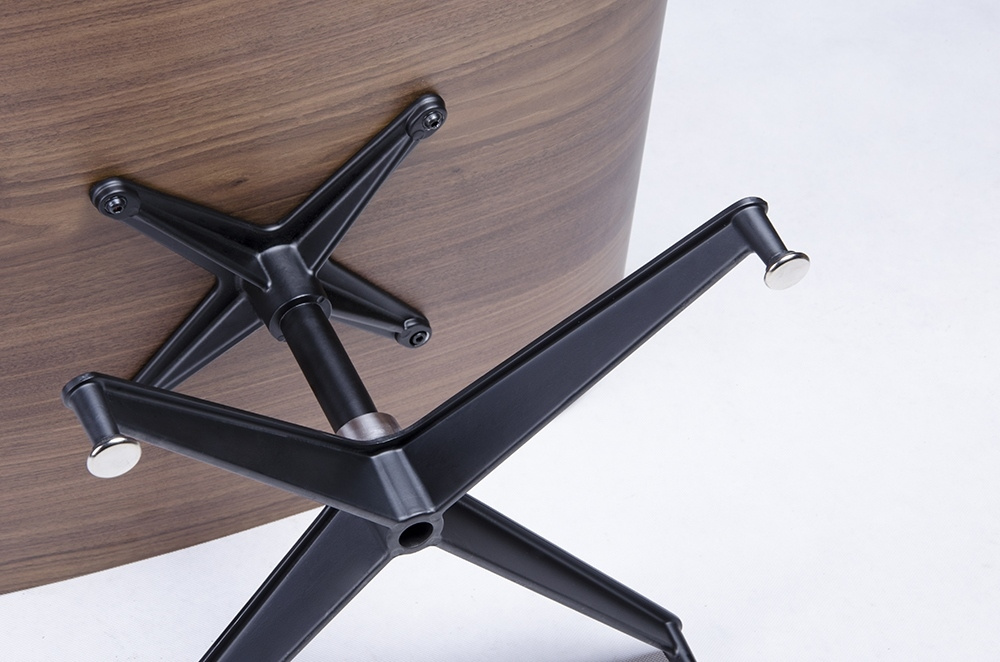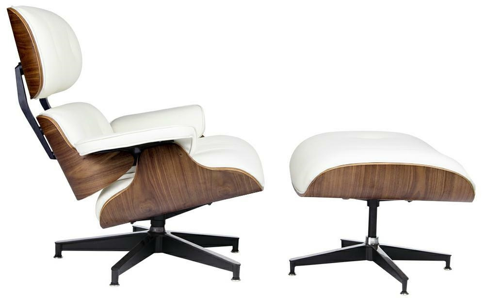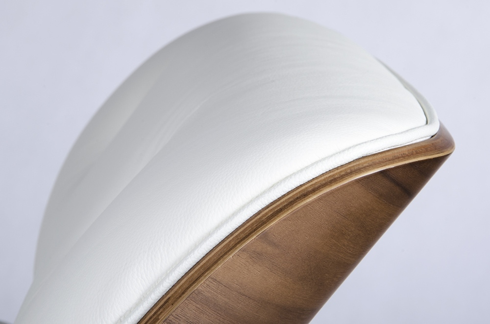 - Fotel LOUNGE HM PREMIUM SZEROKI biały. Cały fotel wraz z podnóżkiem tapicerowane są naturalną włoską skórą w kolorze czarnym. Zarówno korpus fotela, jak i podnóżka zostały wykonane z giętej sklejki fornirowanej drewnem orzechowym. Podstawy oraz łączenia o