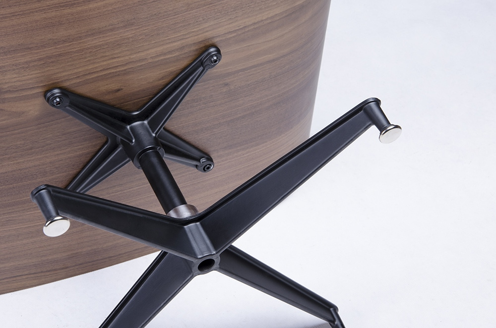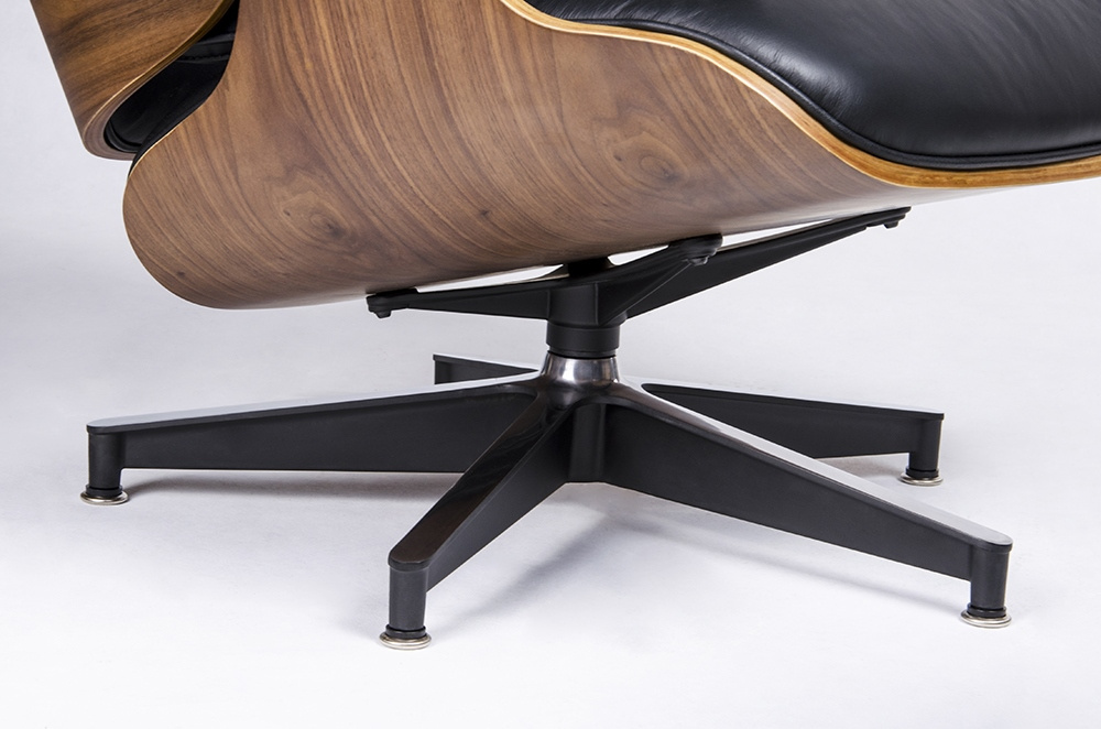 - Fotel LOUNGE HM czarny z podnóżkiem z orzechowym drewnem. Cały fotel wraz z podnóżkiem tapicerowane są naturalną włoską skórą w kolorze czarnym. Zarówno korpus fotela jak i podnóżka został wykonany z giętego na ciepło drewna w kolorze orzechowym. Podstawy