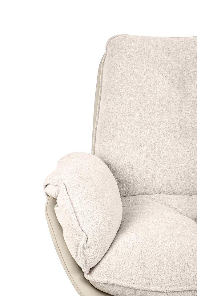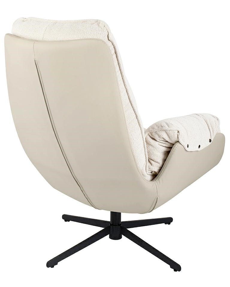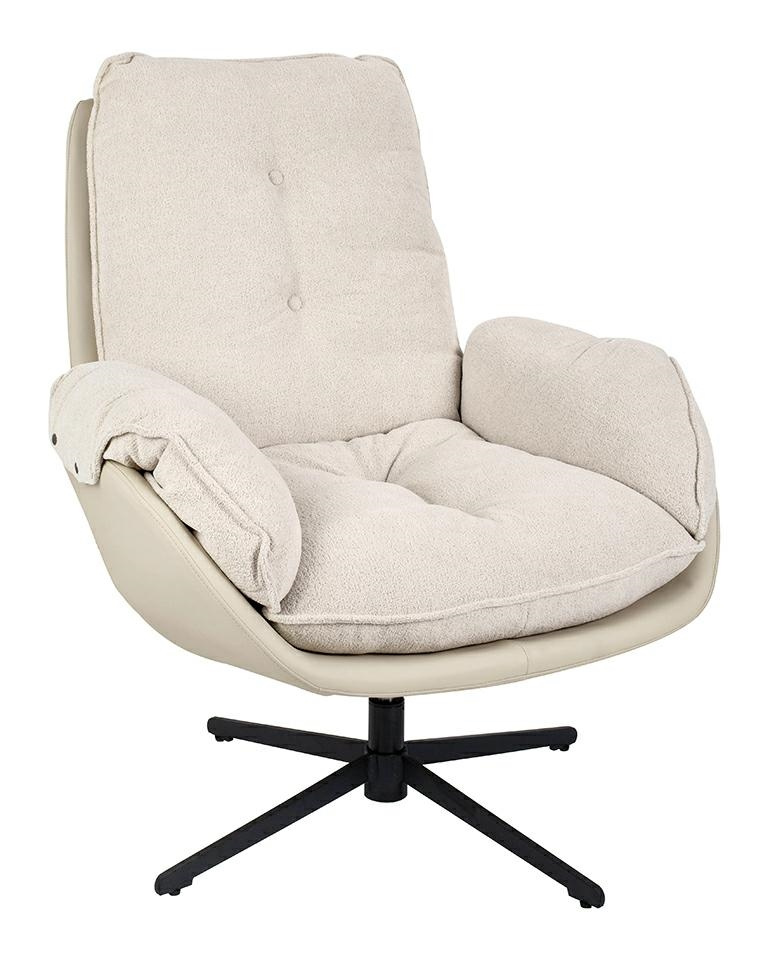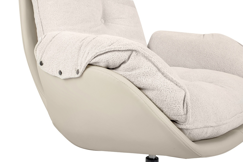 Fotel obrotowy CARINO beżowy - PU, stal. Szykowny, przytulny fotel z najwyższym komfortem użytkowania. Korpus fotela wykończono skórą PU w beżowym odcieniu. Całość osadzono na obrotowej stalowej podstawie w czarnej kolorystyce. Wygodne siedzisko zdobi duża poducha obszyta przyjemną oraz modną w dotyku tkaniną Teddy. Zachwyca nie tylko wyjątkowym designem, ale także gwarantuje pełen komfort i Świetnie sprawdzi się w salonie, biurze, sypialni czy stylowej przestrzeni wypoczynkowej. Wymiary: wys. 105 cm / szer. 85 cm / gł. 85 cm Wysokość do krawędzi siedziska: 46 cm Siedzisko: szer. 48 cm / gł. 50 cm Oparcie: wys. 58 cm / szer. 46 cm Wysokość do podłokietników: 63 cm Podłokietniki: szer. 20 cm / gł. 44 cm Podstawa: 57 x 57 cm.Cechy produktu