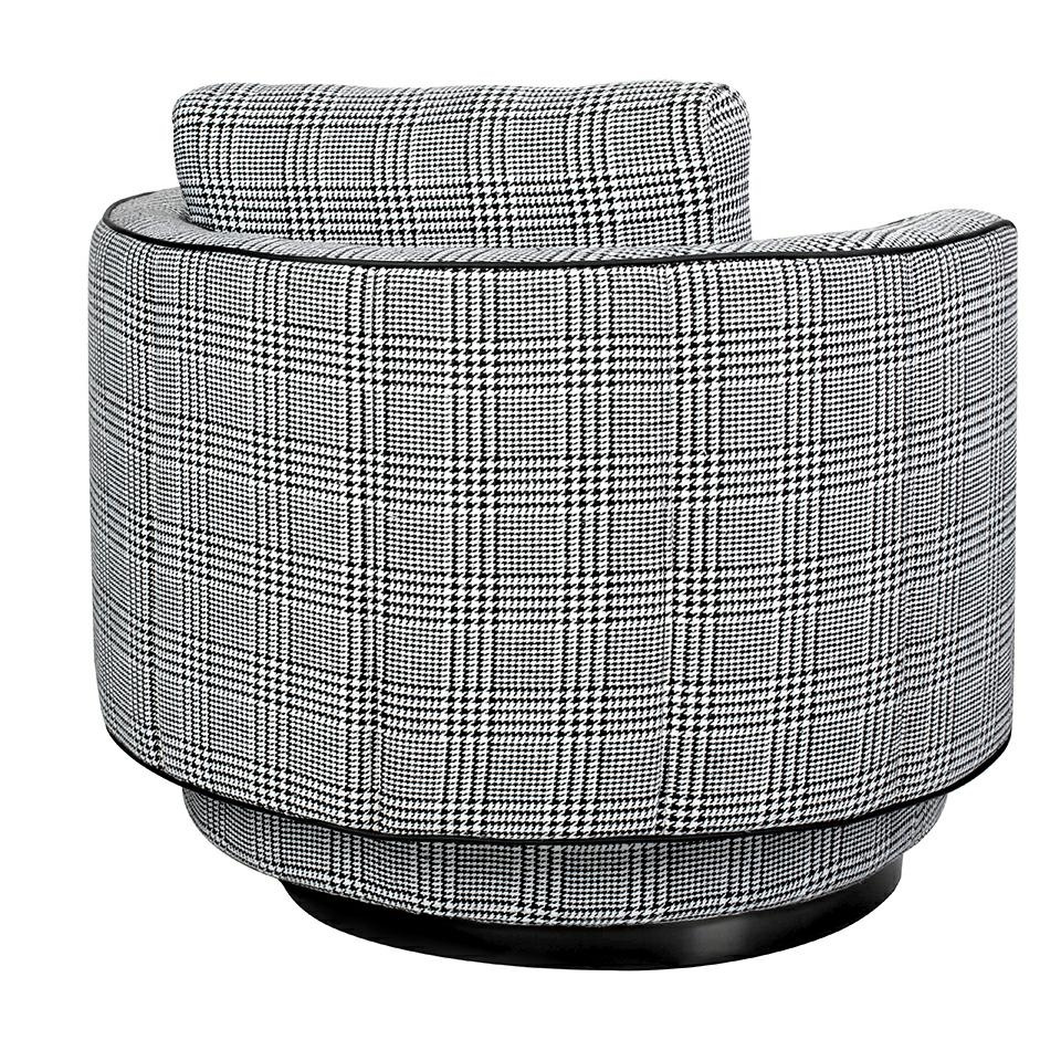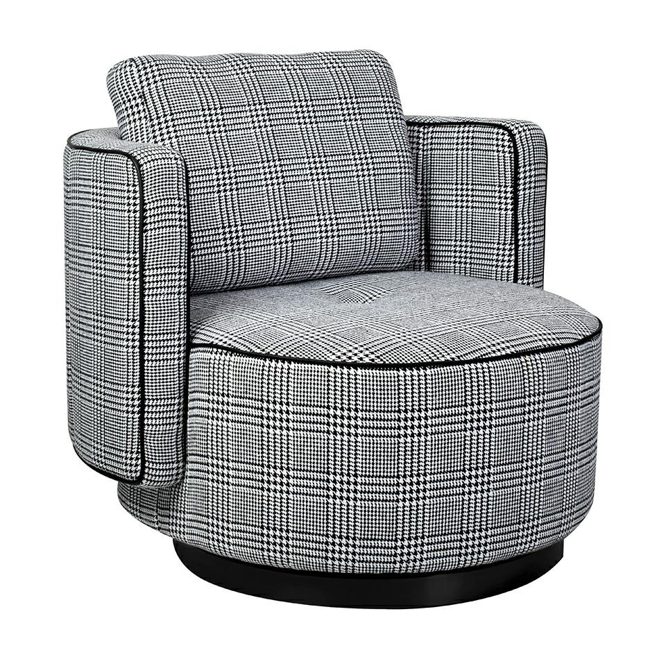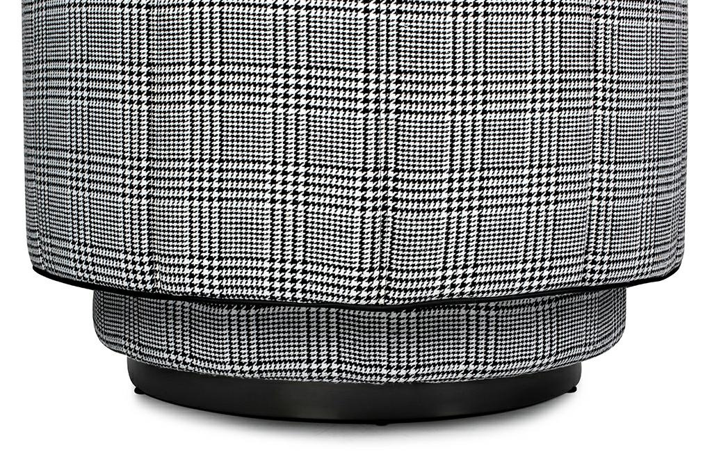 - Fotel obrotowy TONDO pepitka biało-czarna. Nowoczesny, wielofunkcyjny fotel, który wzbogaci Twoje wnętrze. Siedzisko oraz poduszka obszyte jest piękną tkaniną w biało-czarną pepitkę. Obrotowa podstawa wykonana jest ze stali nierdzewnej w czarnym kolorze.
