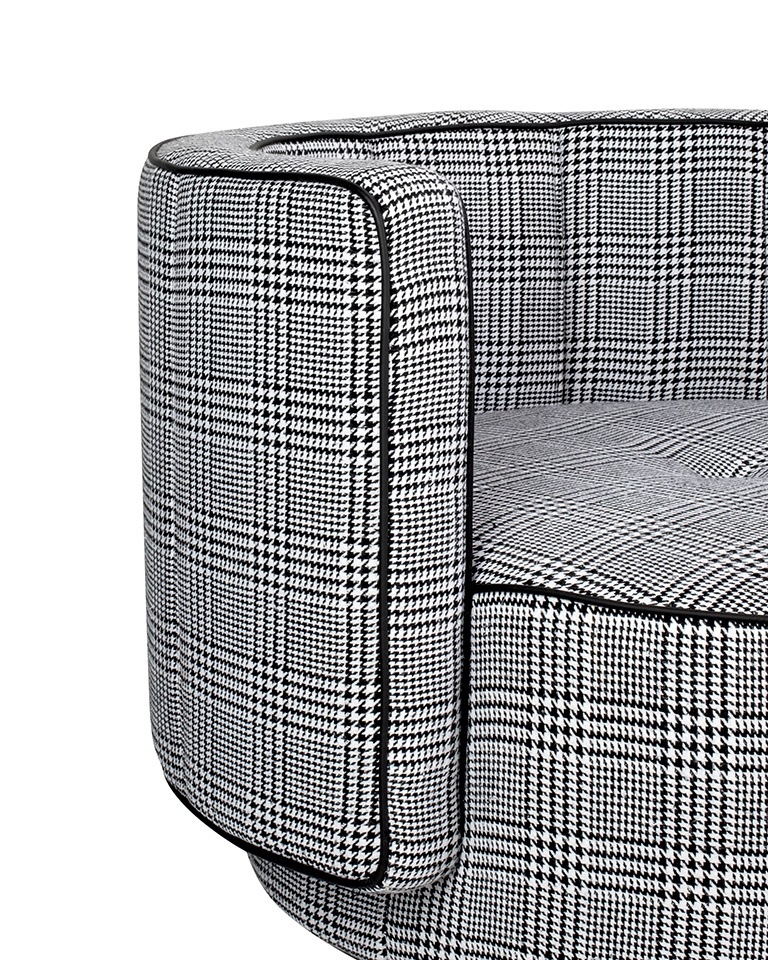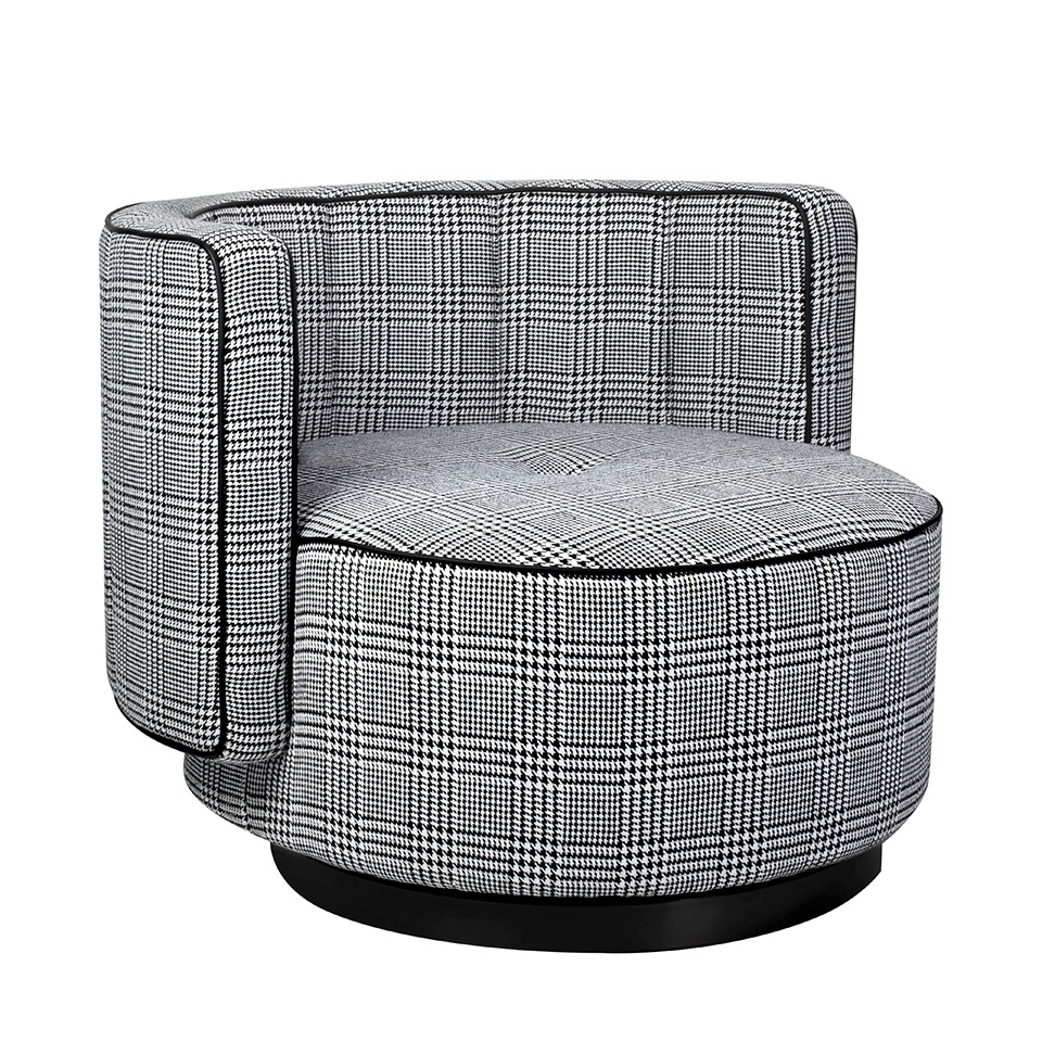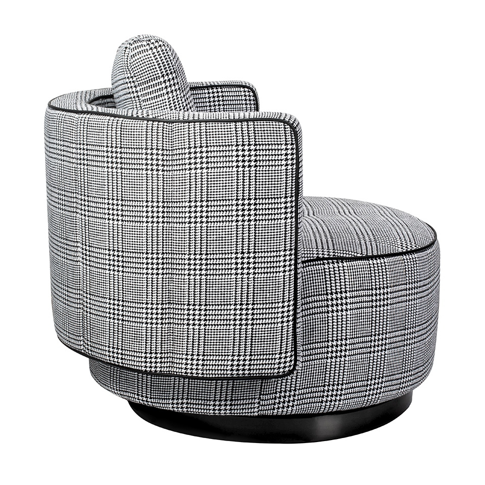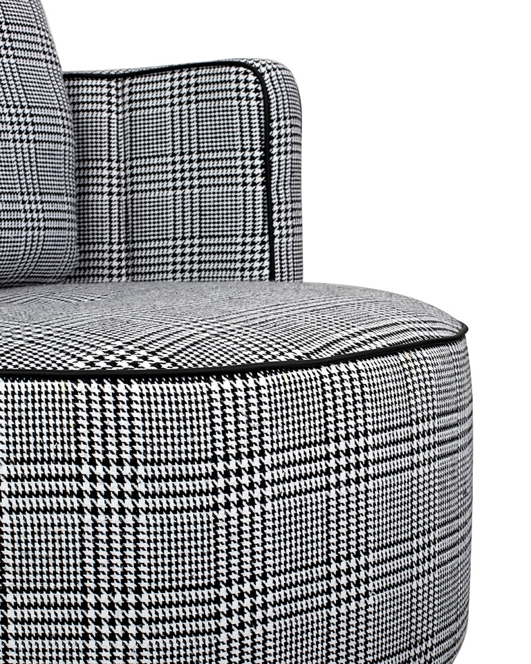 Fotel obrotowy TONDO pepitka biało-czarna. Nowoczesny, wielofunkcyjny fotel, który wzbogaci Twoje wnętrze. Siedzisko oraz poduszka obszyte jest piękną tkaniną w biało-czarną pepitkę. Obrotowa podstawa wykonana jest ze stali nierdzewnej w czarnym kolorze. Poza unikatowym designem jest to fotel niezwykle komfortowy. Wymiary: wys. 79 cm / szer. 88 cm / gł. 96 cm Wysokość do krawędzi siedziska: 39 cm Siedzisko: szer. 69 cm / gl. 69 cm Wysokość do podłokietników: 69 cm Podłokietniki: szer. 9,5 cm Poduszka: 57 x 41 x 10 cm Podstawa: śr. 60 cm.Cechy produktu