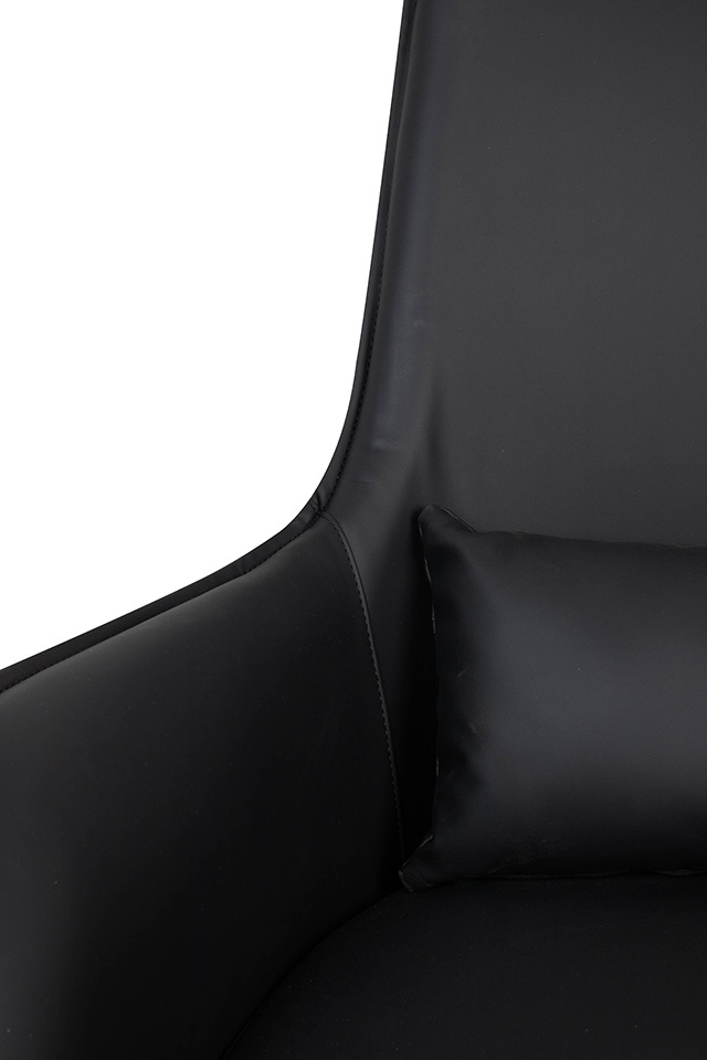 Fotel VICTOR czarny PU. Klasyczny i elegancki fotel z wysokim oparciem odnajdzie swoje zastosowanie zarówno w nowoczesnej aranżacji, jak i przestrzeni biurowej. Victor tapicerowany jest w całości ekoskórą, a jego podstawę wykonano z malowanego na czarno metalu. Poduszka w zestawie oprócz wizualnej dekoracji reguluje głębokość siedziska, co poprawia komfort użytkowania. Wymiary: wys. 104 cm / szer. 80 cm / gł. 73 cm Wysokość do krawędzi siedziska: 42 cm Wysokość do podłokietników: 58 cm Siedzisko: gł. 56 cm Oparcie: wys. 67 cm Sposób wysyłki: paleta.Cechy produktu