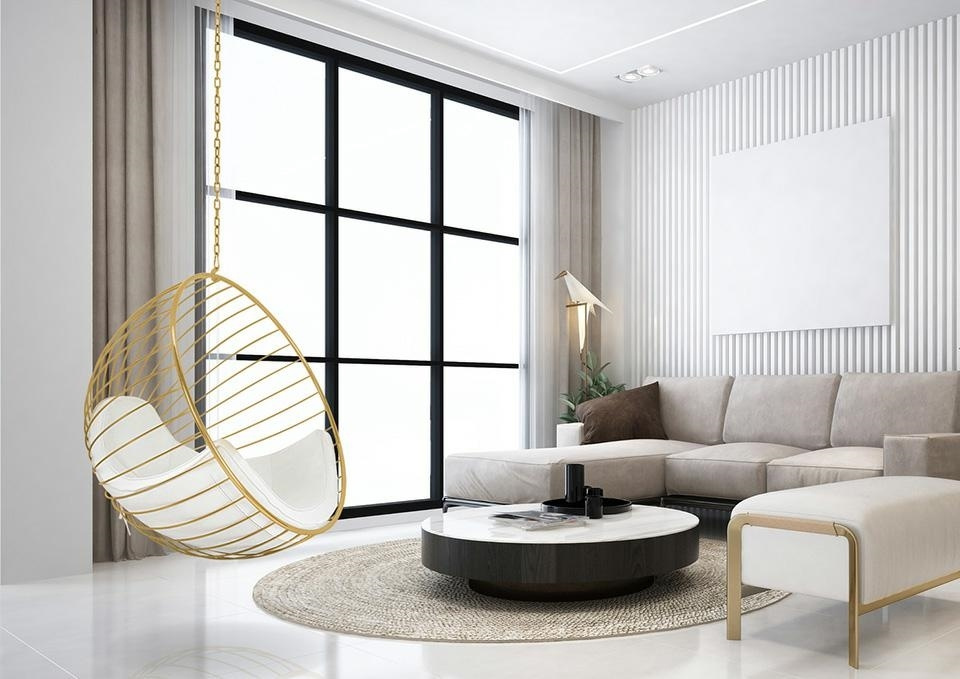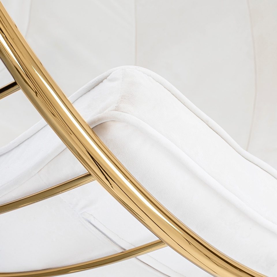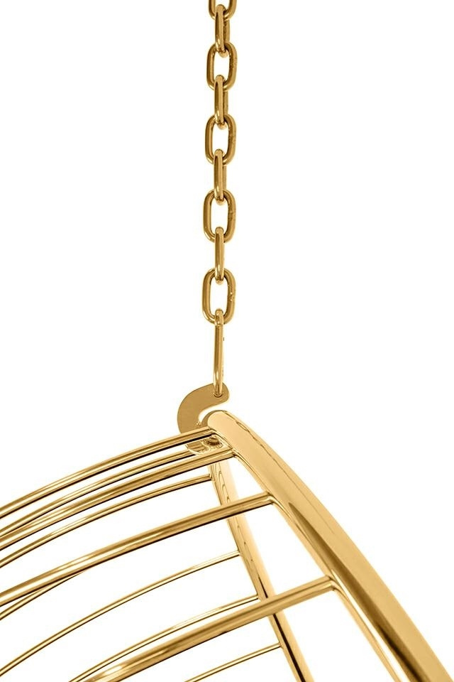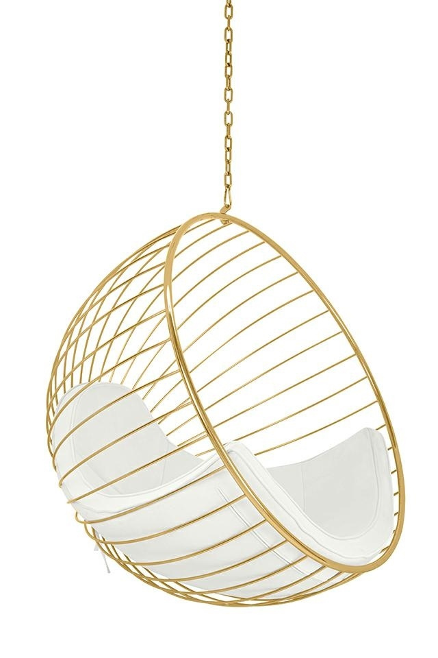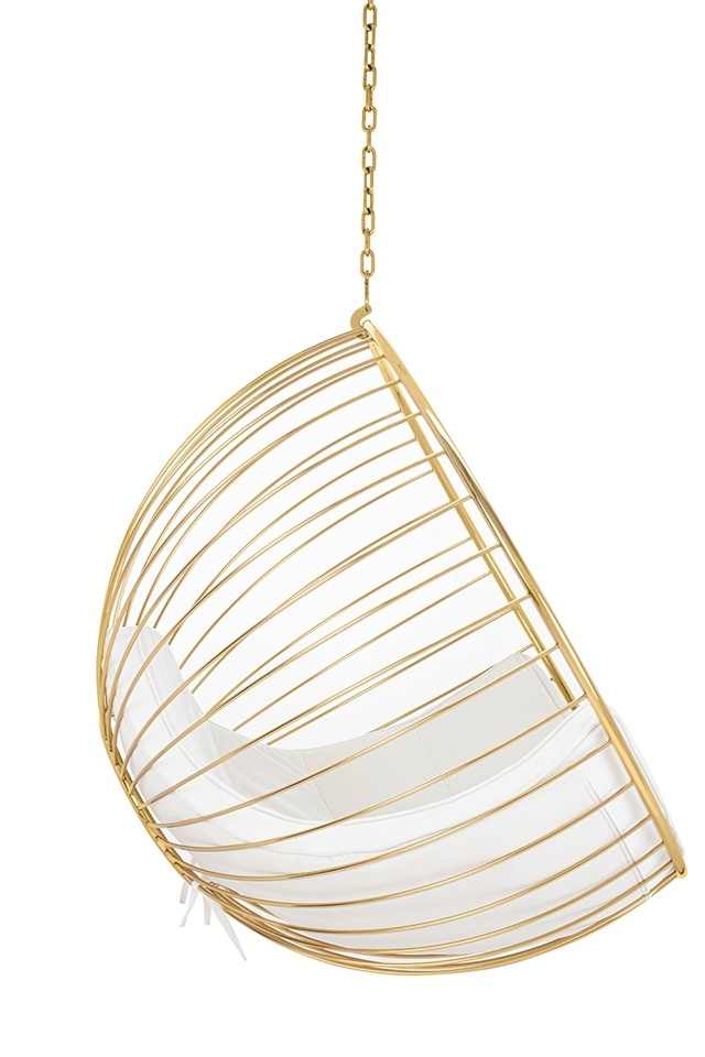 - Fotel wiszący GABBIA złoty / beżowy. We wnętrzu kulistej formy znajduje się poduszka tapicerowana przyjemną welurową tkaniną w kolorze beżowym. Stelaż fotela wykonany został z metalu lakierowanego na kolor złoty. Gabbia kształtem przypomina rozpromienione