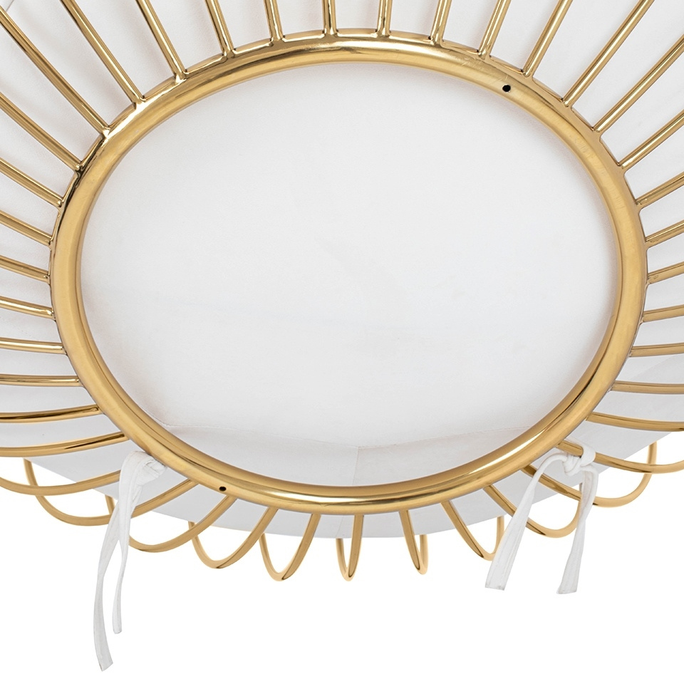 Fotel wiszący GABBIA złoty / beżowy. We wnętrzu kulistej formy znajduje się poduszka tapicerowana przyjemną welurową tkaniną w kolorze beżowym. Stelaż fotela wykonany został z metalu lakierowanego na kolor złoty. Gabbia kształtem przypomina rozpromienione słońce z ciekawym motywem. Ten designerski produkt z zachwytem rozświetli każde wnętrze w stylu glamour. Wymiary: wys. 289 cm / szer. 118 cm / gł. 91 cm Siedzisko: szer. 105 cm / gł. 55 cm / wys. 8,5 cm Oparcie: wys. 60 cm Średnica okręgu z tyłu oparcia: 40 cm Łańcuch: dł. 166 cm Mocowanie: szer. 10 cm / gł. 10 cm / wys. 5 cm (z zaczepem) Wymiary opakowania: 130 cm / 130 cm / 90 cm Sposób wysyłki: paczka gabarytowa.Cechy produktu