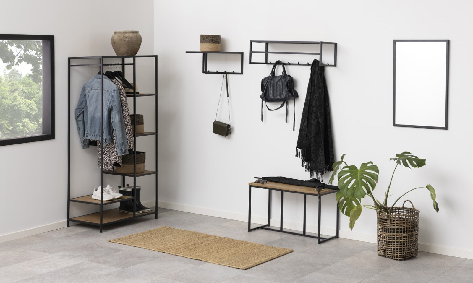 - W kolekcji mebli Seaford znajduje się także garderoba. Wykonany z płyt MDF oraz malowanego proszkowo metalu charakteryzuje się minimalistyczną formą oraz wyjątkową wytrzymałością. Posiada pięć szerokich półek oraz miejsce na wieszaki z większymi elementam
