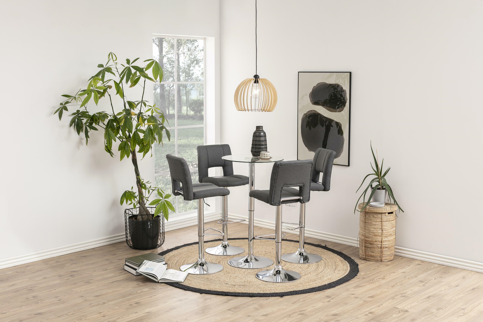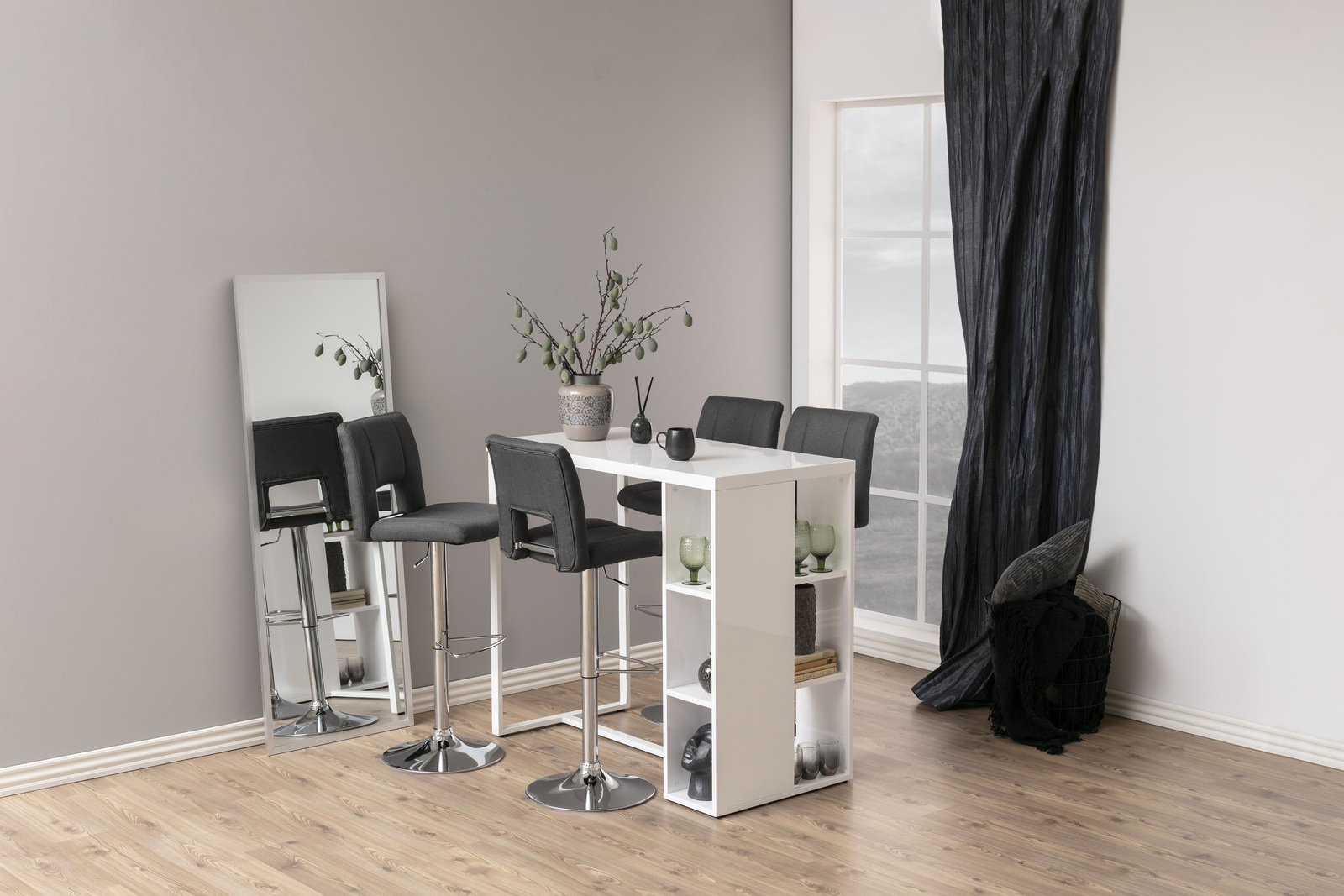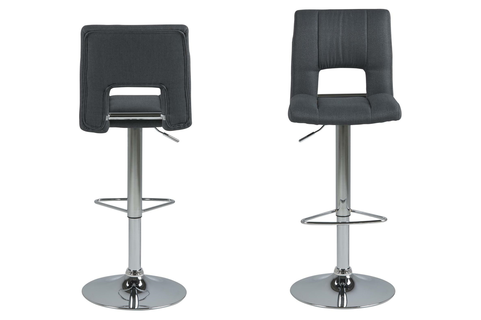 Hoker Sylvia to mebel do nowoczesnego baru lub jadalni. Siedzisko z pianki poliuretanowej pokryte jest tapicerką z tkaniny Corsica fabric dark grey 20. Podstawę stanowi długa, smukła noga z metalu w kolorze chromu. Hoker posiada wysokie, wygodne oparcie oraz dodatkowe podparcie dla nóg. Stołek posiada regulację wysokości. Ilość kartonów: 1 Wymiary kartonów: 60x44x44cm Waga kartonów: 10,5kgCechy produktu