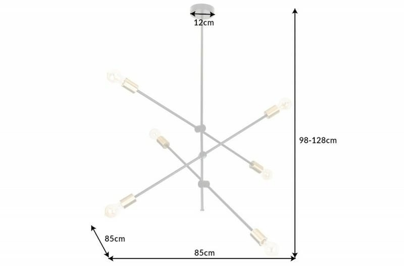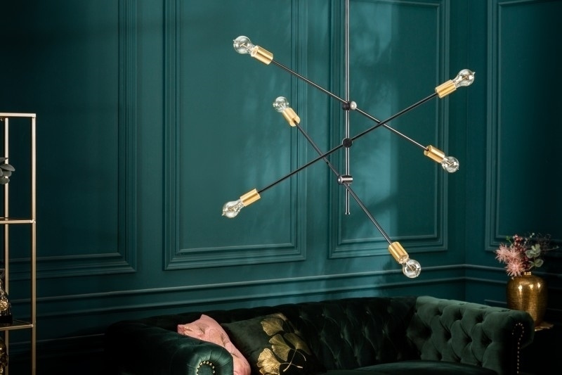 INVICTA lampa wisząca VARIATION. Lampa wykonana z wysokiej jakości metalu o niepowtarzalnym wyglądzie. Jej ramiona przymocowane do zawieszania są zmienne, możemy je dostosowywać do wybranych przez nas potrzeb. Jest ona w kolorach czerni i złota co doda jej charakteru i wyglądu retro. Światło: 6 x E27 max. 40 W (brak w zestawie) Oprawa: szer. 85 cm / wys. 98 cm / gł. 85 cm Montaż: instalacja sufitowa.Cechy produktu