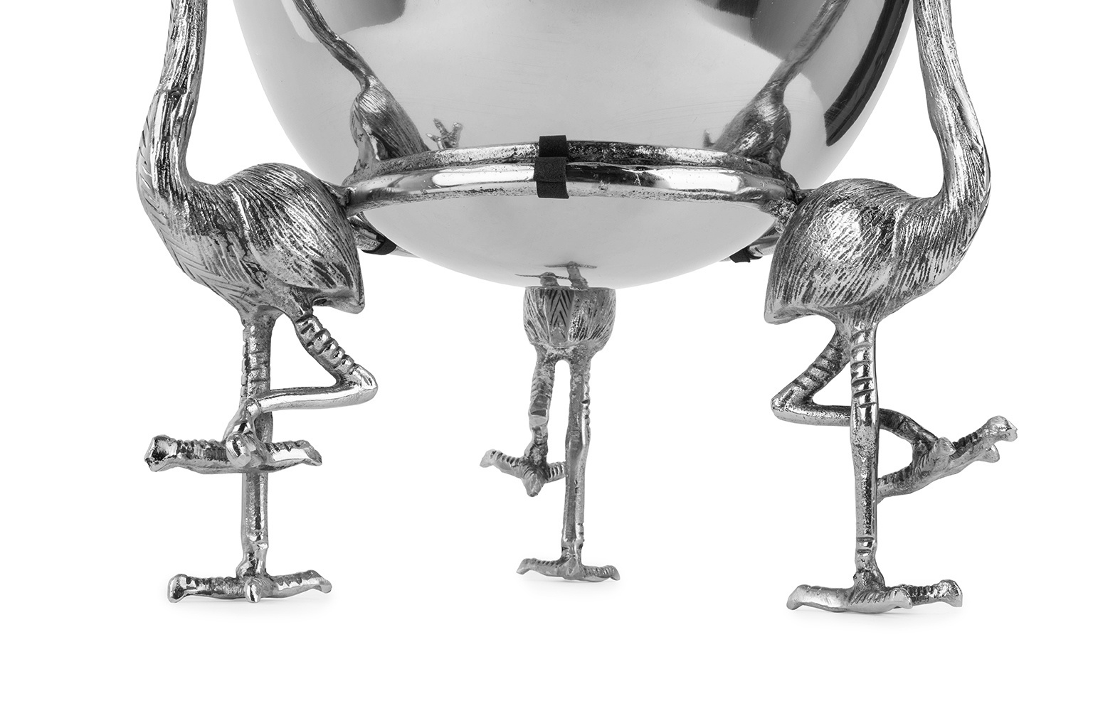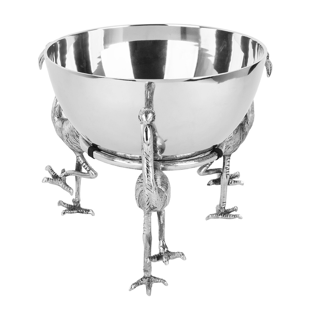 KARE miska dekoracyjna FLAMINGO. Nowoczesna propozycja od marki Kare Design z pewnością zajmie centralne miejsce podczas każdej uroczystości. Dzięki trzem figurkom flamingów niosących srebrną miskę ozdobi każdy stół w jadalni i doskonale sprawdzi się jako chłodziarka do butelek, miska na kwiaty lub jako dekoracyjna rzeźba nawet bez zawartości. Produkt wykonany ręcznie z niklowanego aluminium. Waga: 2,5 kg Sposób wysyłki: Paczka.Cechy produktu