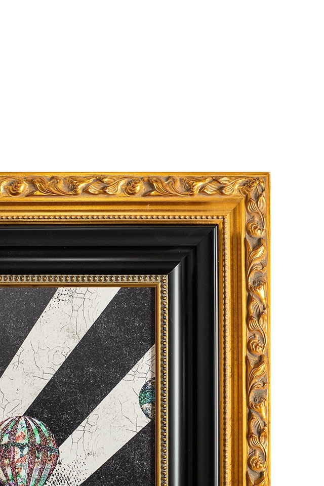 KARE obraz BALLOONS 160x260 cm. Obrazy na ścianie są osobistą galerią sztuki, które wyrażają styl i dopełniają wygląd wnętrza. Ballons jest hołdem dla lotnictwa i odzwierciedla pierwszych ludzi, którzy wznieśli się balonem nad Paryżem w 1783 roku. Jest to obraz, który przyciąga wzrok swoim nowoczesnym designem i skłania do refleksji. Całość wykonano w biało-czarnej kolorystyce połączonej z kolorowymi akcentami i wydrukowano na wysokiej jakości papierze artystycznym, następnie oprawiono w elegancką czarno-złotą ramę z drewna sosnowego. Polecamy to dzieło sztuki do salonu, biura, restauracji czy hotelu. Wymiary: wys. 260 cm / szer. 160 cm / gł. 6 cm Waga brutto: 34 kg.Cechy produktu