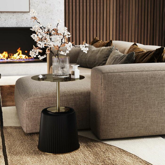 KARE stolik ENDLESS VEGAS 40 czarny. Stolik Endless Vegas to stylowy element każdego nowoczesnego wnętrza, który przyciąga uwagę swoim unikatowym designem. Okrągły blat wykonany z satynowanej stali w złotym kolorze nadaje elegancji i wyrafinowania. Rama, również w złotym wykończeniu, harmonizuje z czarną podstawą, tworząc interesujący kontrast faktur. Mebel, wykonany ręcznie z wysokiej jakości metalu, zapewnia nie tylko estetyczny wygląd, ale również trwałość i stabilność. Dzięki swoim kompaktowym rozmiarom, stolik sprawdzi się zarówno jako element dekoracyjny w salonie, jak i funkcjonalny dodatek w sypialni. Jego efektowny styl i wyjątkowe wykonanie doskonale wpisują się w eleganckie i nowoczesne aranżacje wnętrz. Wymiary: wys. 55 cm / szer. 40 cm / gł. 40 cm Blat: śr. 40 cm Waga brutto: 6,2 kg.Cechy produktu