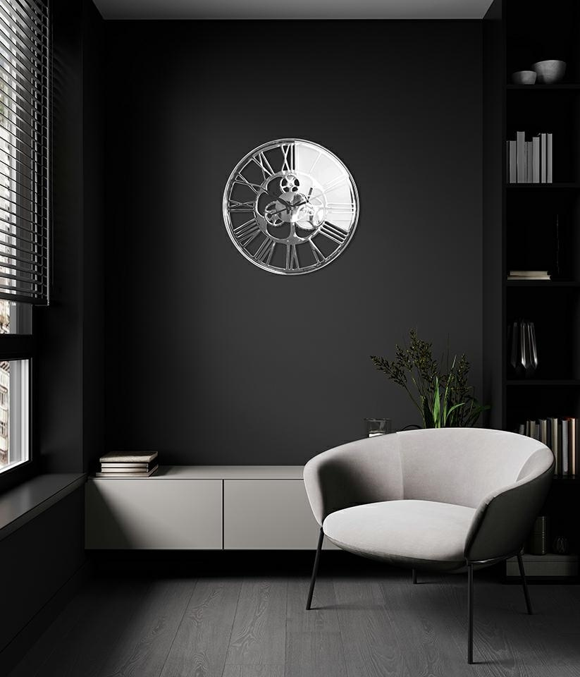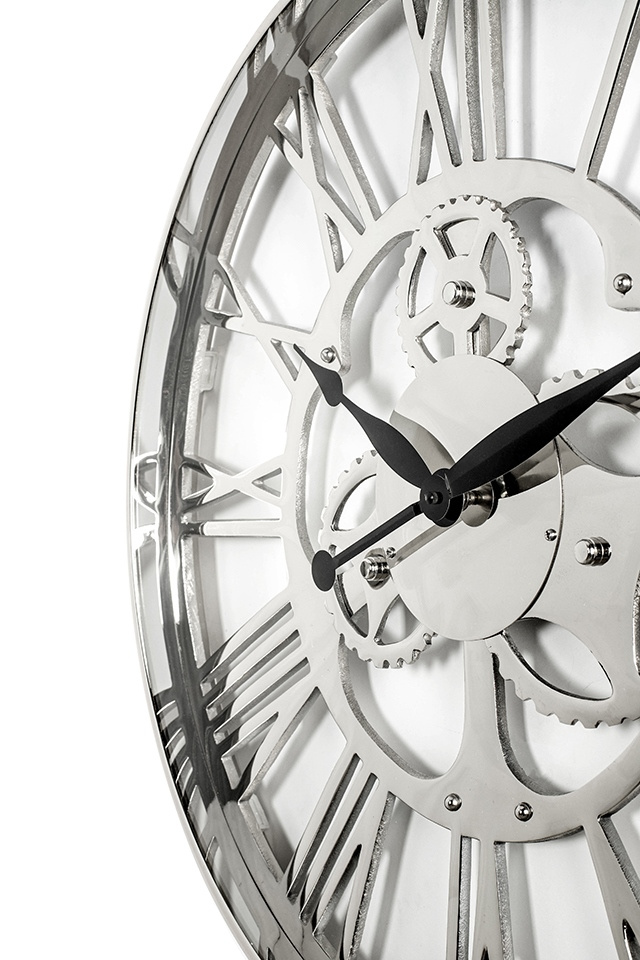 - KARE zegar GEAR 60 srebrny. Stylowy antyczny styl połączono ze współczesną estetyką. Okrągłą tarczę wykonano ze stali nierdzewnej i aluminium niklowanego i wykończono w błyszczącym chromie. Czas wskazują cyfry rzymskie, ukazując przy tym mechanizm zegaru.