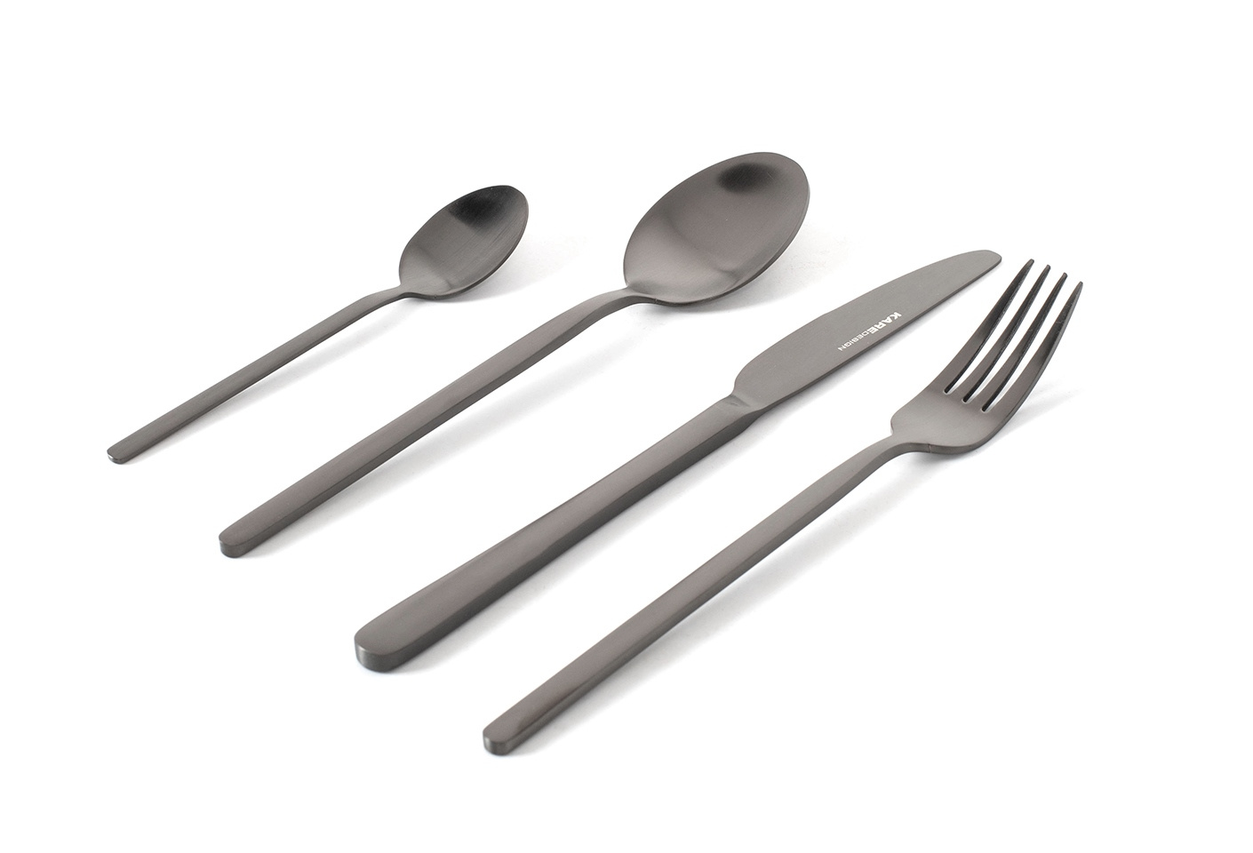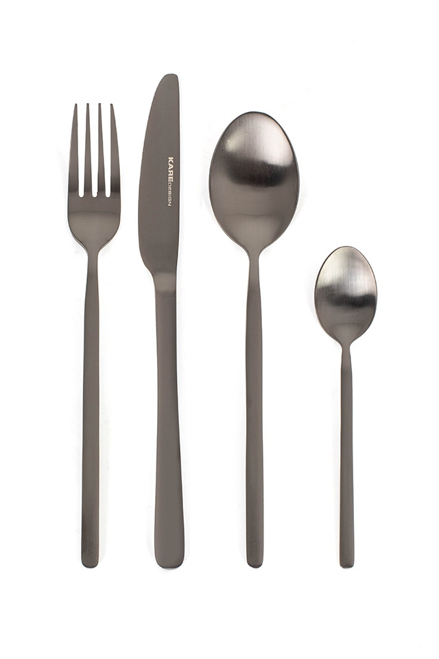 • KARE zestaw sztućców GLORIA MATT BLACK. Nowoczesne, stylowe sztućce wykończone w eleganckim, matowo-czarnym kolorze. Całość wykonano ze stali nierdzewnej pokrytej tytanem. Zestaw składa się z: 4 widelców, noży, łyżek i łyżeczek. Gloria Matt Black z całą p