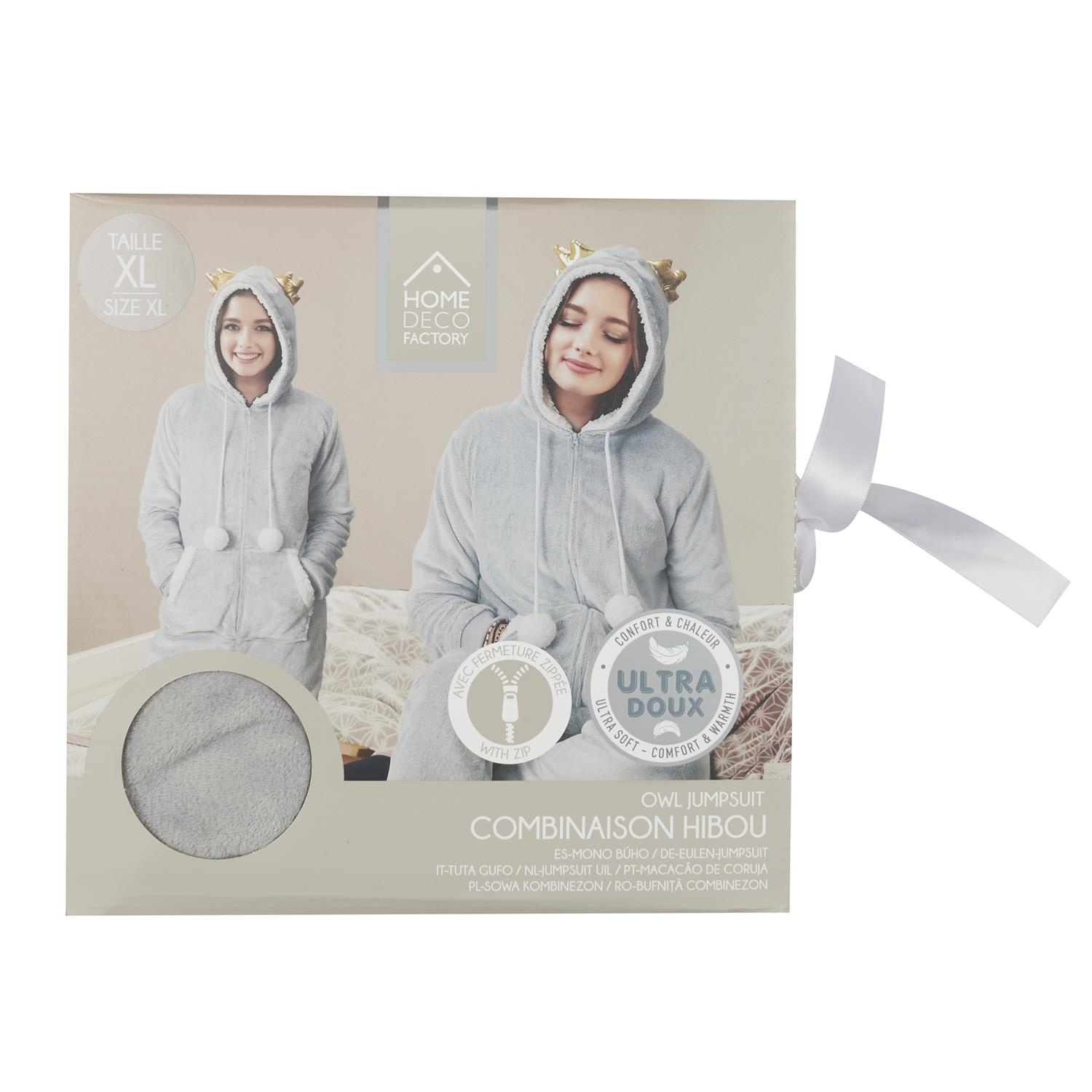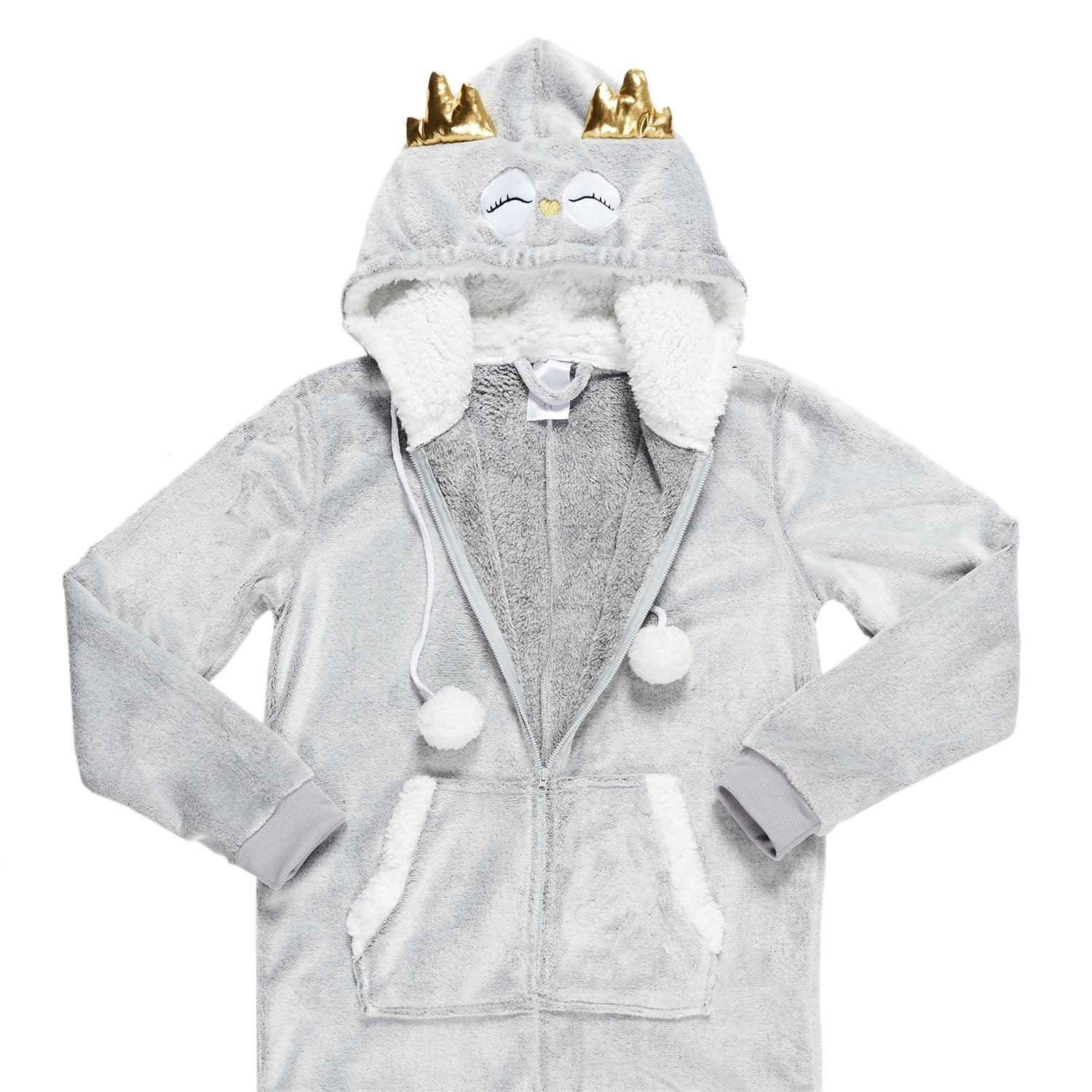 Kombinezon Onesie Sowa to pluszowy kombinezon z kapturem, idealny na zimowe wieczory lub relaks w domu. Jest wykonany z miękkiego, szarego materiału, który zapewnia ciepło i wygodę. Kombinezon ma długie rękawy oraz nogawki, a także praktyczny zamek błyskawiczny na całej długości, co ułatwia zakładanie. Kaptur ozdobiony jest zabawnymi, uroczymi detalami: wyhaftowaną twarzą oraz złotymi uszami, które przypominają koronę, nadając kombinezonowi wyjątkowy, fantazyjny charakter. Dwie pomponowe kulki zwisające z kaptura dodają dodatkowego uroku. Produkt posiada również dwie kieszenie wykończone miękkim futerkiem, które idealnie sprawdzą się do ogrzania rąk lub przechowywania drobnych przedmiotów. Długość produktu (cm): 55 Wysokość produktu (cm): 150 Waga produktu (gr): 640 Materiał: PoliesterCechy produktu