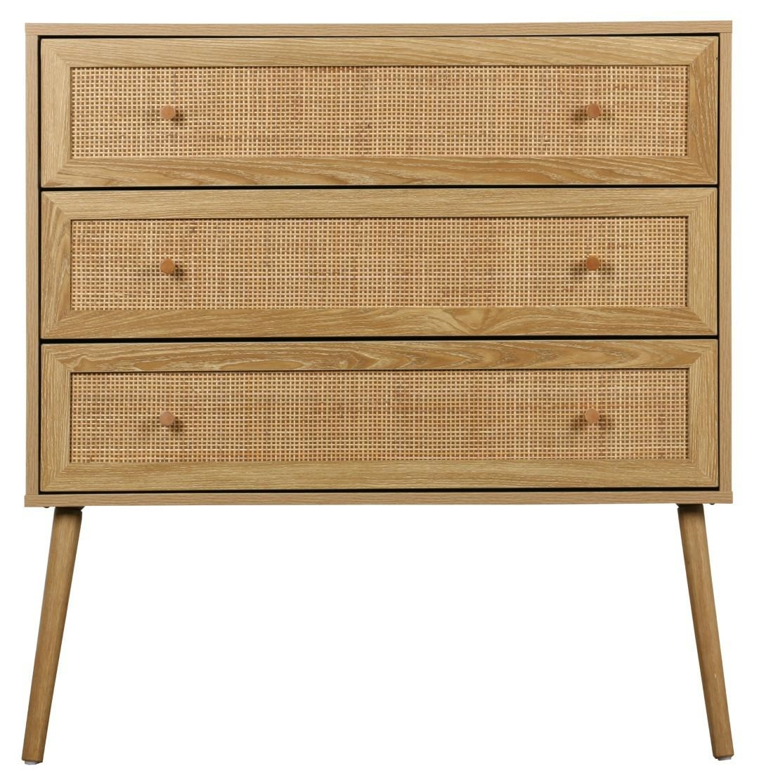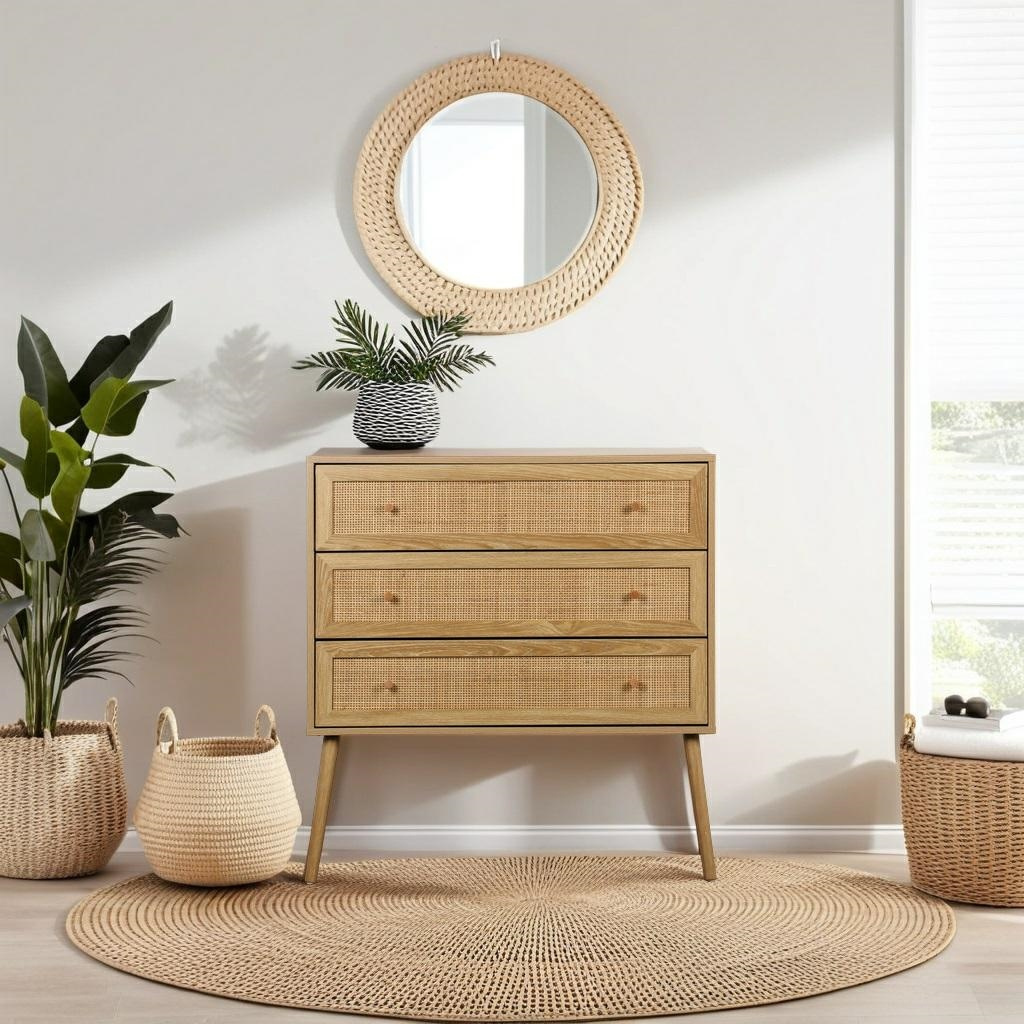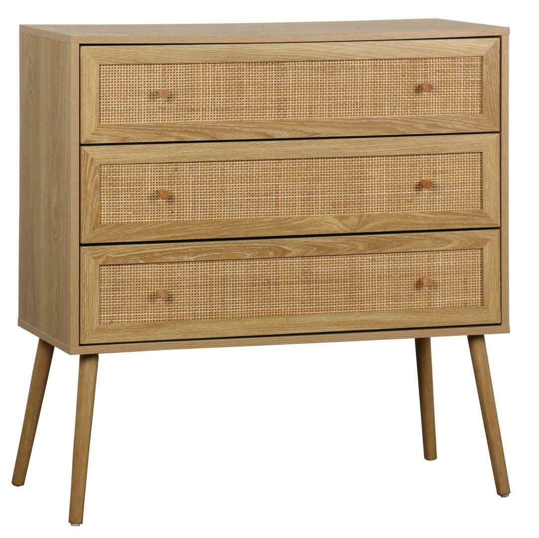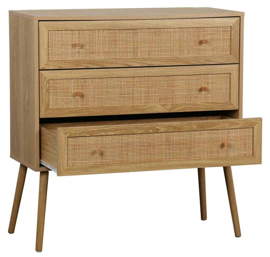 Komoda z 3 szufladami z serii Ballo to nowoczesny mebel w naturalnym stylu boho. Minimalistyczna konstrukcja ozdobiona naturalnymi materiałami jak rattan czy lite drewno sprawdzi się we wnętrzu spójnym z naturalnymi kolorami. Jasna szafka o ciepłym odcieniu drewna idealnie sprawdzi się w beżowym wnętrzu. Materiał korpusu: płyta wiórowa laminowana papierowym laminatem imitującym naturalny kolor dębu. Nogi komody wykonane z litego drewna sosnowego. Rattanowa dekoracja frontów. Szuflady komody otwierają się dzięki metalowym kulkowym prowadnicą. Wymaga montażu. Maksymalne obciążenie mebla 50 kg. Wymiary kartonu: 45x23x97cmCechy produktu