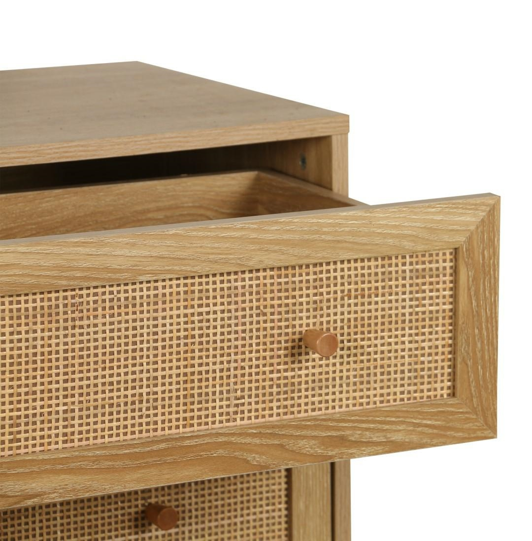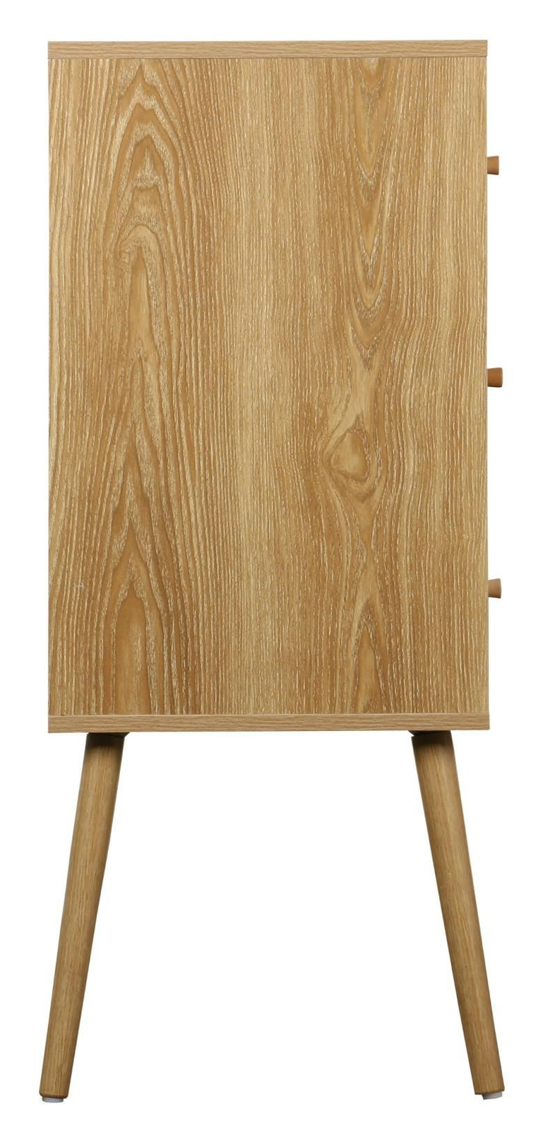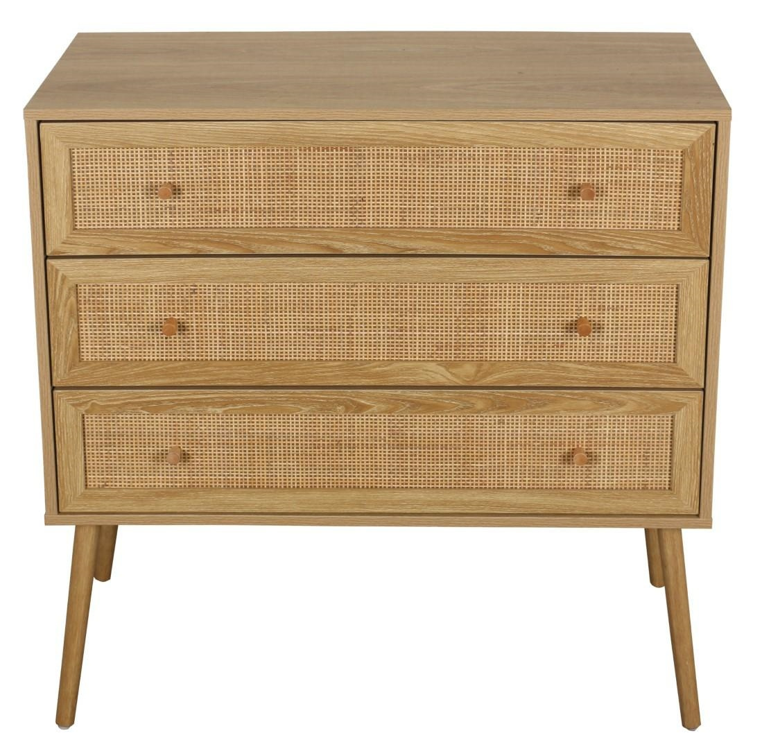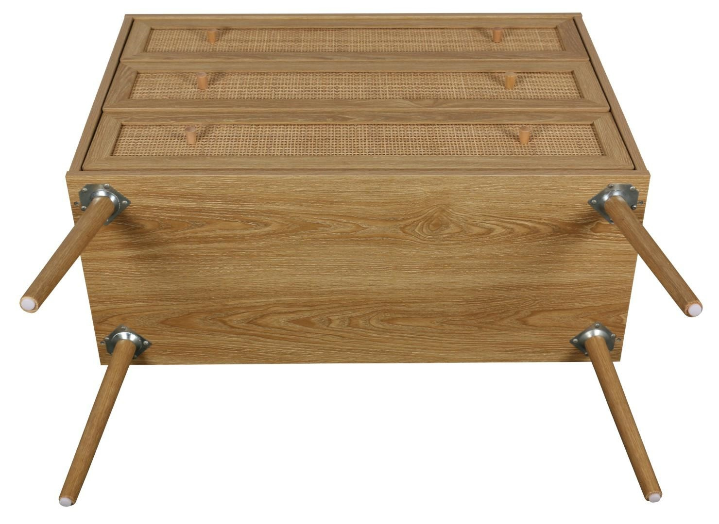 Komoda z 3 szufladami z serii Ballo to nowoczesny mebel w naturalnym stylu boho. Minimalistyczna konstrukcja ozdobiona naturalnymi materiałami jak rattan czy lite drewno sprawdzi się we wnętrzu spójnym z naturalnymi kolorami. Jasna szafka o ciepłym odcieniu drewna idealnie sprawdzi się w beżowym wnętrzu. Materiał korpusu: płyta wiórowa laminowana papierowym laminatem imitującym naturalny kolor dębu. Nogi komody wykonane z litego drewna sosnowego. Rattanowa dekoracja frontów. Szuflady komody otwierają się dzięki metalowym kulkowym prowadnicą. Wymaga montażu. Maksymalne obciążenie mebla 50 kg. Wymiary kartonu: 45x23x97cmCechy produktu
