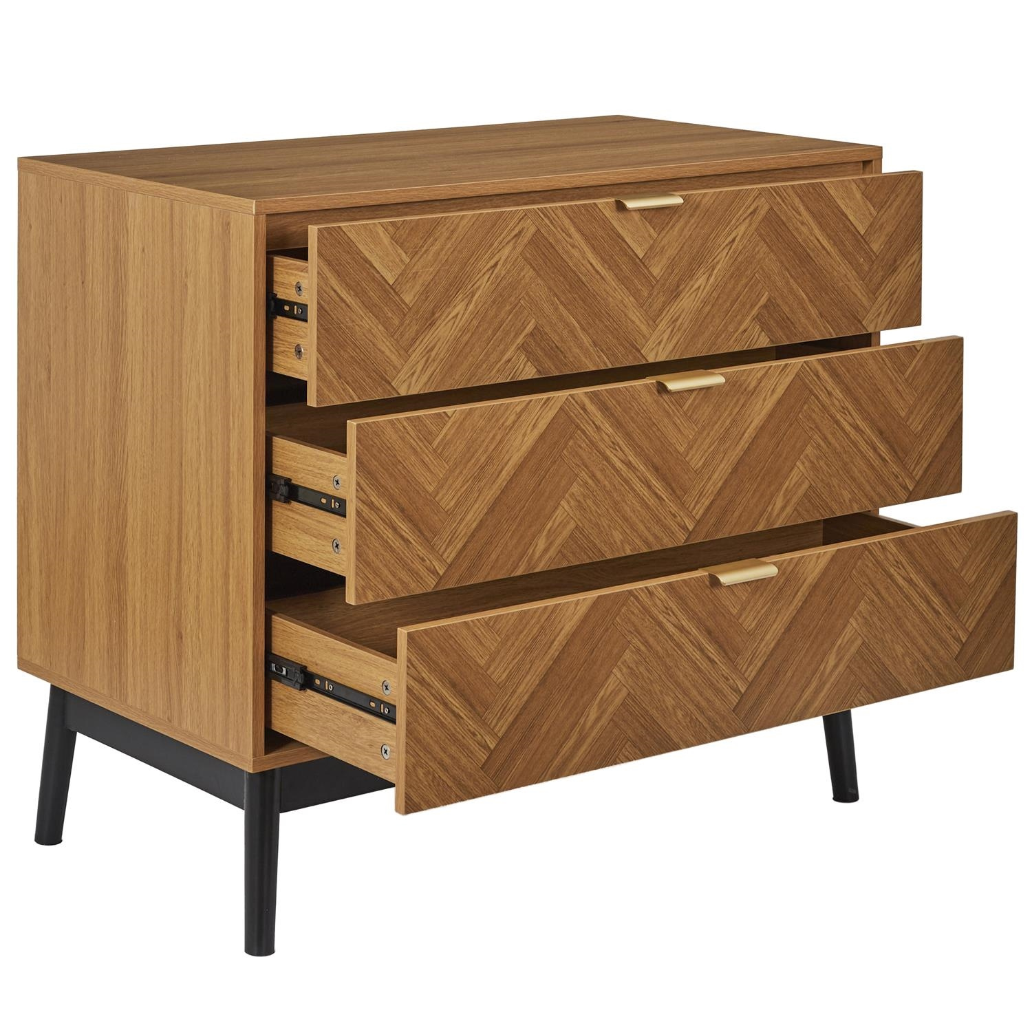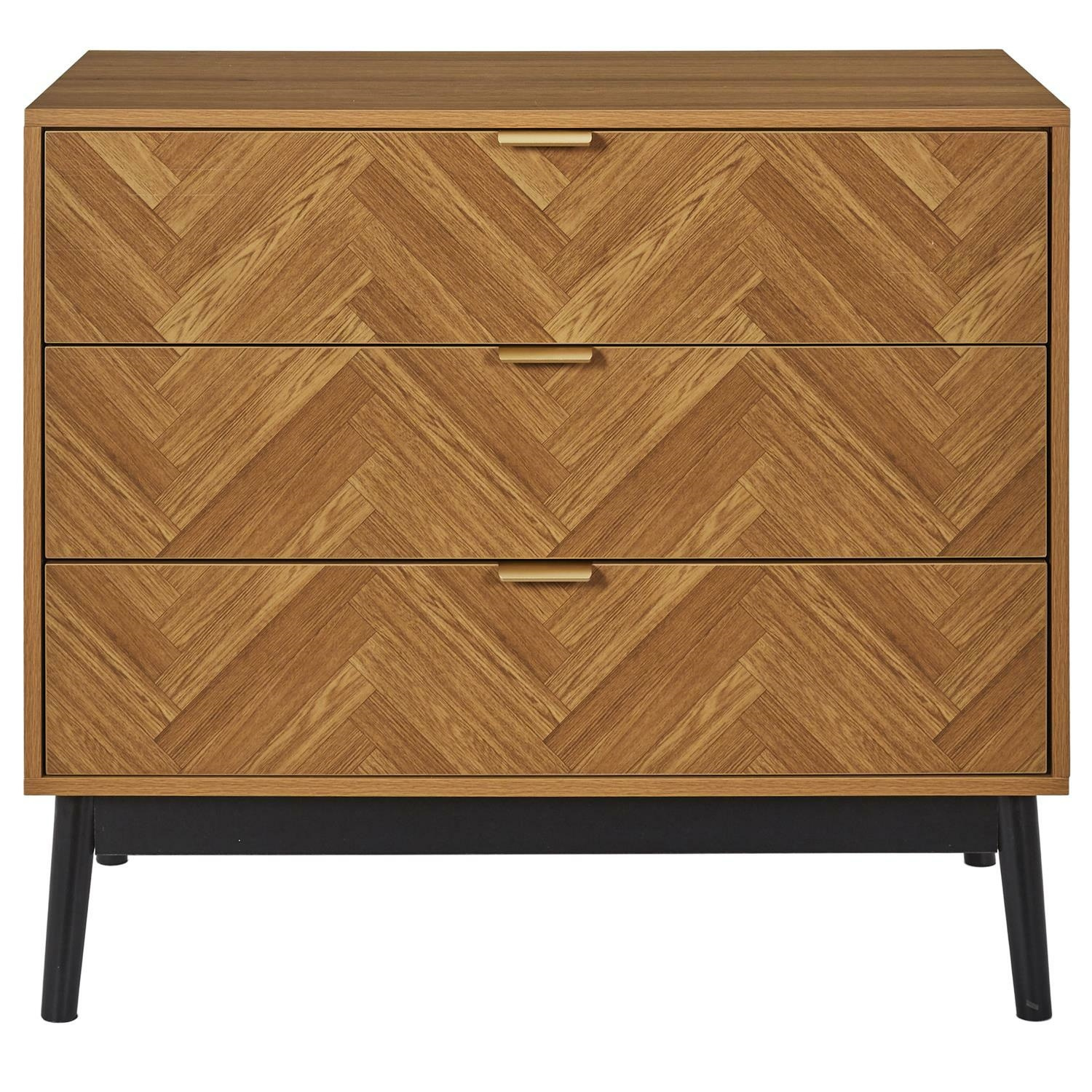 Komoda Felix to połączenie stylu retro z nowoczesnymi rozwiązaniami. Nogi mebla lekko rozchodzące się na zewnątrz nawiązują do stylu skandynawskiego. Komoda to połączenie ciekawych frontów w jodełkę oraz czarnych prostych nóg. Komoda wyposażona jest w 3 szuflady na szynach kulkowych. Uchwyty to polakierowane na złoty kolor metalowe rączki. Konsola wymaga montażu. Waga 33kg Materiał: nogi drewno sosnowe polakierowane na czarno Korpus i fronty: płyta wiórowa ozdobiona okleiną imitującą dąb Max. obciążenie blatu 30kgCechy produktu