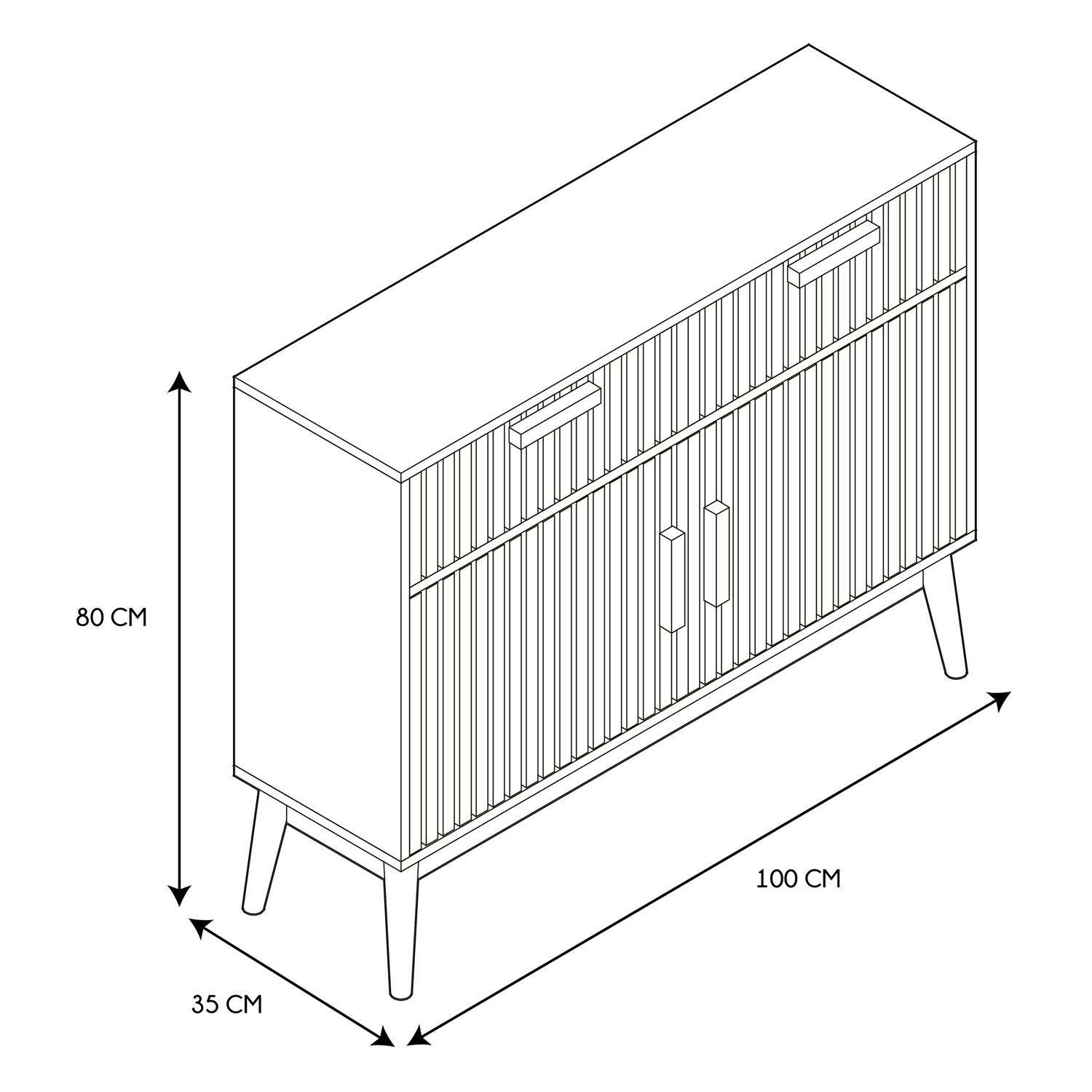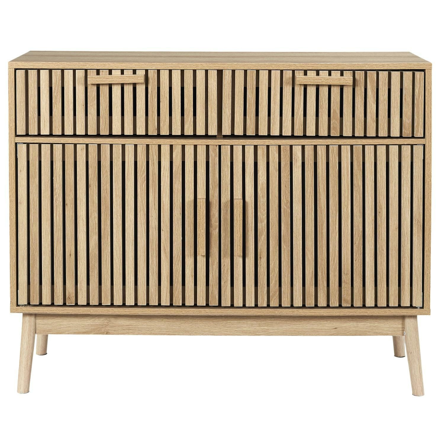 Komoda Klaus to połączenie modnego koloru okleiny imitującej naturalny kolor drewna sosnoweg oraz modnych i klasycznych lameli. Korpus oraz fronty komody wykonane zostały z płyty MDF, natomiast nogi komody z drewna sosnowego. Komoda wyposażona została w dwie szuflady oraz dwa fronty. Komoda wymaga montażu Wymiary kartonu: 46x15,5x106,5cm Waga: 30kg.Cechy produktu