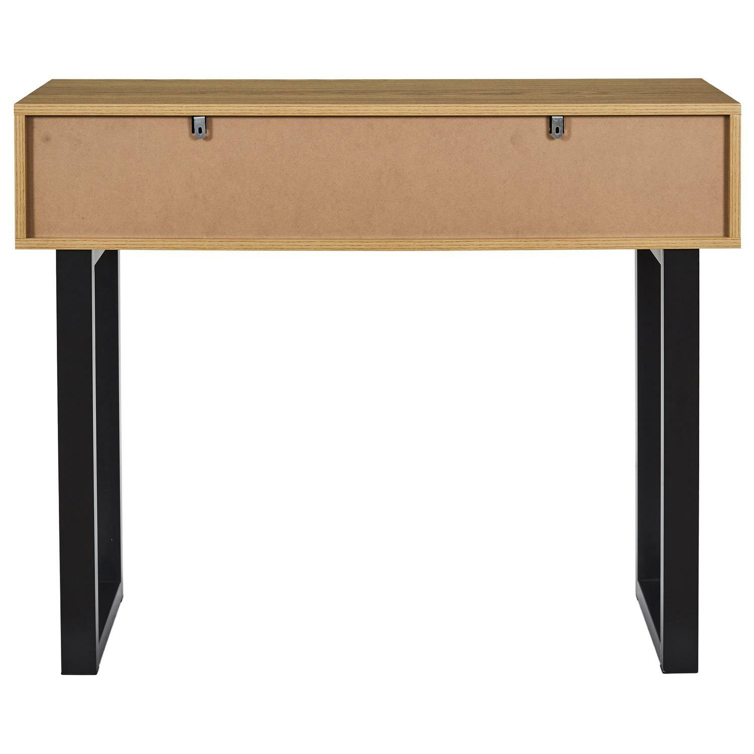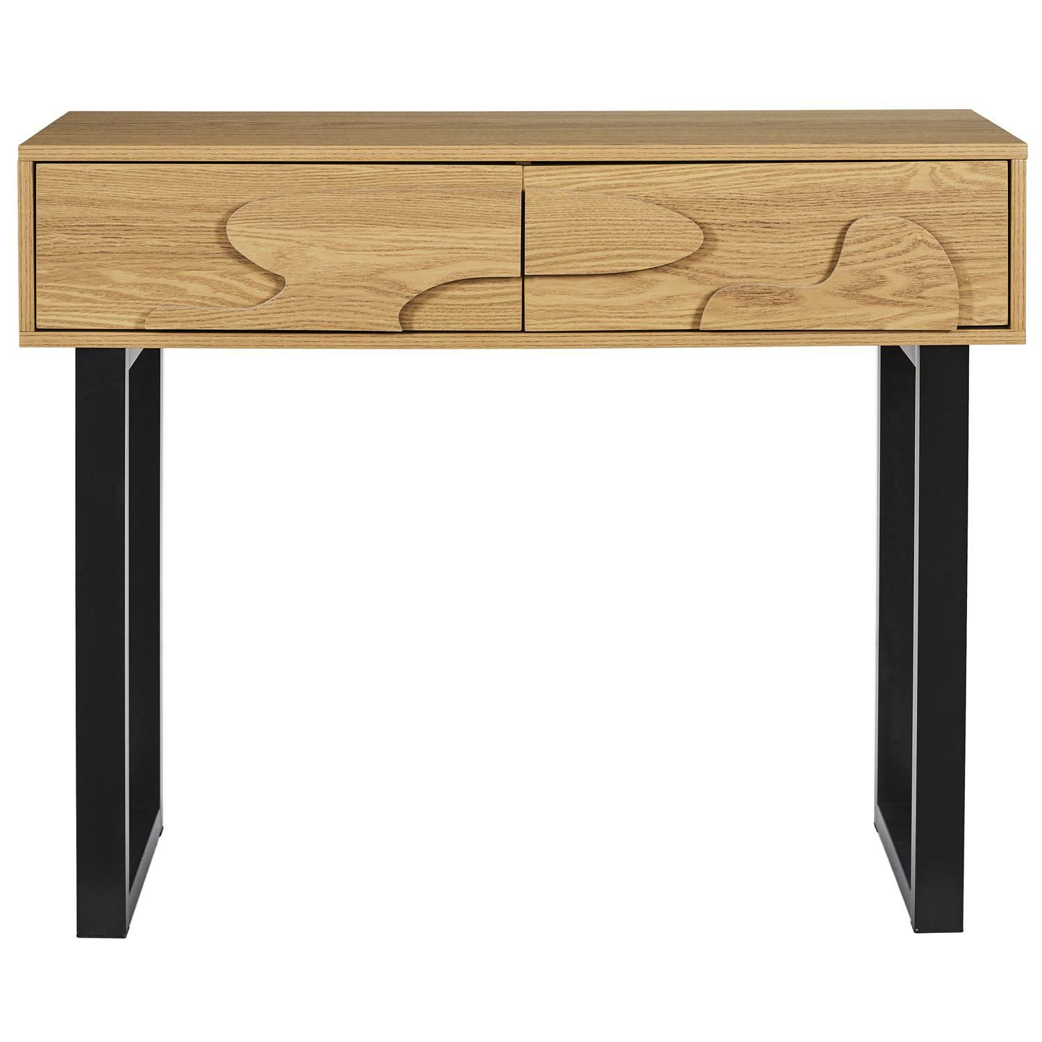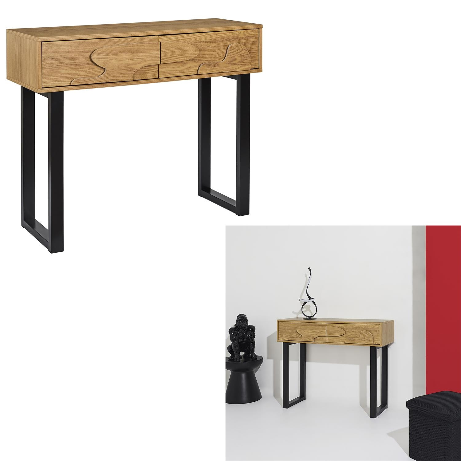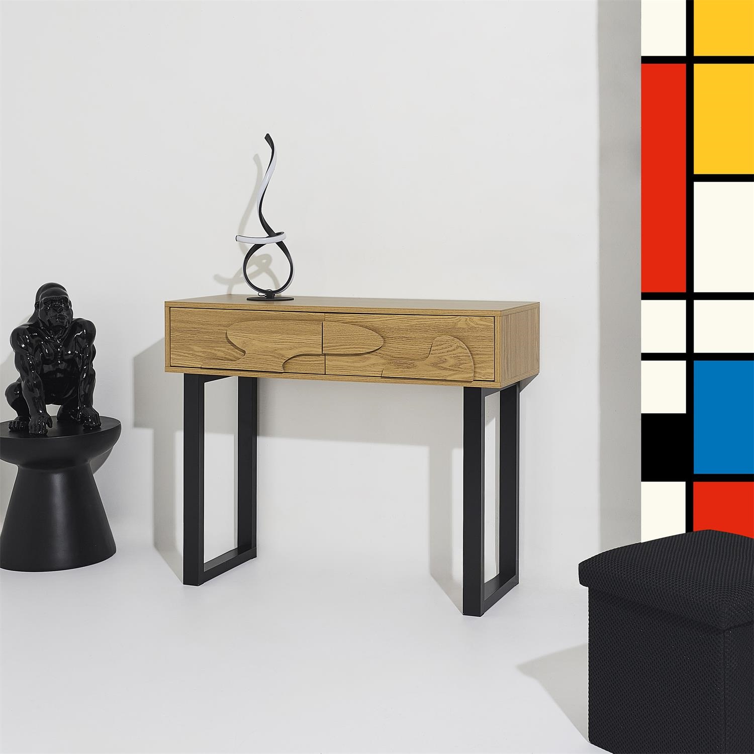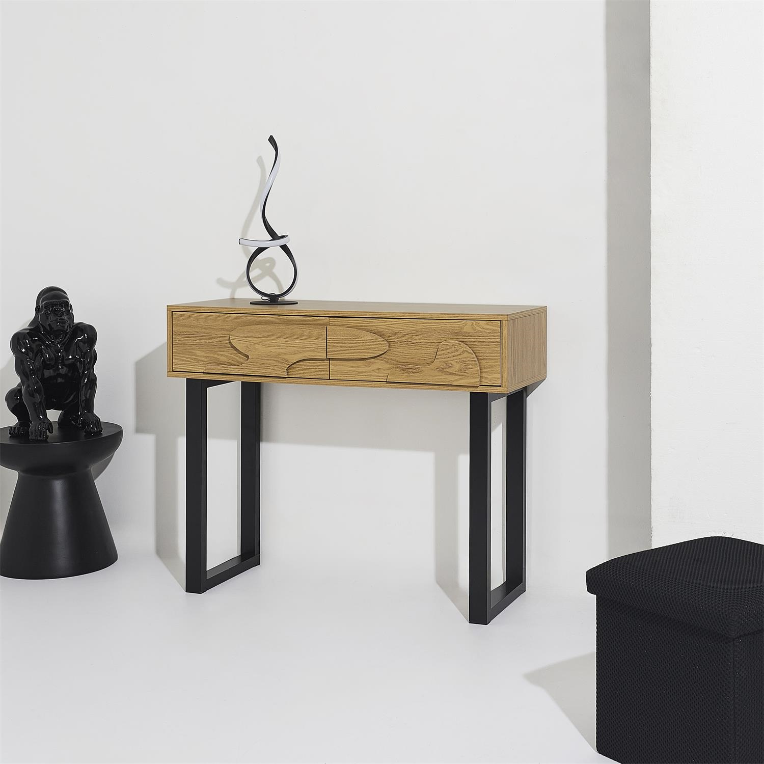Konsola Calypso to idealny mebel do przedpokoju lub salonu w stylu Boho. Konsola Calypso wykonana została z płyty MDF w oklinie imitującej strukturę i kolor dębu. Konsola wyposażona została w dwie szuflady. Pojemne szuflady otwierają się dzięki metalowym, kulkowym prowadnicą. Podstawą konsoli są nogi w kształcie płozy. Nogi wykonane z metalu malowanego proszkowo w kolorze czarnym. Maksymalne obciążeni konsoli 40kg. Konsola wymaga montażu. Waga mebla: 18,3kg. Wymiary kartonu: 107x151x41,2cmCechy produktu