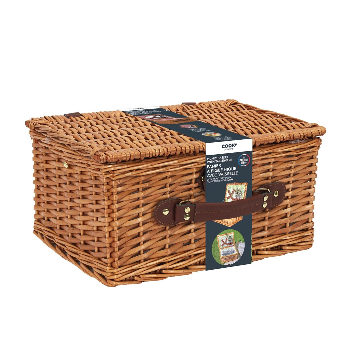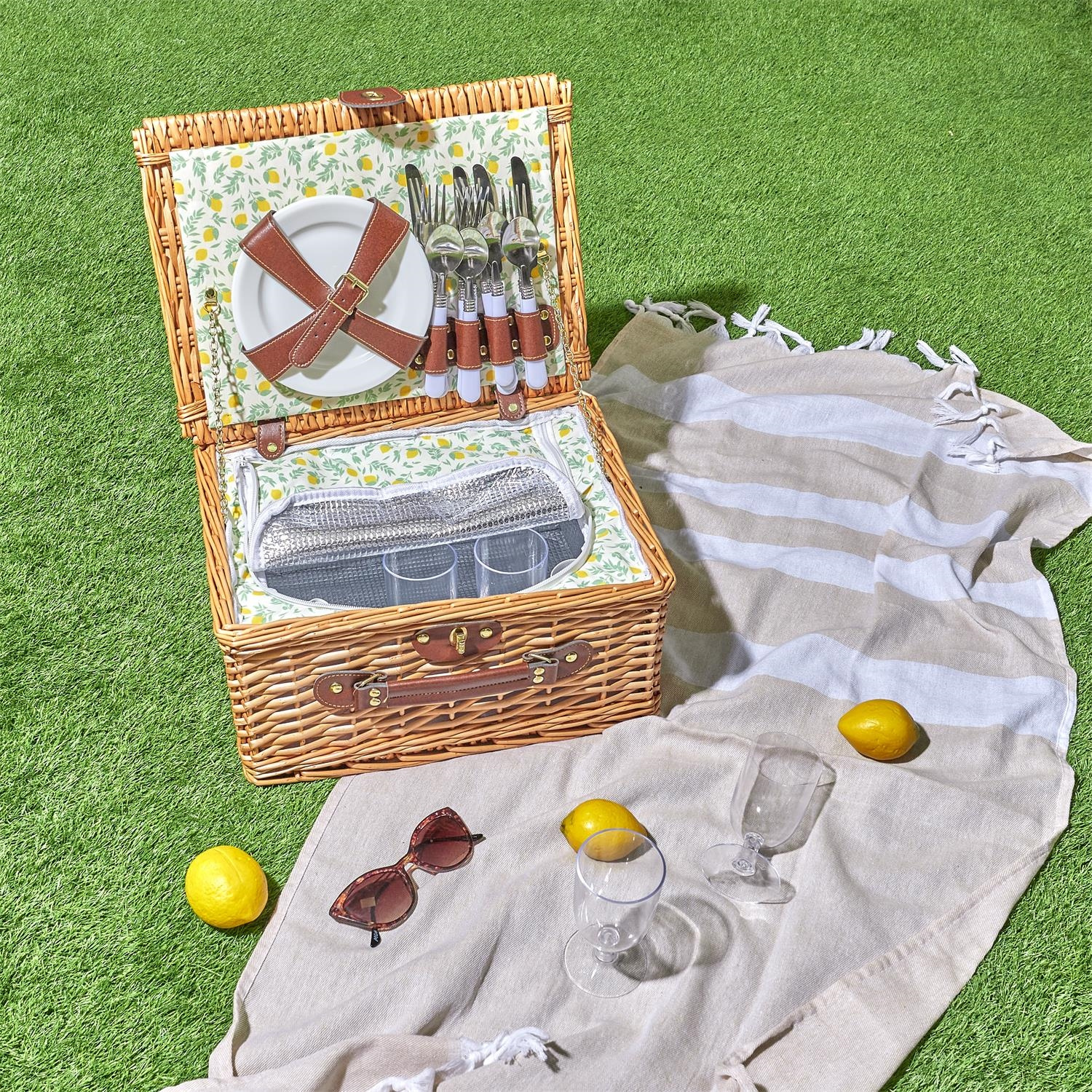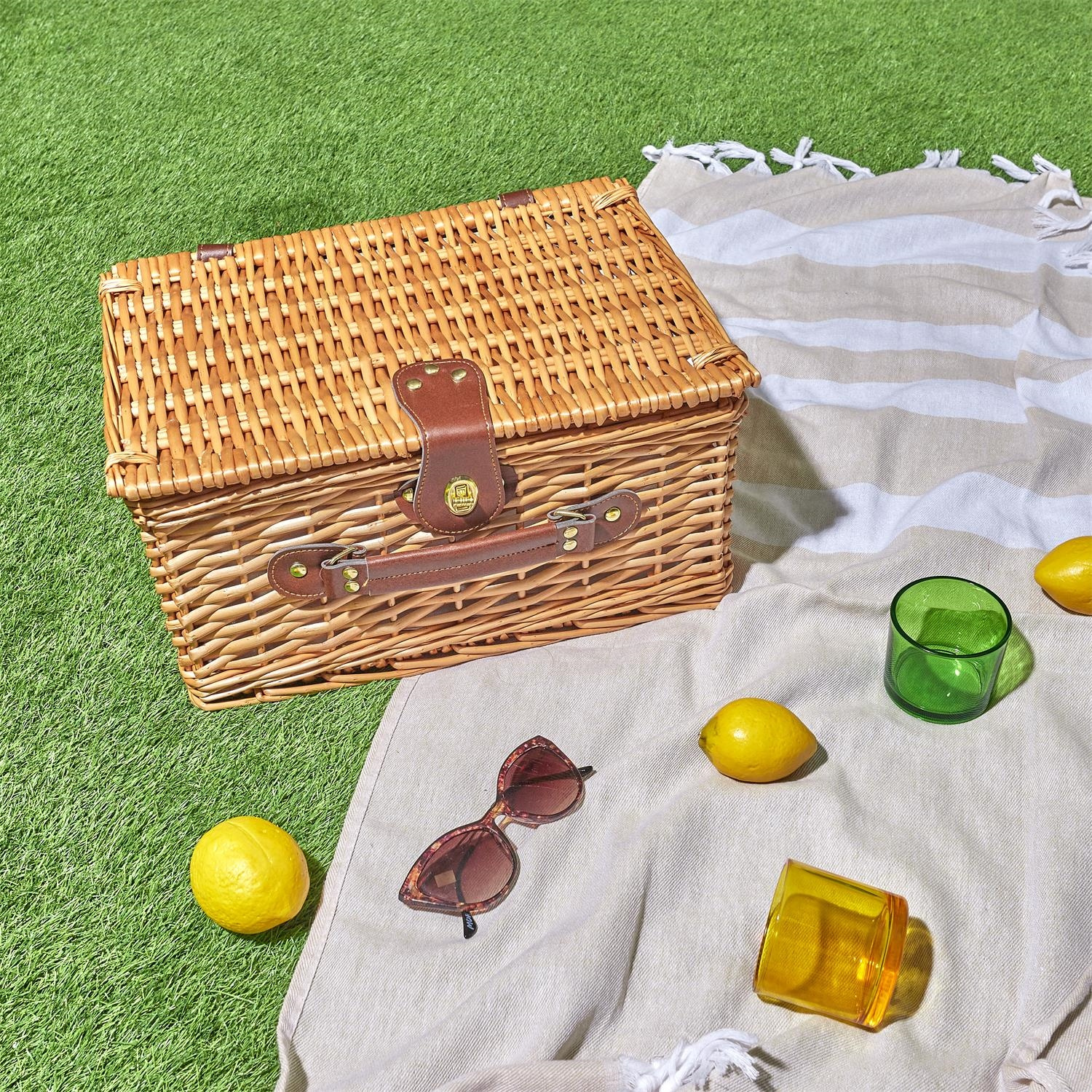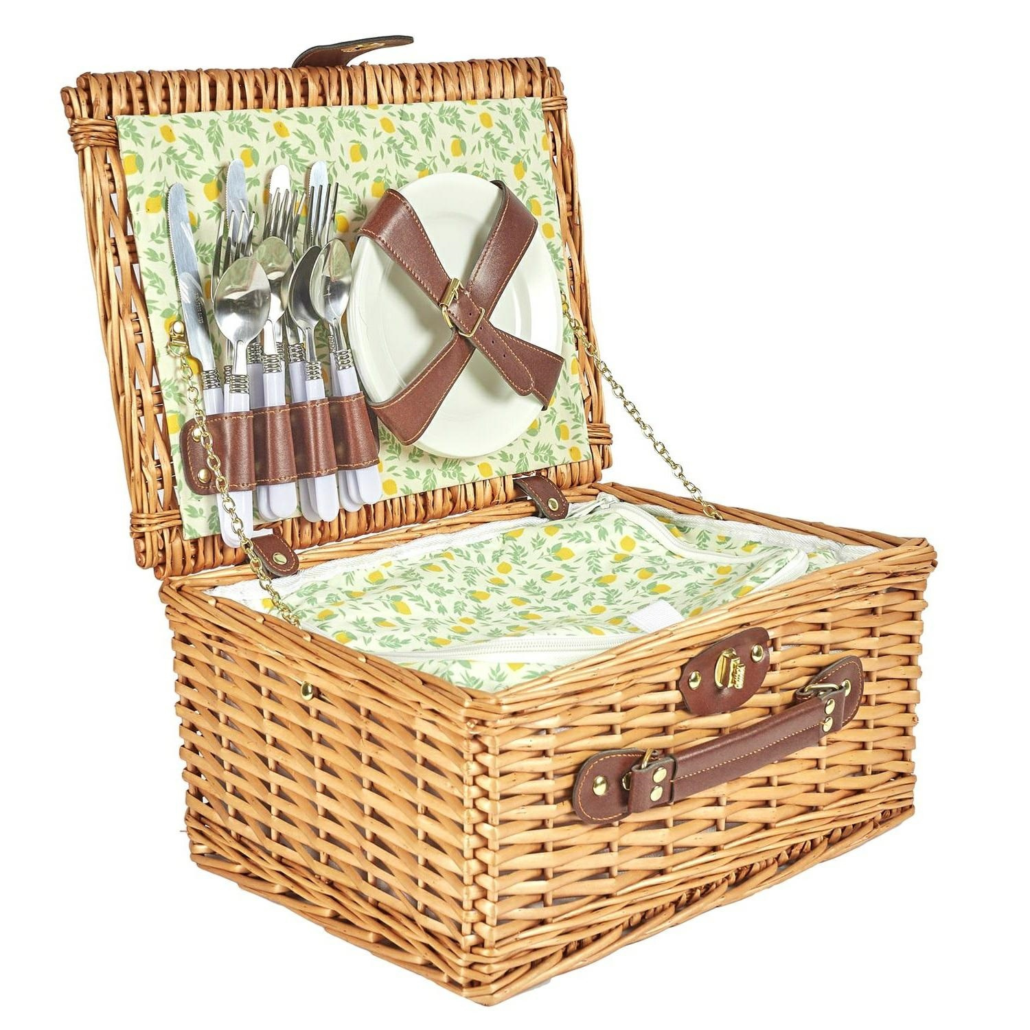 - Kosz piknikowy ze sztućcami i talerzami sprawdzi się podczas niedzielnego wypadu za miasto. Elegancki kosz, wyściełany tkaniną nawiązującą do letnich motywów pozwoli na swobodny posiłek w gronie rodzinnym. Kosz posiada ilość sztućcy i talerzy na 4 osoby.