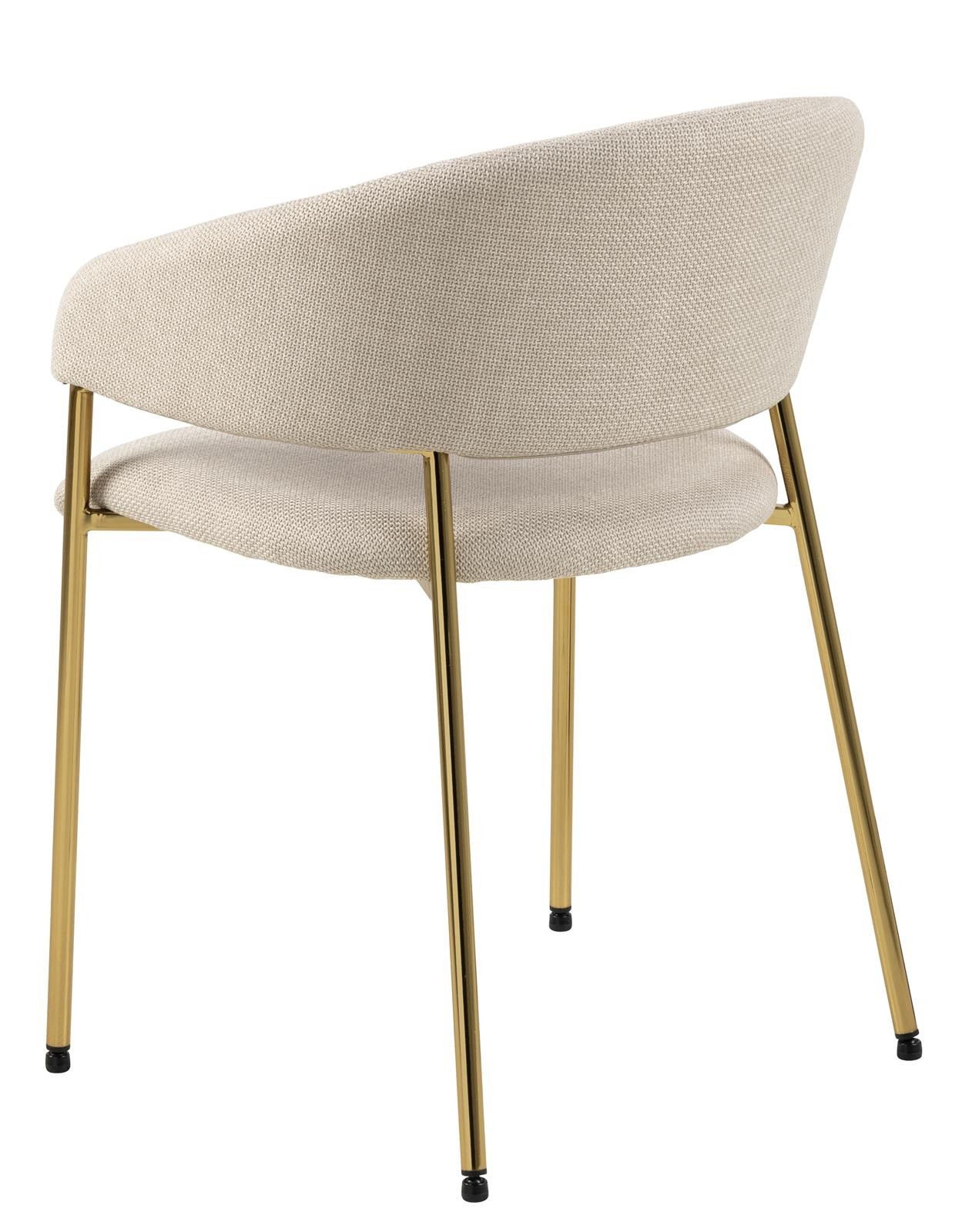 Krzesło Ann to elegancki model w stylu modern glamour. Posiada podstawę złożoną z czterech smukłych nóg wykonanych z metalu w kolorze złotym. U dołu każda z nich zabezpieczona jest nakładką, która zapobiega niszczeniu podłogi. Atutem krzesła są głębokie siedzisko i szerokie oparcie połączone z podłokietnikami. Na tkaninie po wewnętrznej stronie oparcia znajdują się pionowe przeszycia stanowiące prosty, ale wyjątkowo elegancki element dekoracyjny. Tapicerowane elementy krzesła pokryte są pianką tapicerską oraz tkaniną Basel fabric beige 24. Krzesło Ann to opcja idealna do jadalni, bądź eleganCechy produktu